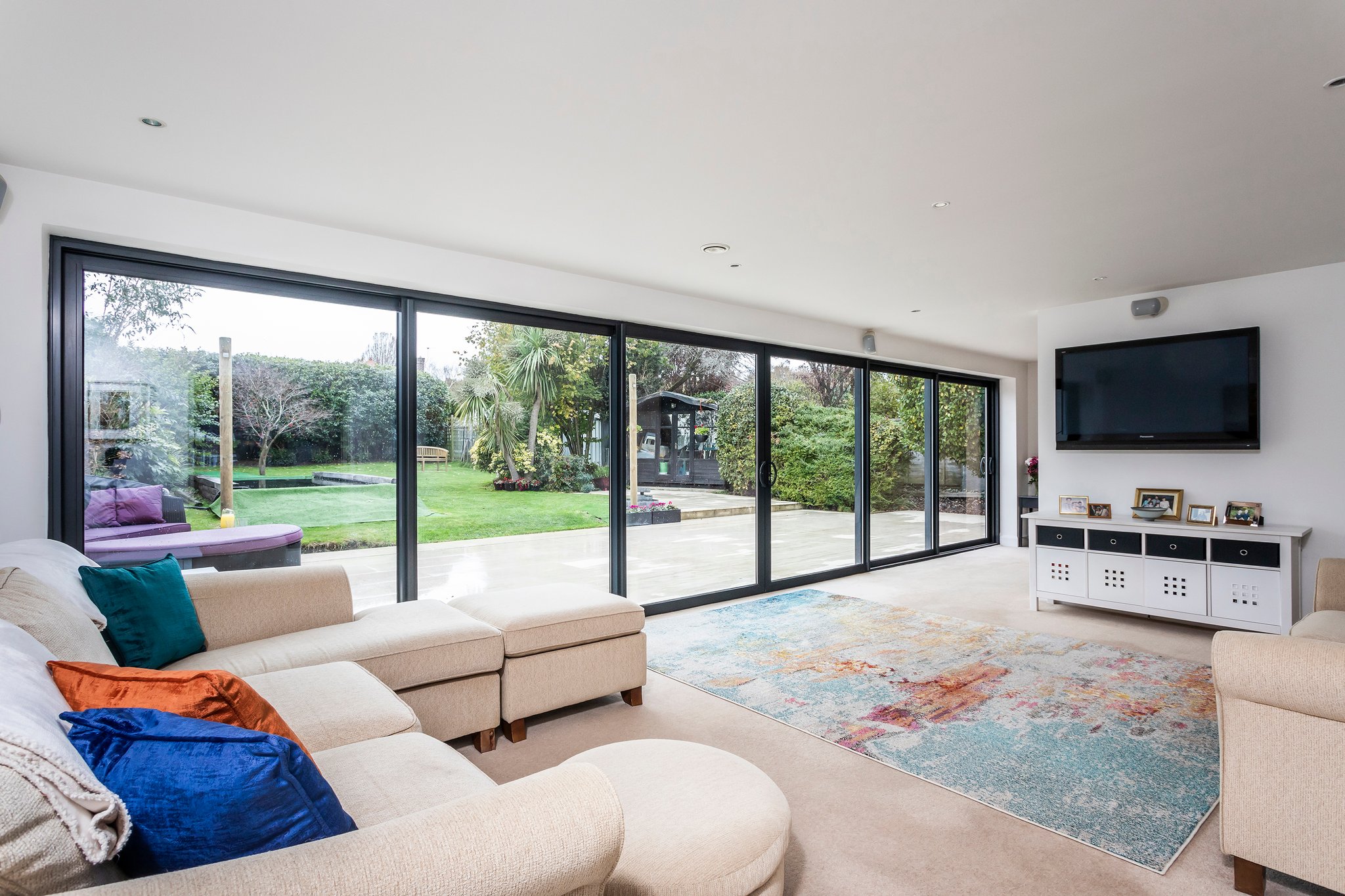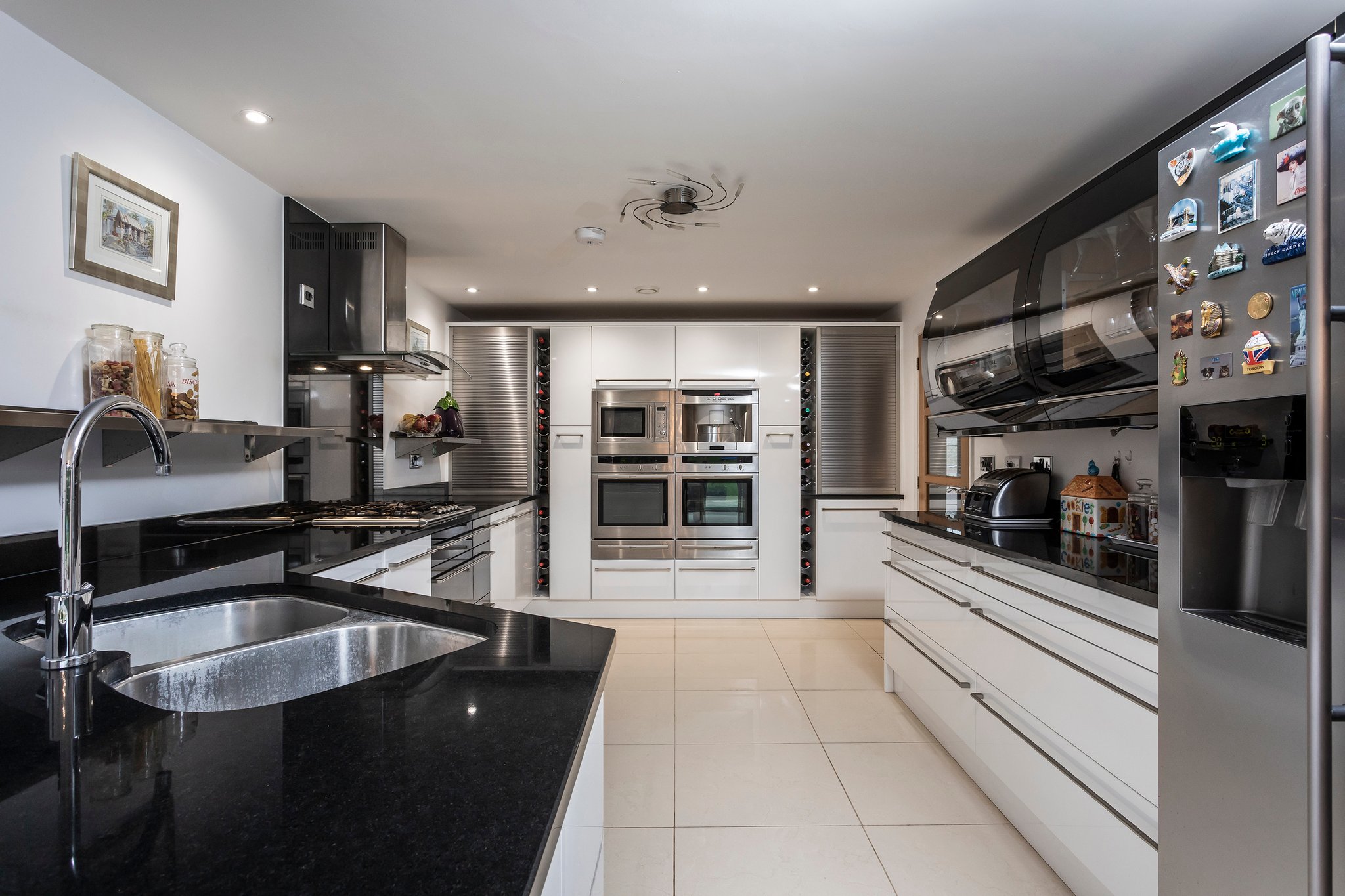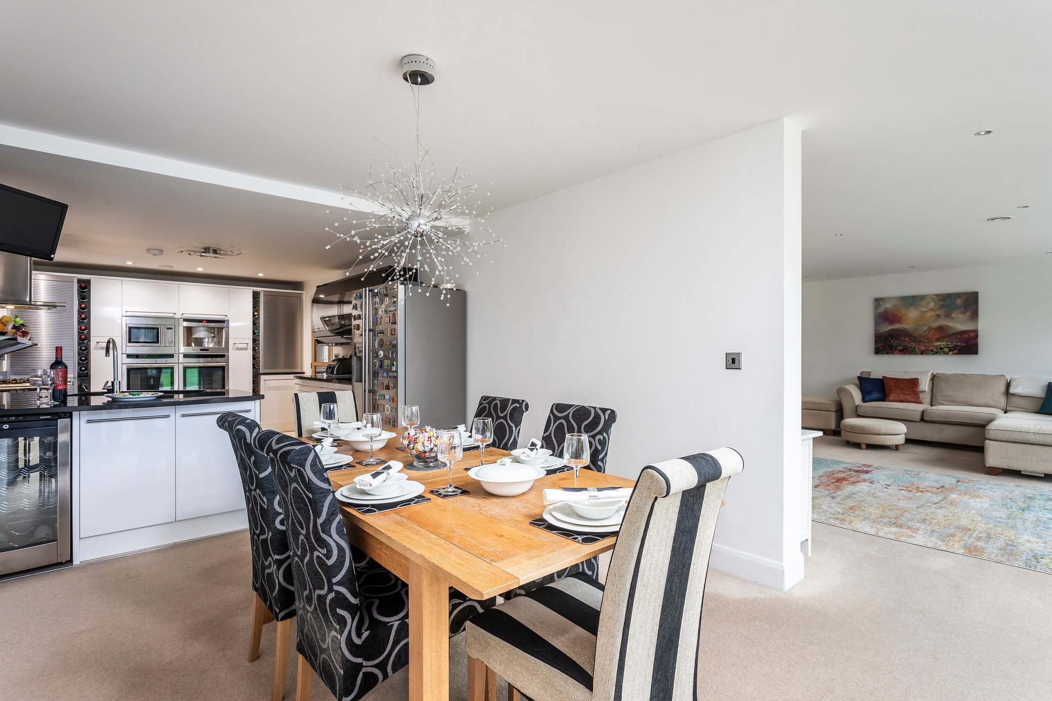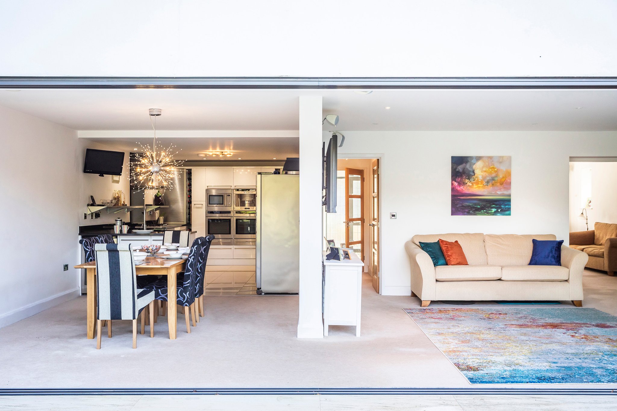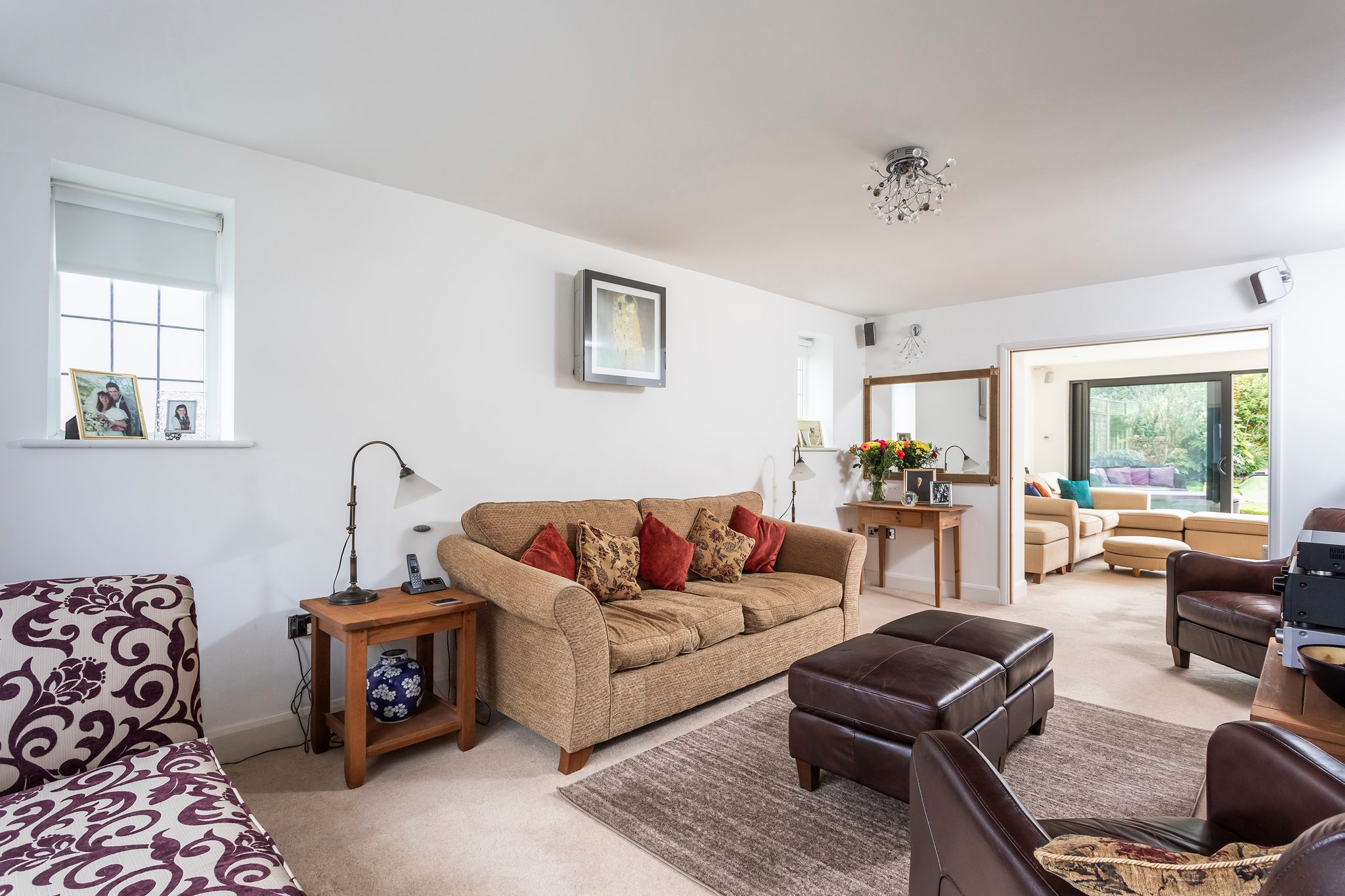Without doubt, the heart of this property is the large open-plan kitchen/dining/family room, providing direct access via powder-coated aluminium sliding doors to the patio and lawned garden and beyond. The bespoke designed kitchen is extensively fitted with high gloss white floor and wall mounted units. There are many high-end integrated appliances and attractive features including: Under counter wine cooler, coffee machine, granite worktops and electric underfloor heating.