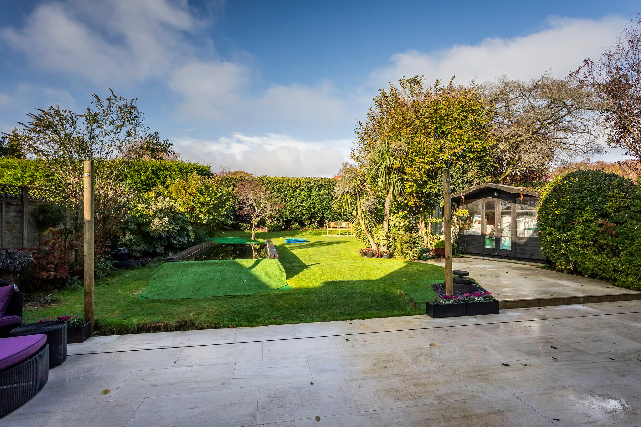 The American oak stair case from the spacious entrance hall leads to the first-floor landing with airing cupboard and doors to all bedrooms. There are four bedrooms, three with en-suite bath/shower rooms, the master with his and hers built-in wardrobes. Also, on this level is a self-contained guest suite with its own double bedroom, en-suite shower room plus a separate lounge/dining room with a corner kitchenette. The garden offers a good degree of seclusion, bound by fencing to all sides and being mainly laid to lawn. There is a fenced off vegetable plot with a green house and water tap. Additional to this is a wooden summer house and metal garden shed.