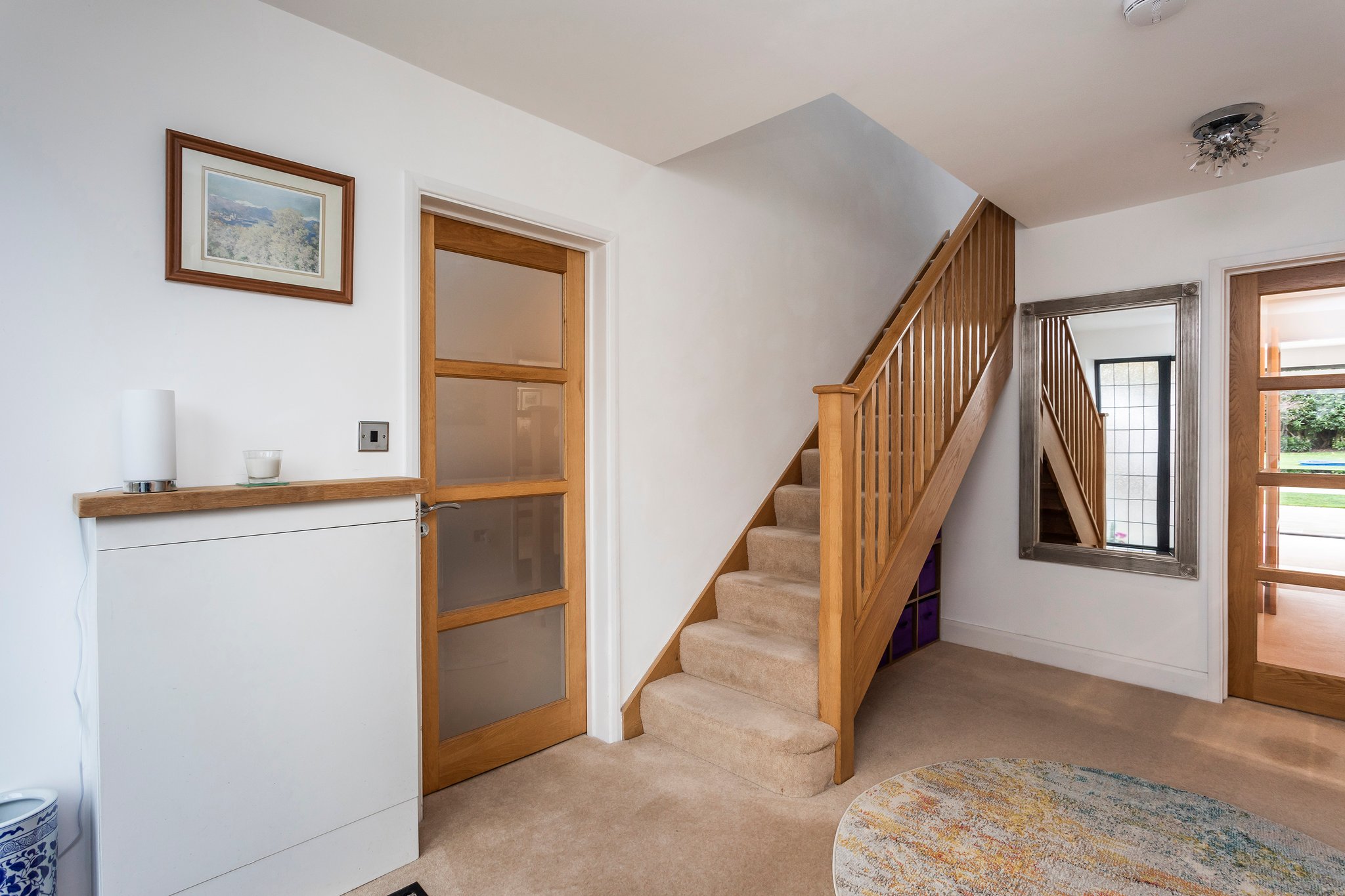 The family area with under floor heating leads via pocket doors to the more formal lounge, both of these rooms are wired for surround sound. Also, on the ground floor is a wet room, and study with an internal door to the garage. This wide tandem garage entered via an electric roll up door offers so much. Firstly, the utility area with a range of storage cupboards, along with a boot room area. To the far end, bi-fold doors open onto the garden, offering an ideal space to create a gym, games room or garden room.