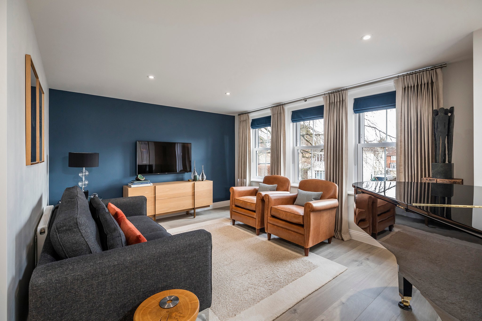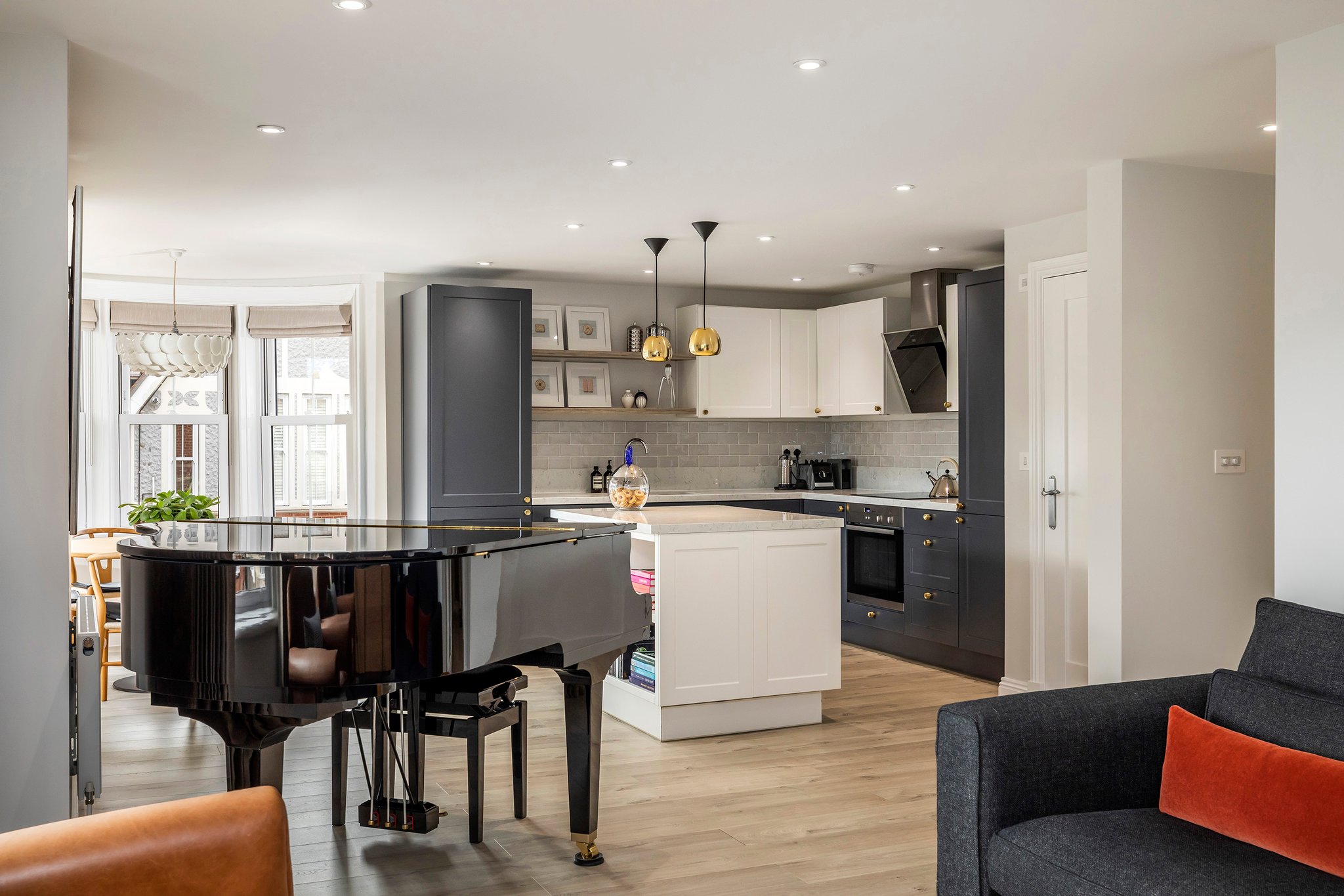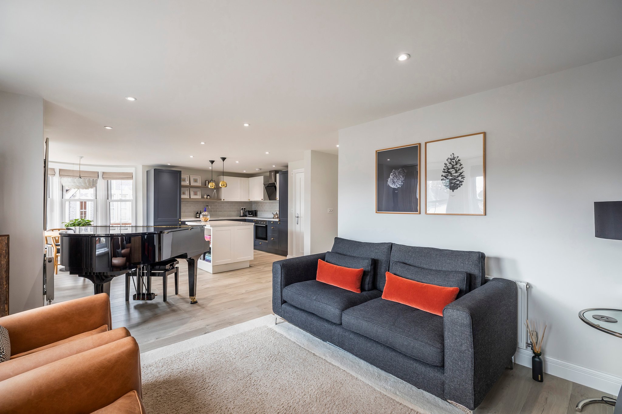 Driftwood is a stunning development of just six apartments and one coach house converted in 2016 by regarded local developers, Juno. This contemporary first floor apartment offers generous accommodation and is beautifully presented throughout. The large open-plan kitchen / living space enjoys a delightful aspect and is flooded with natural light, as is the entire apartment. The modern kitchen boasts a range of integral appliances, island unit with display shelving and is complimented by Quartz worktops. There is an added bonus of the utility cupboard housing the washing machine.  The bay windows create the perfect dining zone and the relaxing lounging area completes this living space. The main bedroom is exceptionally spacious with an extensive range of bespoke designed wardrobes and a luxurious en-suite shower room. The family bathroom serves the other two bedrooms. Additional features include decorative skirting and architraves, zoned lighting to the living area and sensor lighting to both the en-suite and family bathroom. The property also benefits from a well-maintained communal, lawned garden. Behind the electric gate, there is an allocated parking space conveyed with the apartment and a communal bike store.