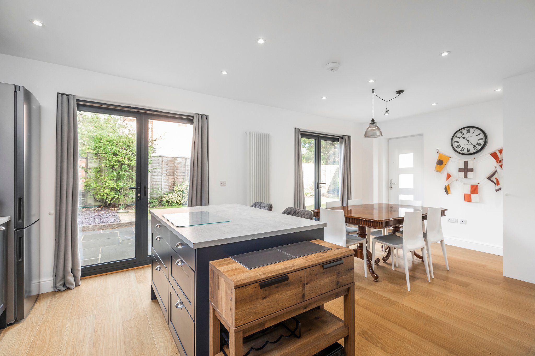 Inside, the light-filled accommodation offers a spacious living room with high ceilings and an enclosed fireplace, and a large open-plan kitchen/dining room with fitted units, a built-in oven, and doors opening onto the garden. Upstairs, the split-level landing leads to three double bedrooms including master bedroom with ensuite, and a fully tiled family bath/shower room. The property features an enclosed charming garden, a garage, and a courtyard-style parking area for three cars.