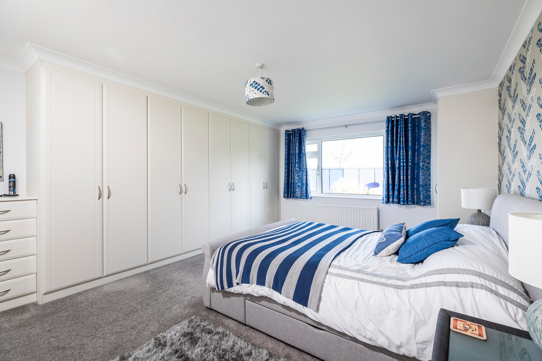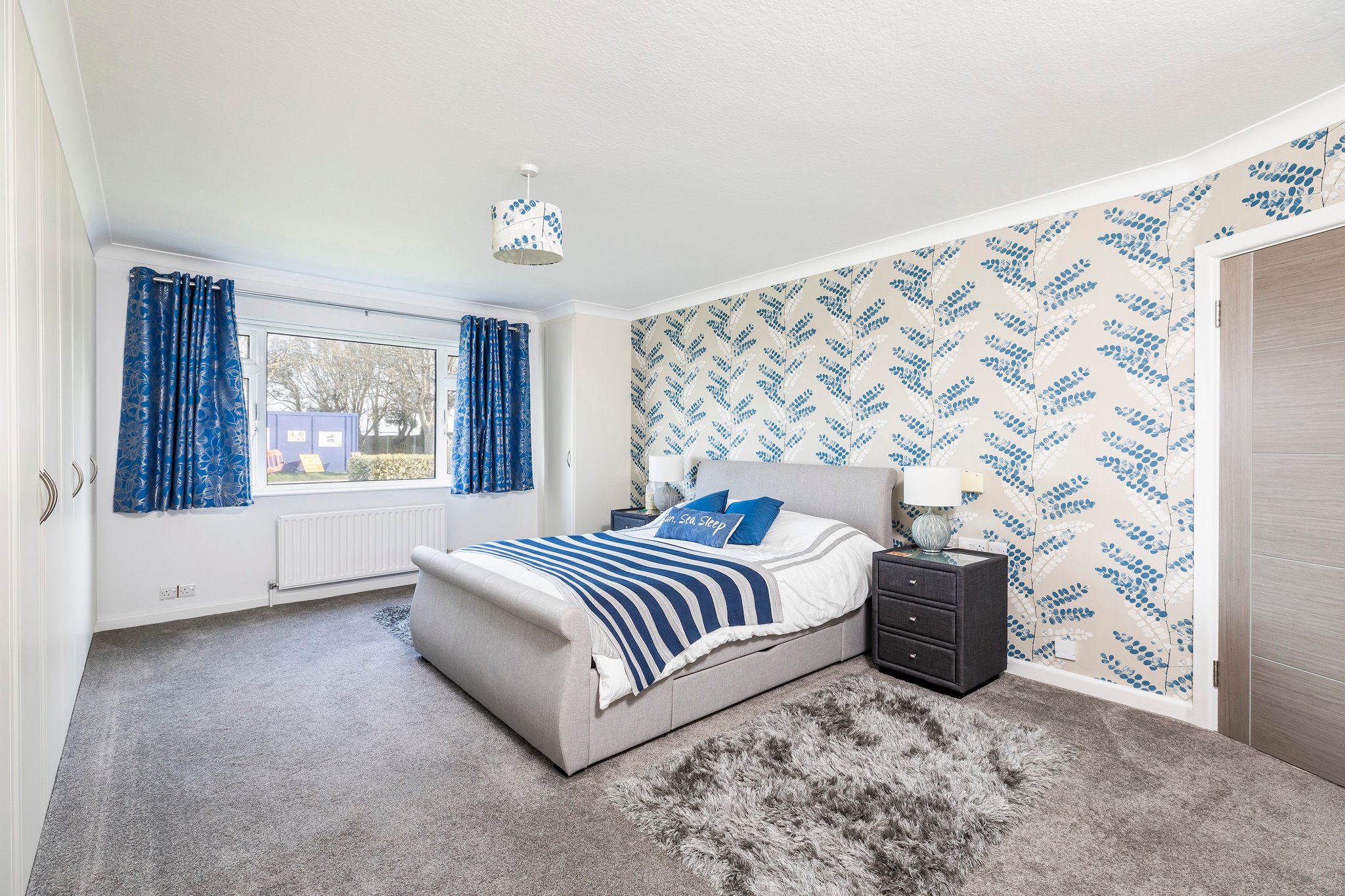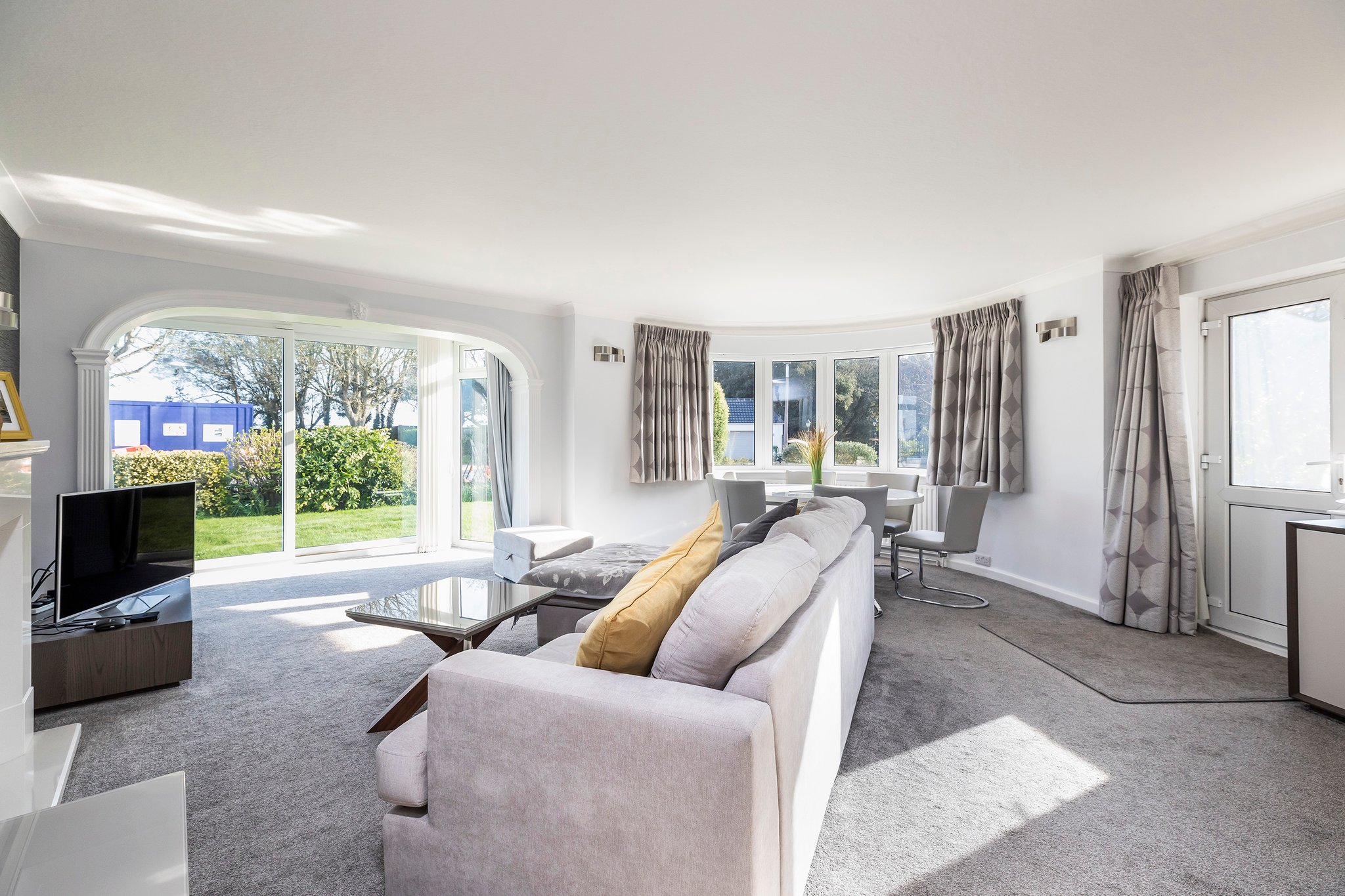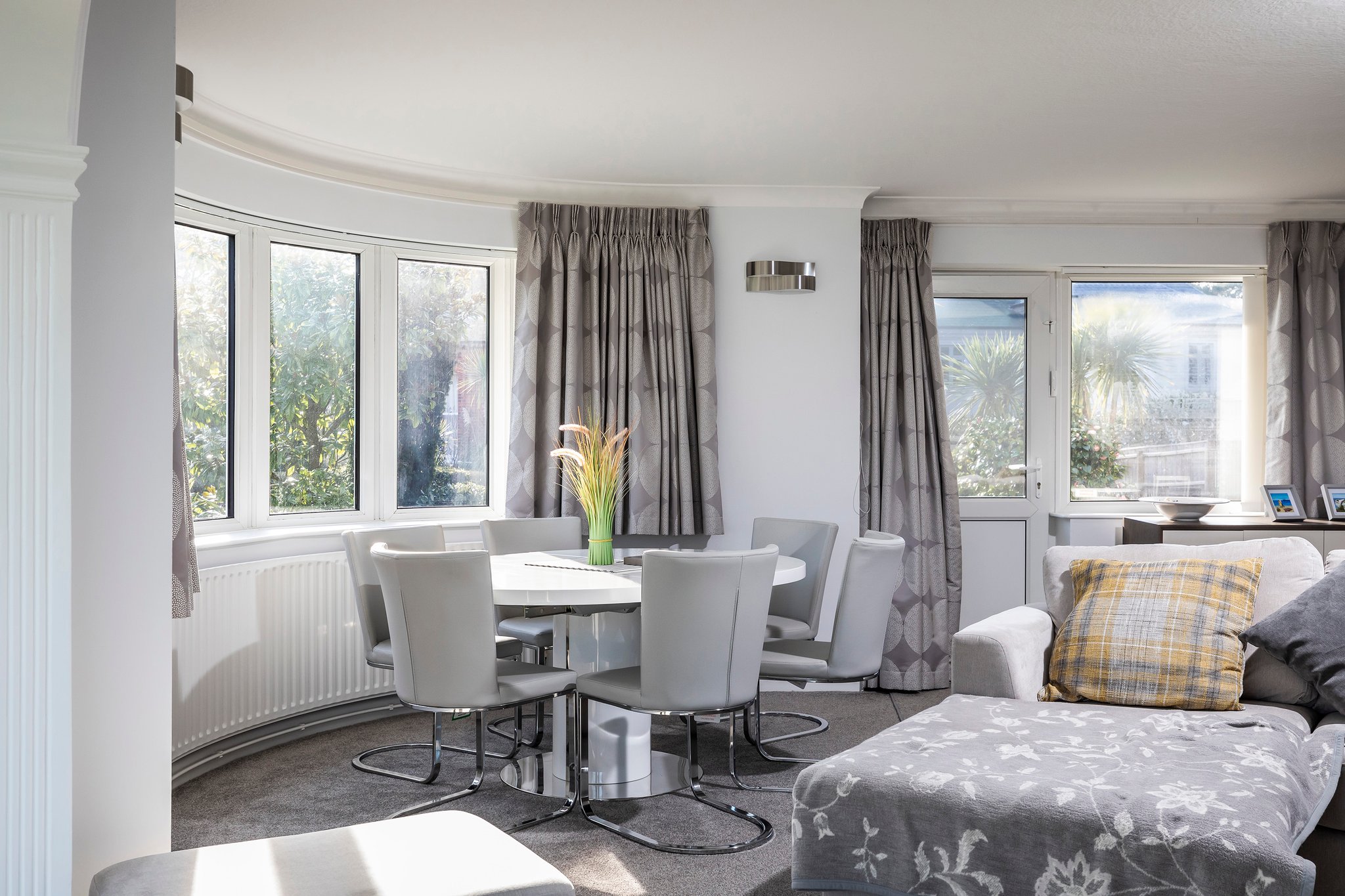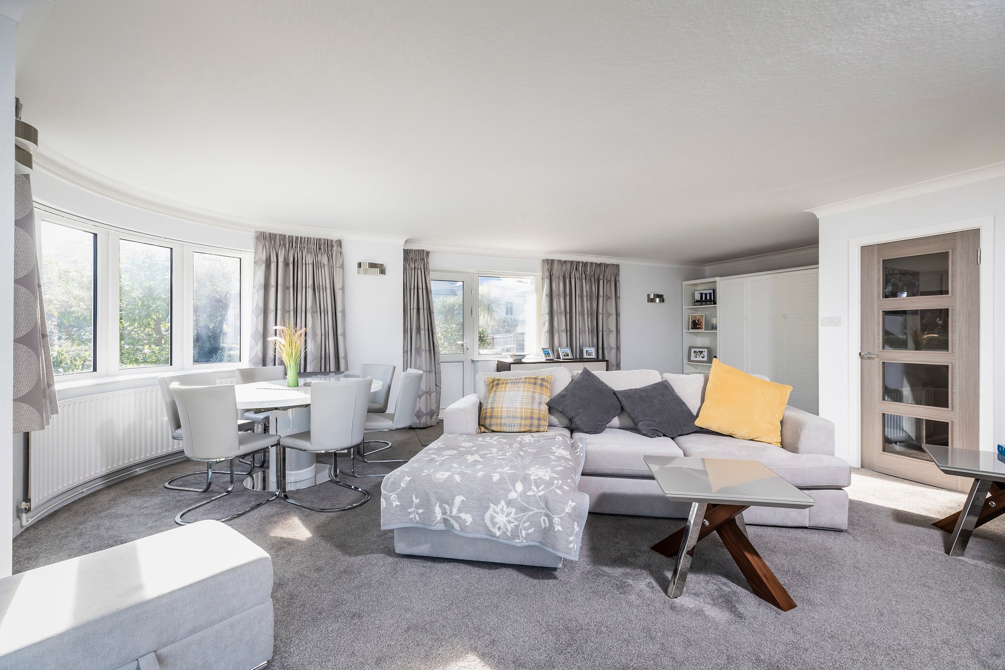The apartment is arguably situated in the best position within this purpose built block. With wrap around south and westerly aspect communal gardens and a private terrace, it makes this the perfect position for enjoying the sun all through the day. Without doubt, the heart of the apartment is the stunning open plan lounge / dining room, providing direct access to the grounds and taking in the sea views. The curved window creates the perfect dining area with a door to the side, providing access to the westerly aspect terrace. There is also an attractive display unit with concealed pull double bed, ideal for additional guests. Also enjoying the sea views is the main bedroom, fitted with an extensive range of bedroom furnishings and fully tiled en-suite shower room. The second bedroom is a generous size and benefits from an en-suite bathroom. The modern kitchen has a range of high gloss floor and wall fitted units with integrated Bosch appliances and breakfast bar. There is scope for the kitchen to be relocated into the rear of the lounge and a 3rd bedroom created, which mirrors the layout of other apartments in the block. Adjacent to the kitchen is a convenient separate utility room. The accommodation benefits from entry phone system, ample storage cupboards, double glazing and gas fired central heating.