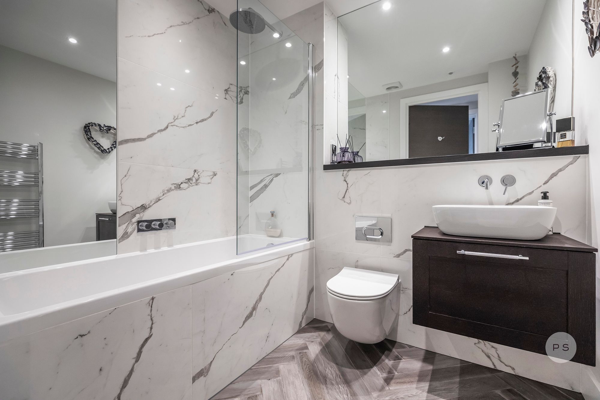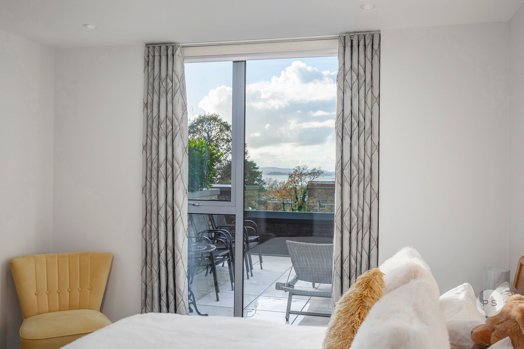 The open plan kitchen and living space is arranged to maximise the harbour views, with a premium fitted kitchen that includes integrated appliances and a sleek contemporary aesthetic. A separate laundry room adds further practicality. The principal bedroom enjoys custom fitted wardrobes and a luxury ensuite shower room. Two additional bedrooms, both well proportioned, share a beautifully appointed family bathroom. The entire apartment feels refined and cohesive, reflecting the standard expected from a premium homebuilder.