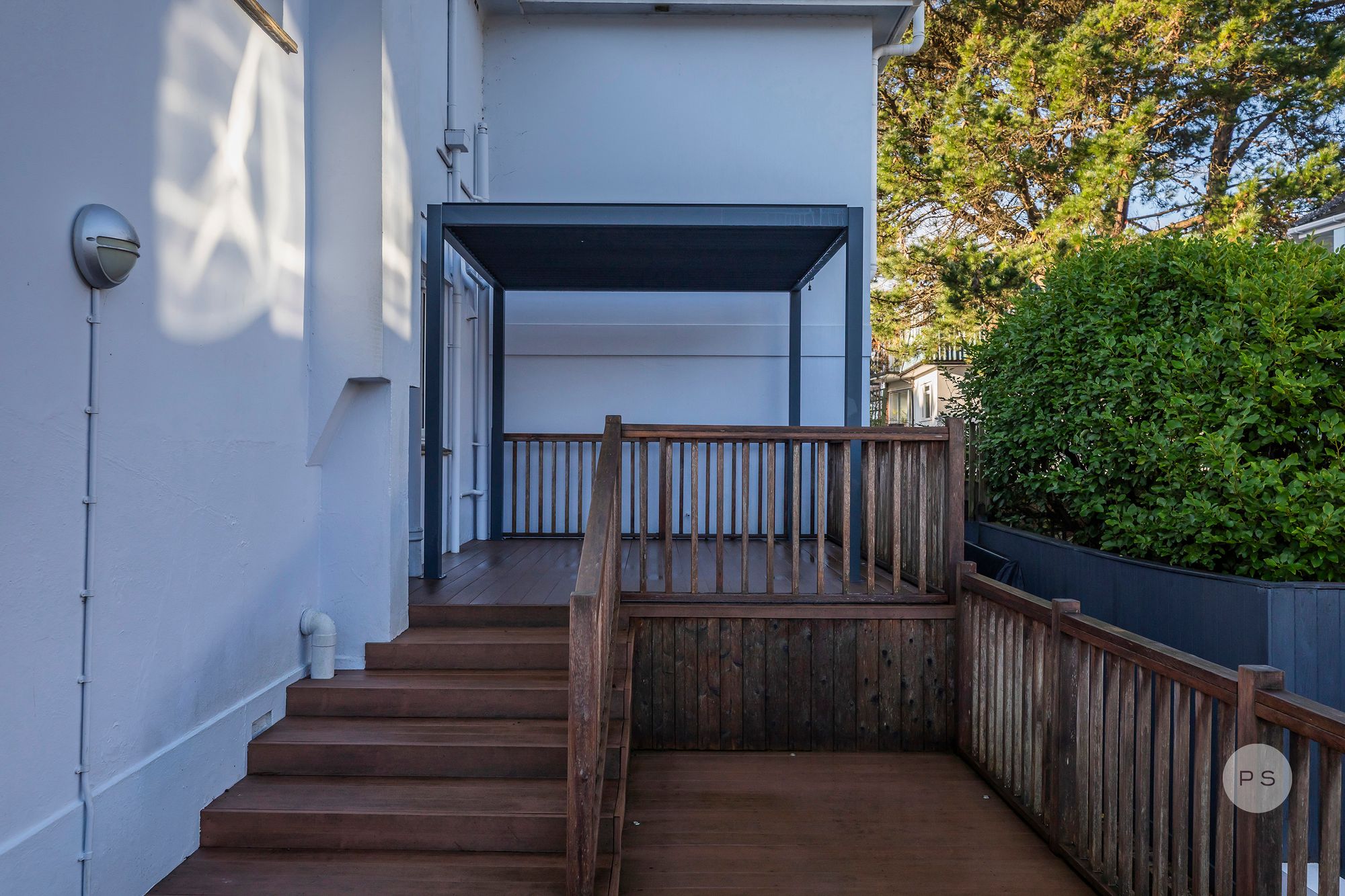 The architecture draws from a traditional coastal villa, with off-white rendered elevations that sit naturally within the peninsula’s seaside landscape. The property’s geometry is framed by curved and stepped terrace forms and mature tropical planting, creating a clear sense of arrival and separation from the road. Practical elements are thoughtfully integrated, including parking for multiple vehicles and a garage. Set within a plot of 5,210 sq.ft, the house offers a choice of outdoor seating and dining areas that follow the sun throughout the day, from morning coffee on the terrace to relaxed evenings on the deck. The decking connects directly to the kitchen and steps down to a useful utility area and additional storage room, providing practical everyday solutions especially for those sandy beach days, ensuring the house functions as comfortably as it presents.
