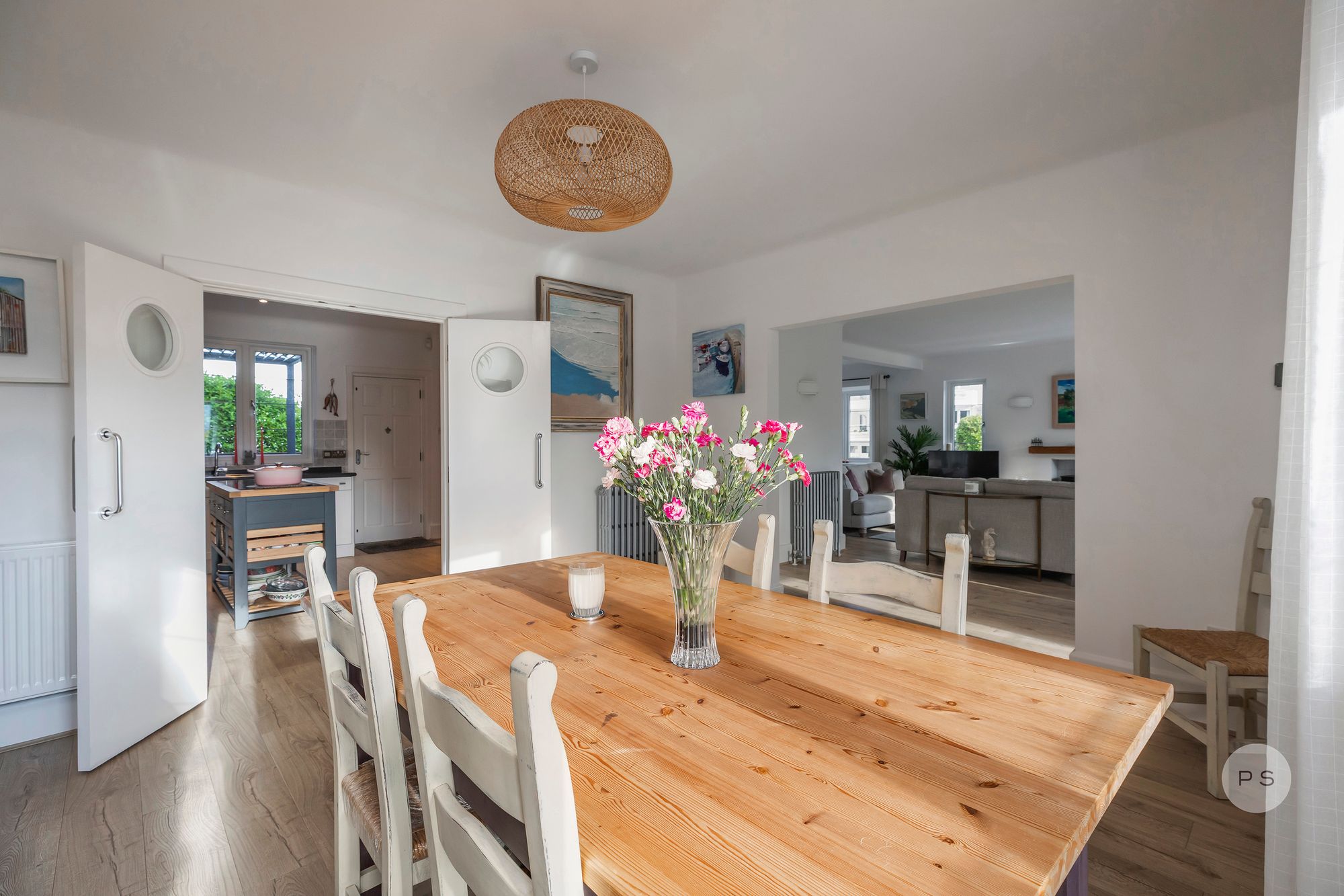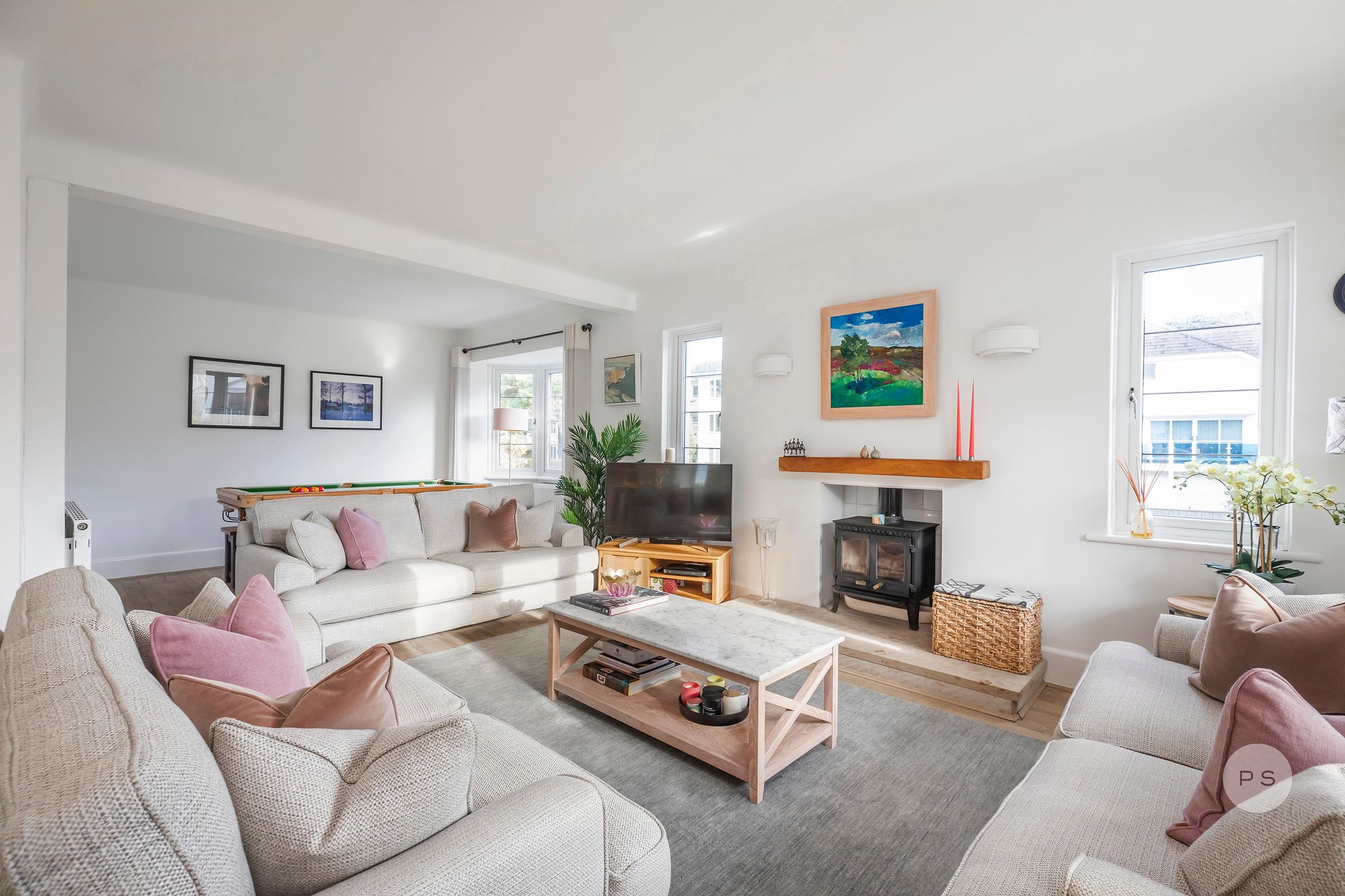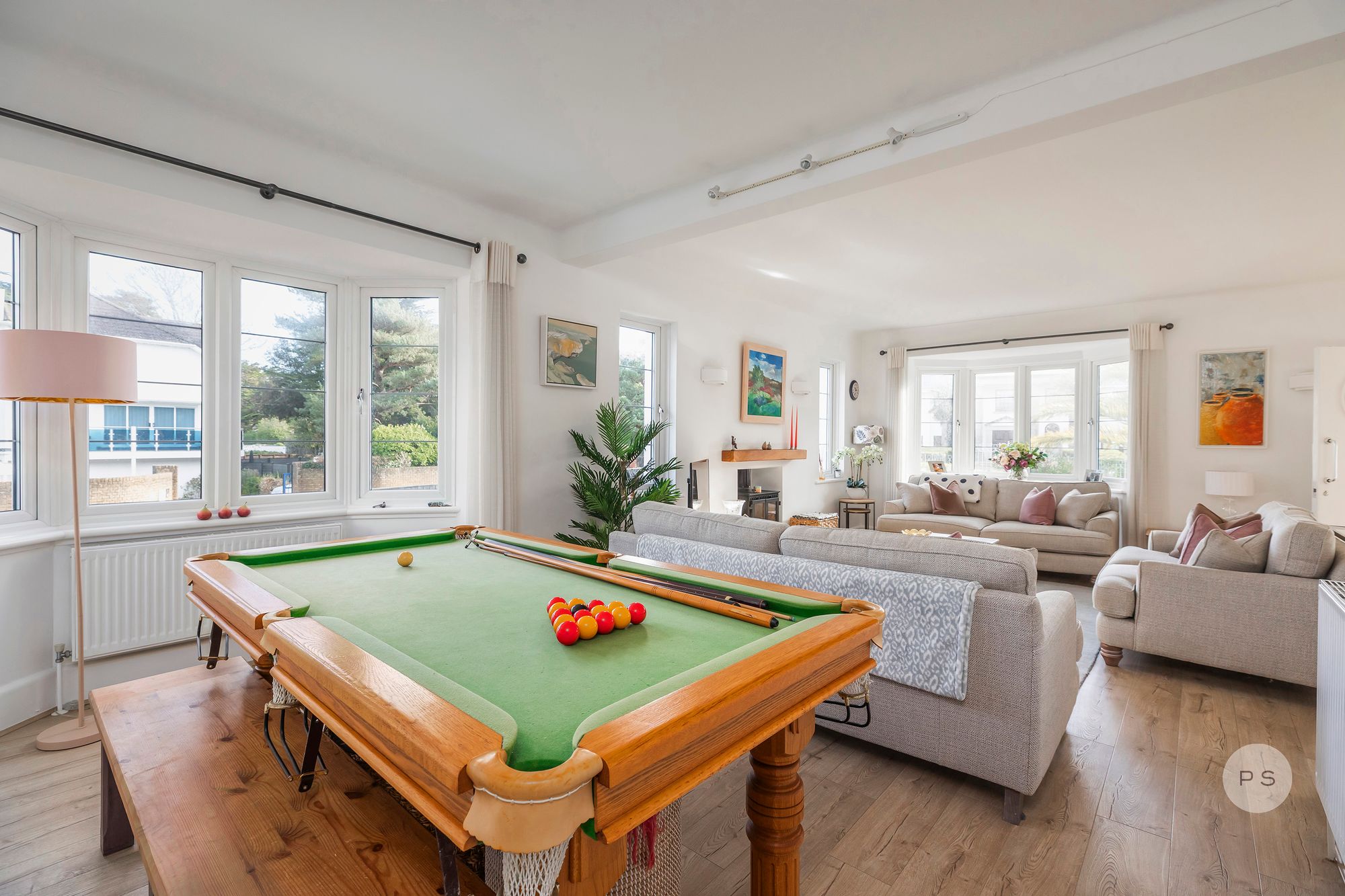 Internally, the layout flows with the ease of a permanent family home rather than a seasonal retreat, offering generous reception spaces, clearly defined living zones and bedrooms that feel purposeful and well proportioned. The ground floor is centred around a series of interconnected living and dining rooms, ideal for both relaxed daily life and entertaining. The rooms are broad and light filled, with bay windows adding character and scale while maintaining a calm, timeless feel. A games area or family zone provides flexibility for children, working from home or informal gatherings, reinforcing the sense that this is a house designed to be lived in year round.