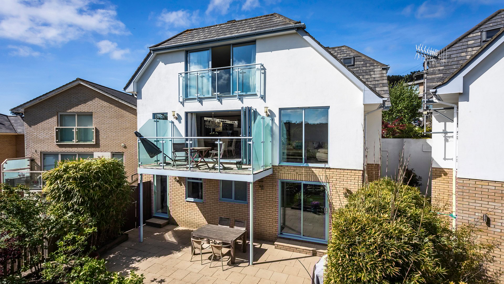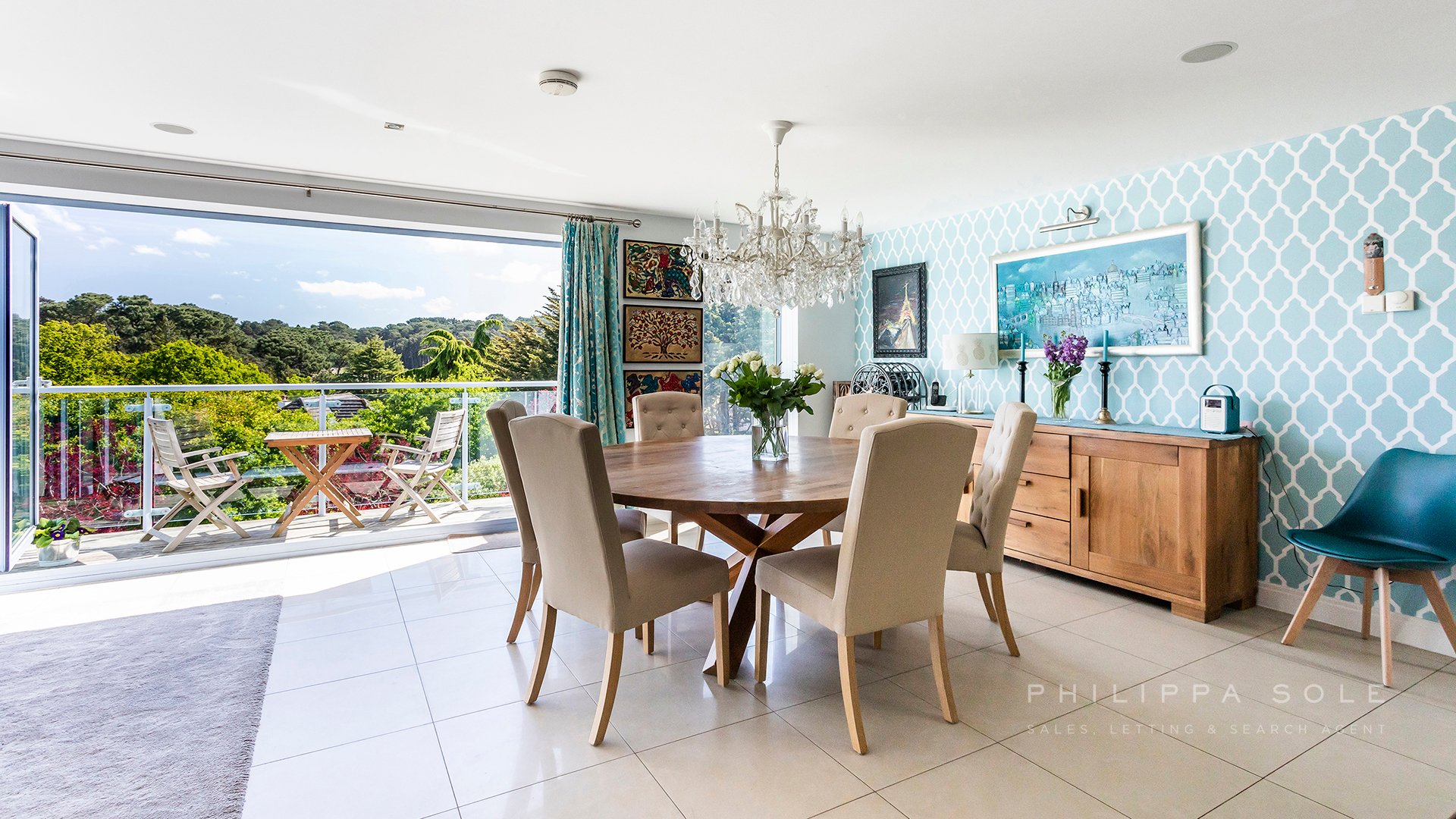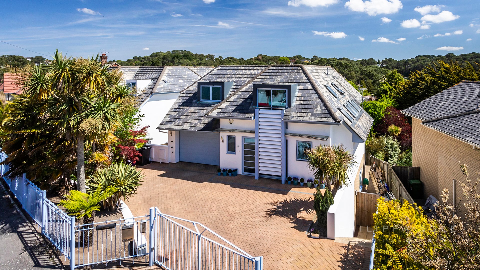 As soon as you enter the property you are drawn to the stunning elevated tree top views, which overlook Parkstone Golf course: from the floor to ceiling windows at the rear of the property. The modern fitted kitchen is an ideal place in which to entertain with its sociable central island and breakfast bar. The kitchen itself is well appointed with a range of integral appliances and stone work tops, the addition of roof lights above the kitchen allows the light to flood in. The kitchen opens directly onto the large living dining space which spans the width of the house and enjoys distant views from the the windows and balcony. For those that prefer a separate living area, the cleverly designed sliding doors allow you to close the kitchen from the living space in the evening. Also on this level is the guest cloak room and access to the integral garage. From the kitchen, an ash stair case leads to the first floor where there are two large double bedrooms, both en-suite. The master bedroom boasts a his and hers dressing area and stunning bathroom with a large walk-in shower, dual sinks and free standing bath. The lower level of the house comprises four rooms and could easily be converted to a self contained apartment and is ideal for teenagers or for someone who works from home. The media room is impressive with its projector. Leading from here is the utility room which could be used as a second kitchen. From the hallway there is a double bedroom with double doors leading to a room which is currently used as a study but could easily be used as an additional bedroom as it has access to an en-suite bathroom. The fourth bedroom shares this bathroom and enjoys access to the terrace. The gardens have been beautifully landscaped with a patio area to dine on which in turn leads to an area of lawn with landscaped borders and steps which lead to to the remainder of the garden. The property is set behind electric gates with ample room to park several cars off-road.