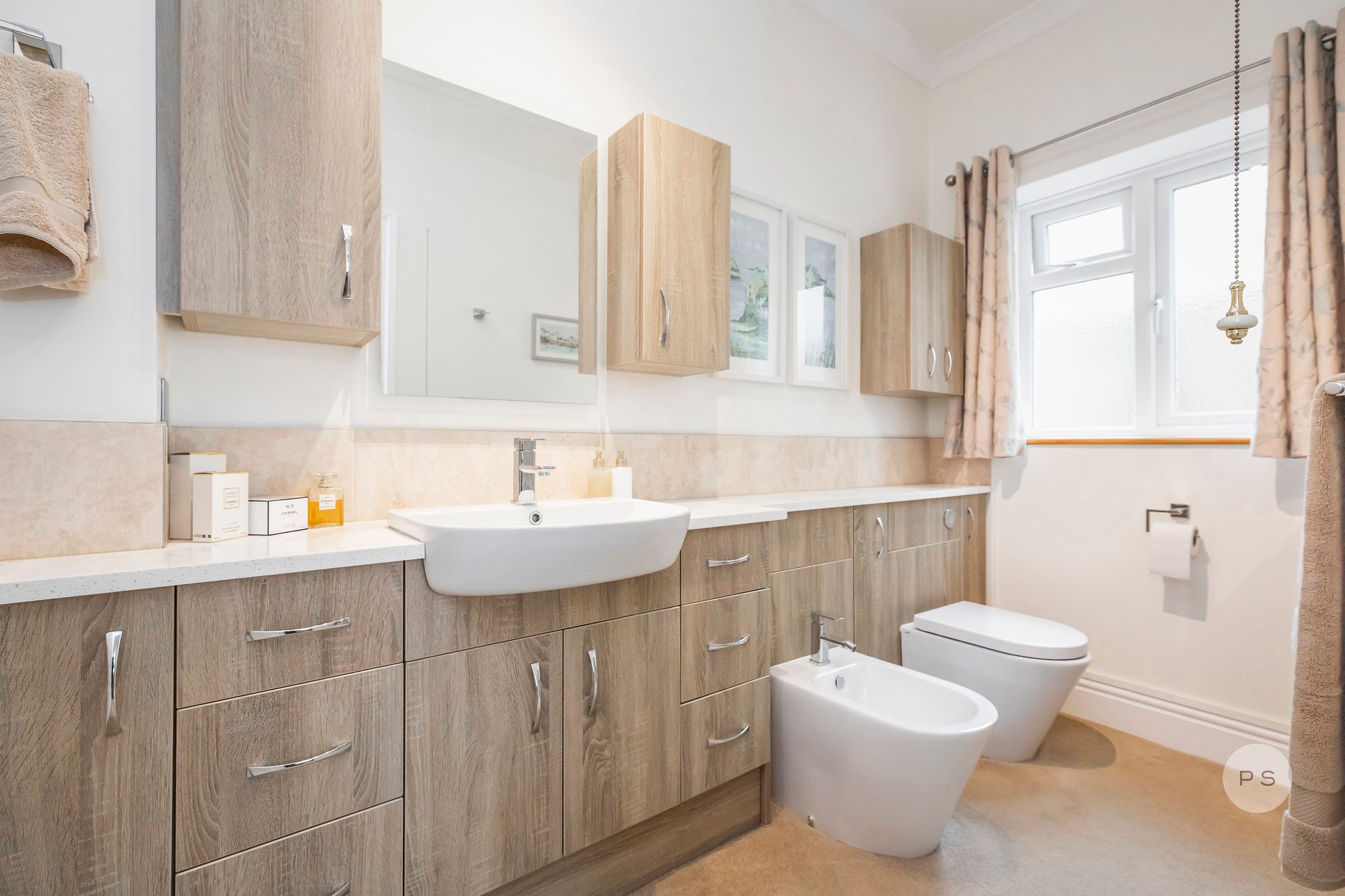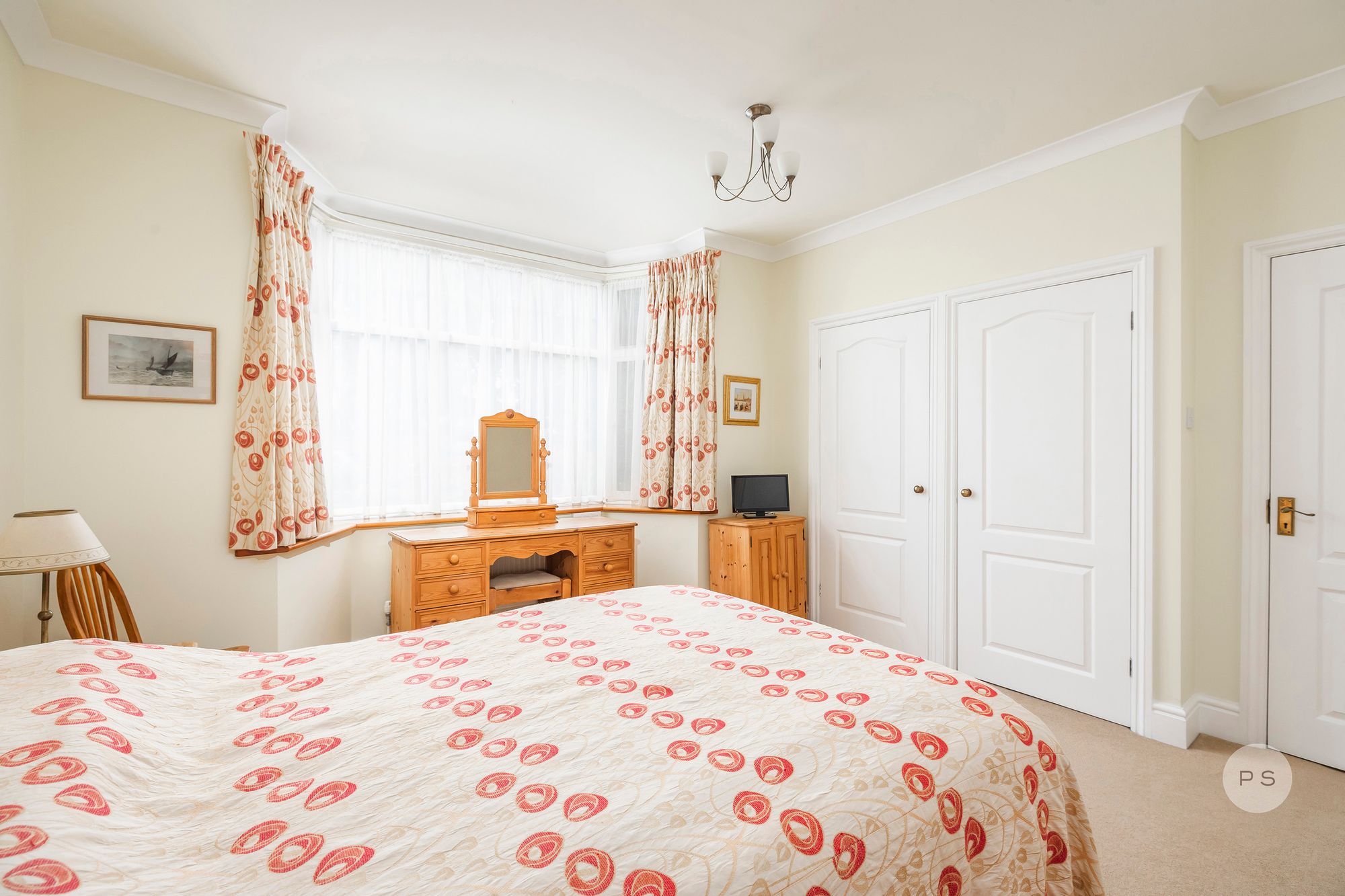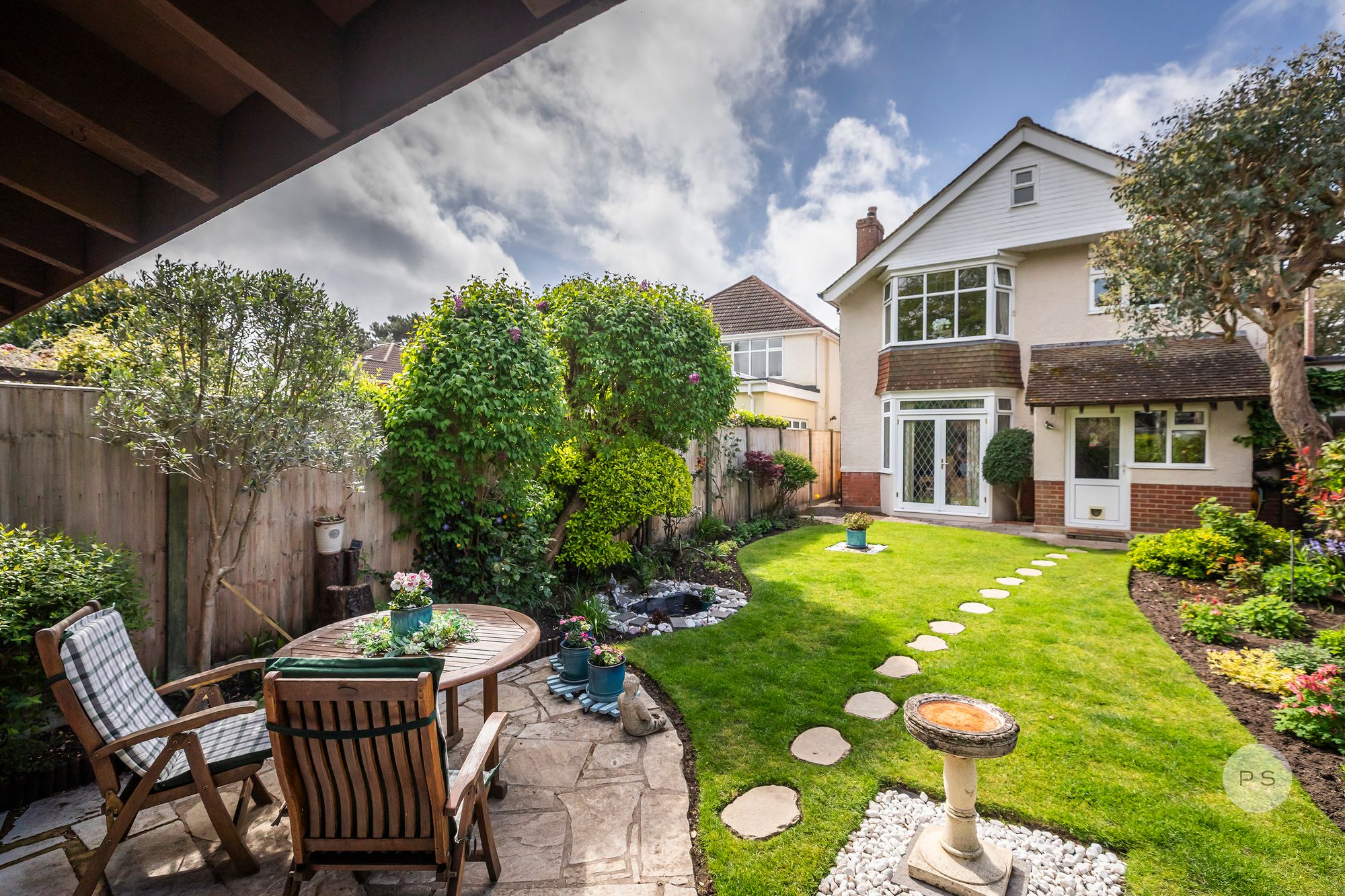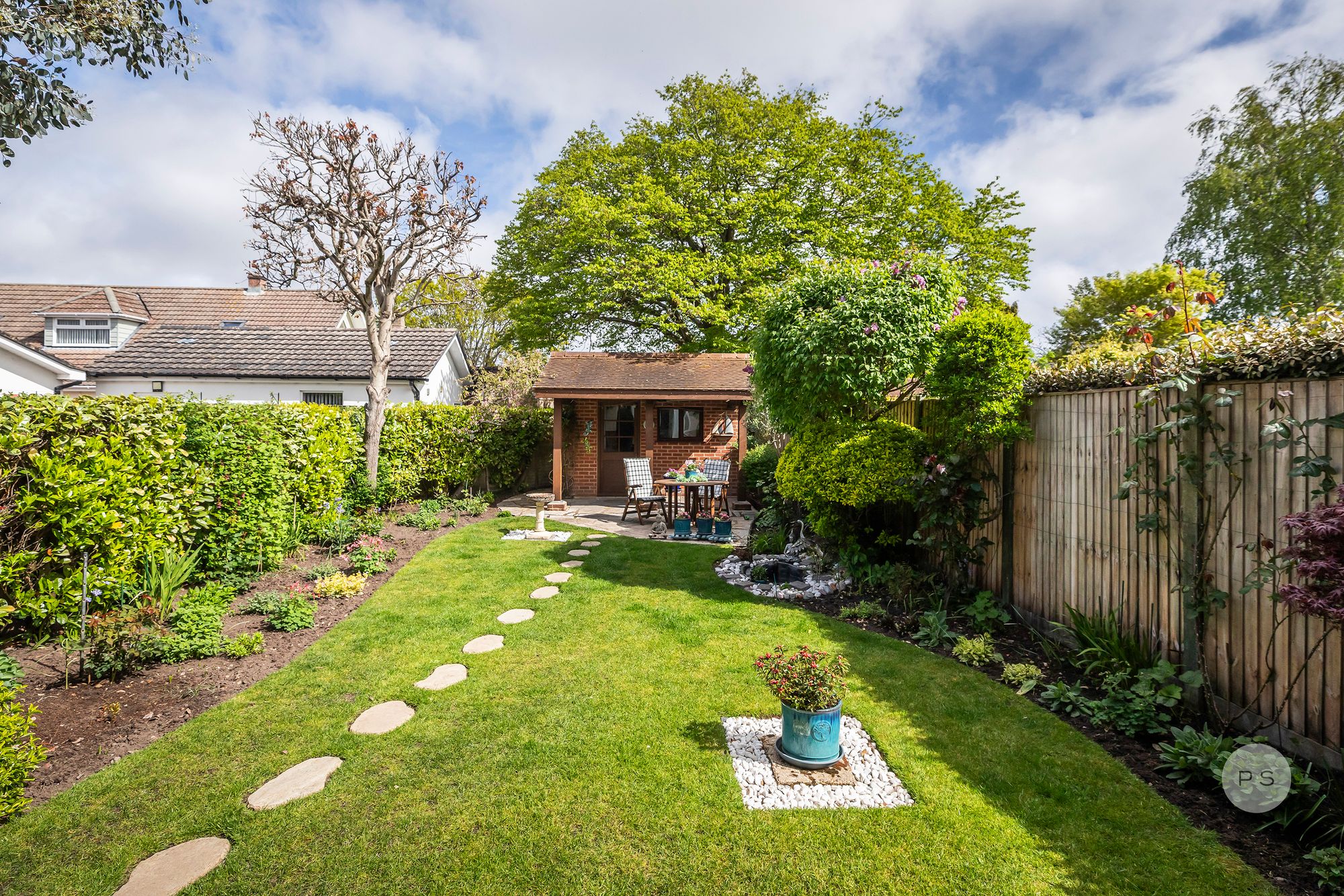 The ground floor offers 3 bedrooms, each well-proportioned and finished in soft, neutral tones. Fitted wardrobes and pleasant garden-facing aspects add to the sense of comfort, while the bathrooms and shower rooms are finished with contemporary tiling, glass enclosures, and modern fixtures. Combined with its coastal setting, the property offers a relaxed lifestyle evoking the feeling of being on holiday all year round. The rear garden is beautifully landscaped, offering a well-kept lawn bordered by mature planting and colourful beds. A patio seating area provides the perfect spot for outdoor dining, while a charming garden room adds versatility.