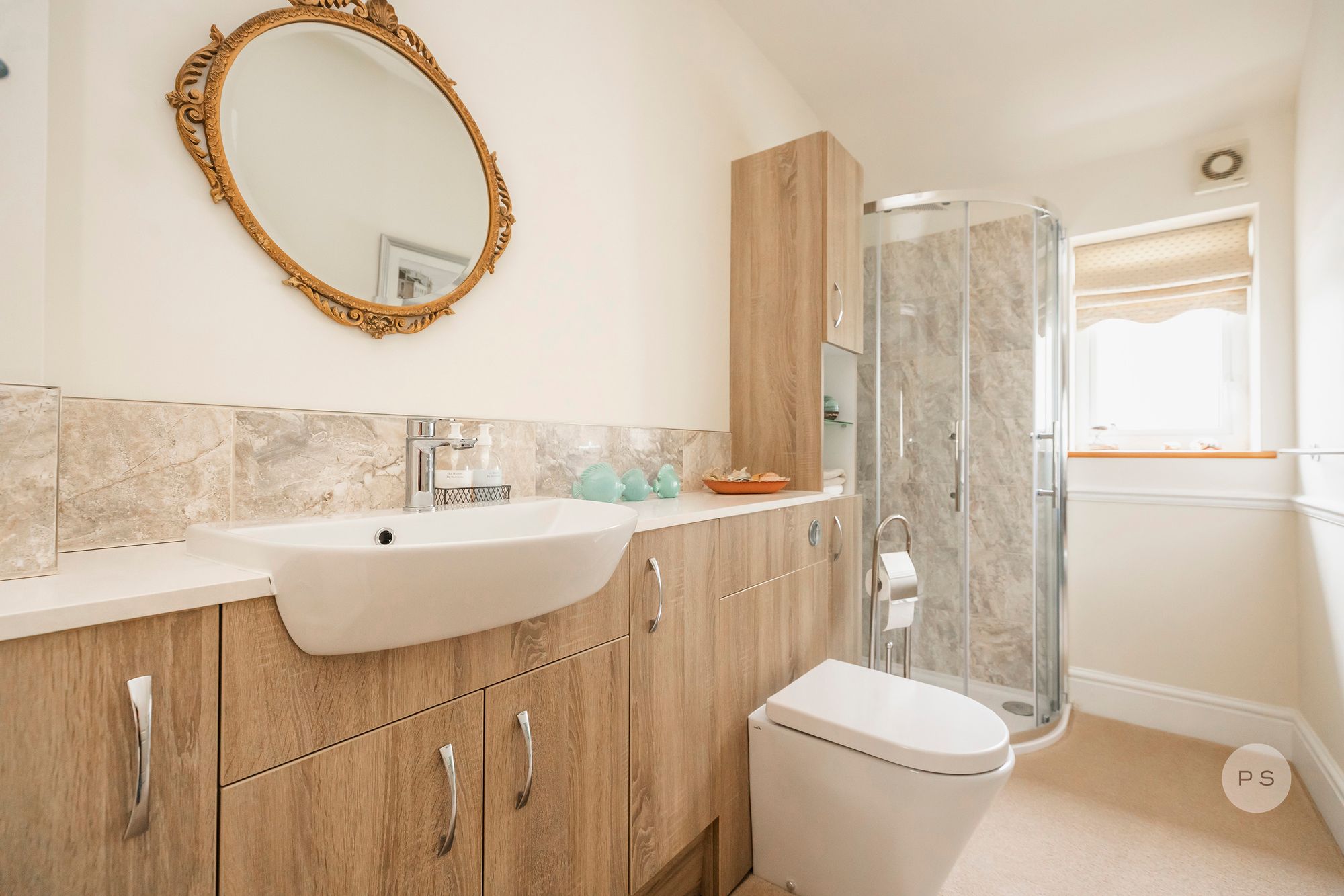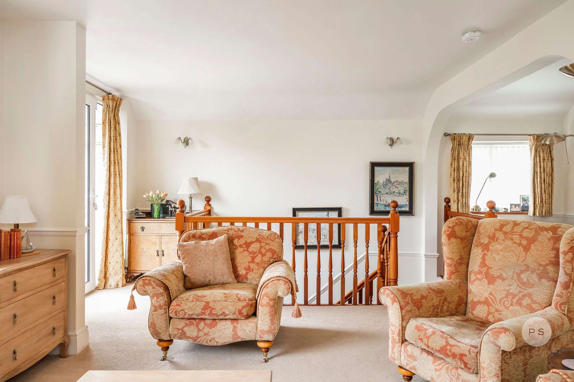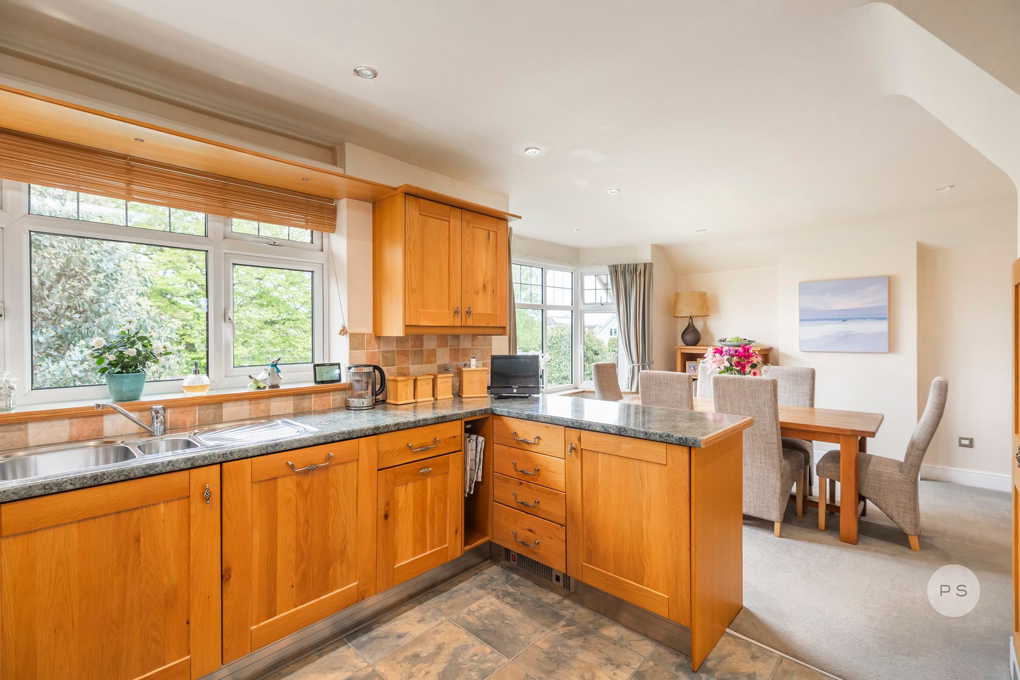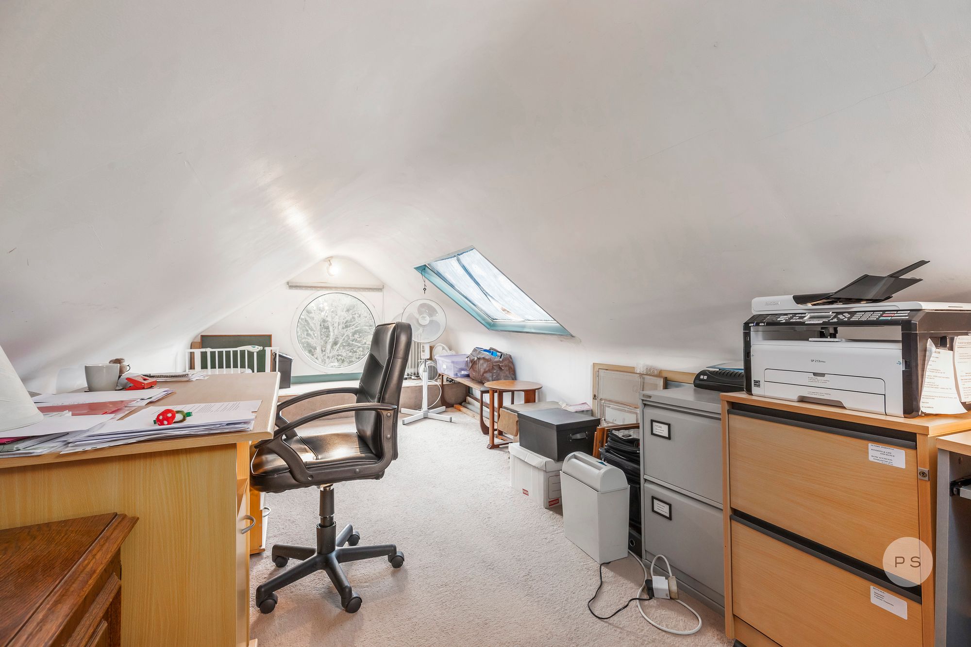 This charming detached home has been thoughtfully designed in an upside-down layout, with the main living accommodation positioned on the first floor to fully embrace the natural light and elevated outlook. Upstairs, the living spaces feel bright and welcoming, with a comfortable sitting room centred around a feature fireplace and a generous open-plan kitchen and dining area fitted with solid wood cabinetry, ample work surfaces, and integrated appliances. Large windows and access to a balcony enhance the sense of space and connection to the outdoors, creating an ideal setting for both everyday living and entertaining. Also, at this level, there is a shower room, a study area, and stairs to the loft/playroom.