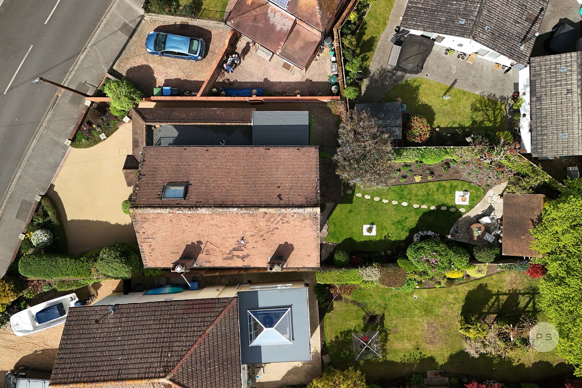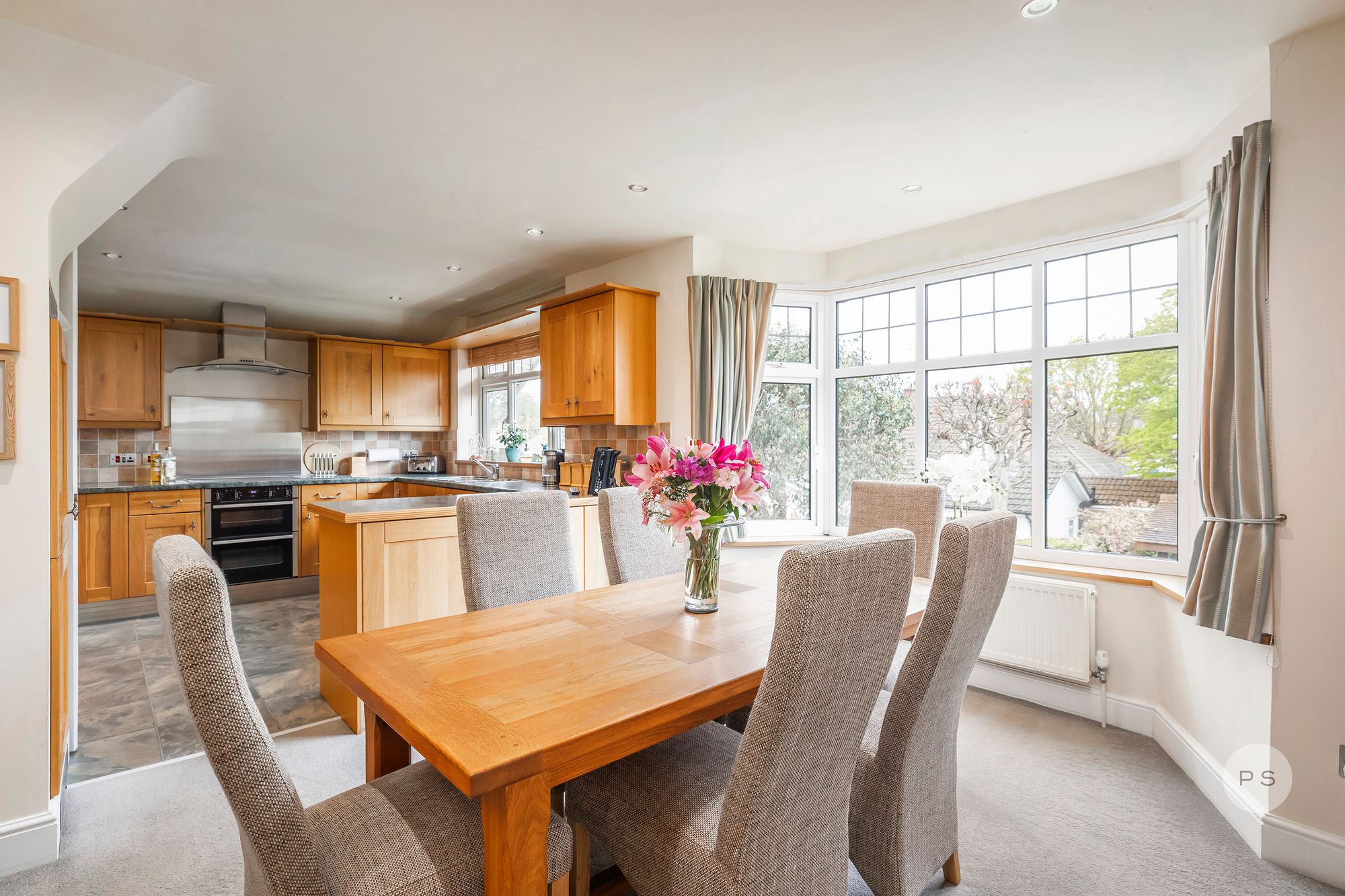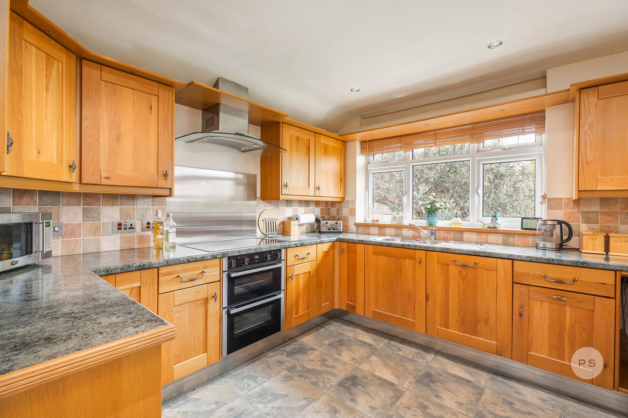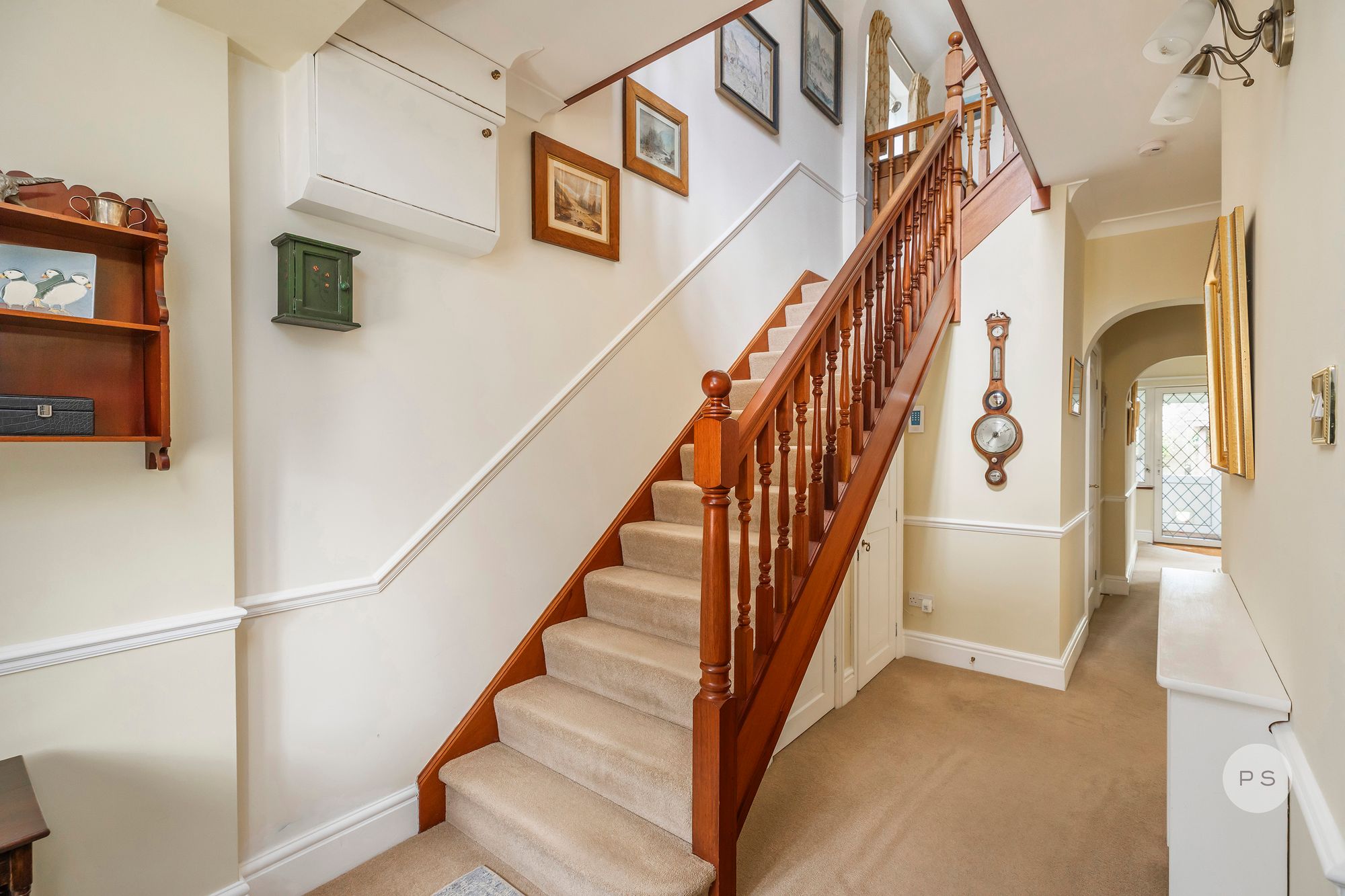 This charming detached home has been thoughtfully designed in an upside-down layout, with the main living accommodation positioned on the first floor to fully embrace the natural light and elevated outlook. Upstairs, the living spaces feel bright and welcoming, with a comfortable sitting room centred around a feature fireplace and a generous open-plan kitchen and dining area fitted with solid wood cabinetry, ample work surfaces, and integrated appliances. Large windows and access to a balcony enhance the sense of space and connection to the outdoors, creating an ideal setting for both everyday living and entertaining. Also, at this level, there is a shower room, a study area, and stairs to the loft/playroom.