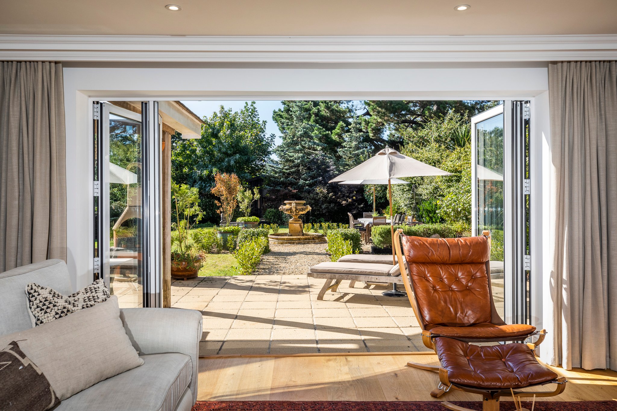 Spindrift has been designed with entertaining in mind making the most of its south-west axis. Outside are two patio areas, one designed for relaxing under the shade of the pergola and the another offering a large entertaining space next to a water feature fountain. Towards the back of the garden, is a gorgeous 2-room cabin that can be used for additional living / guest accommodation or as a fantastic garden office perfect for a modern day lifestyle by the sea.