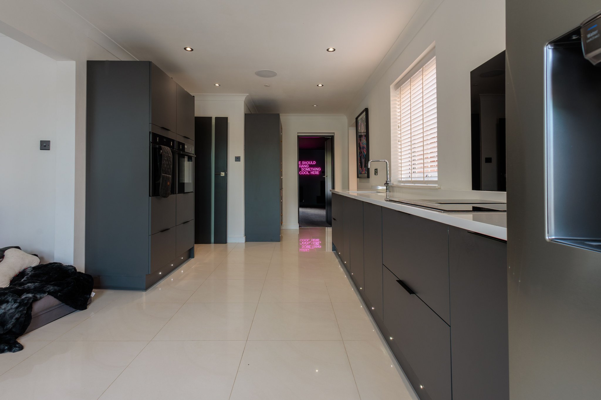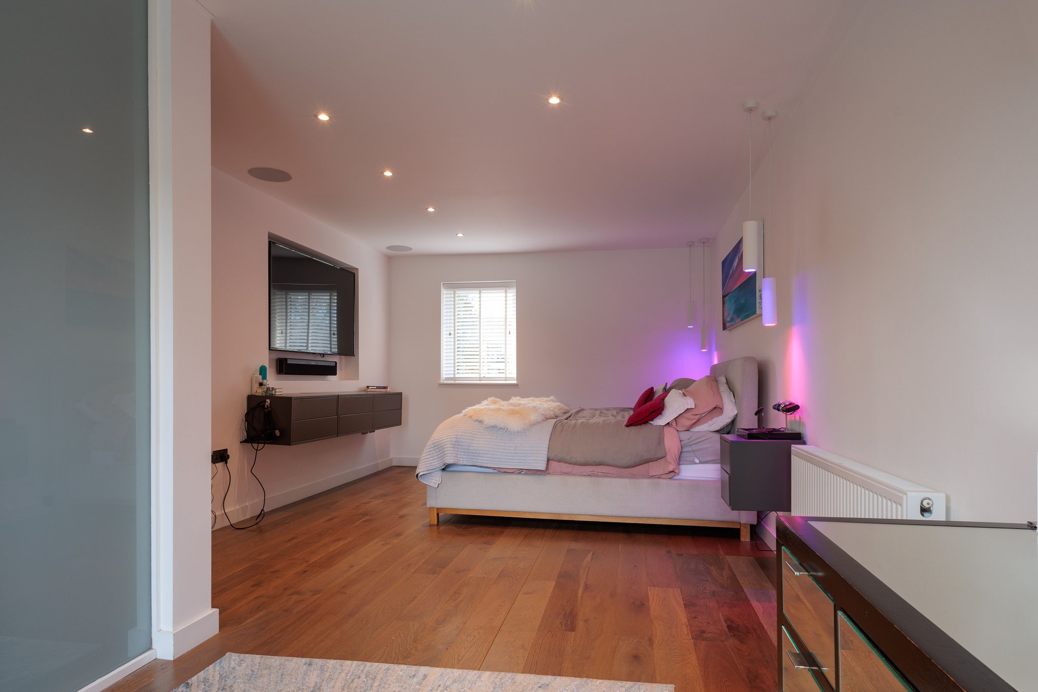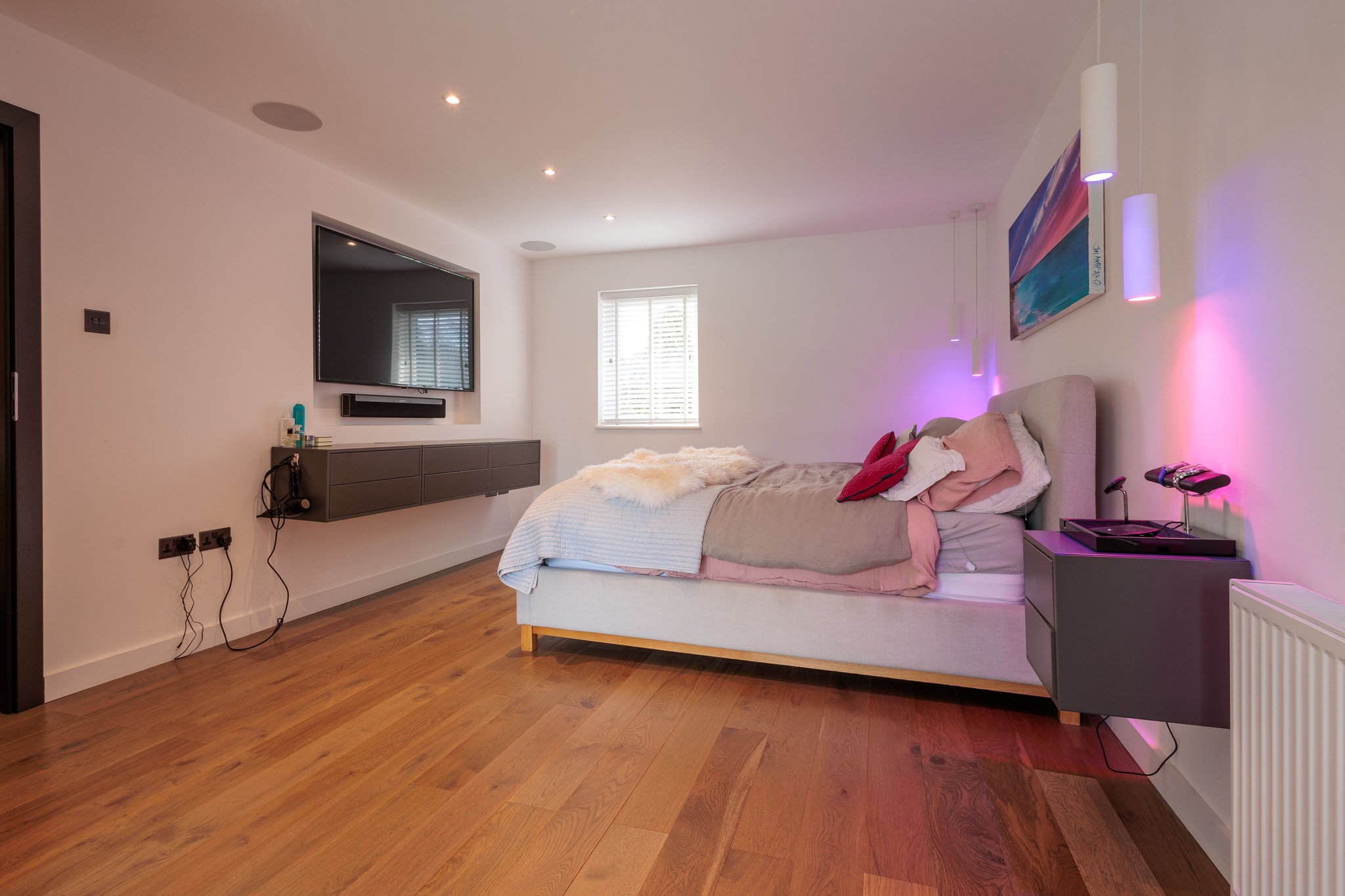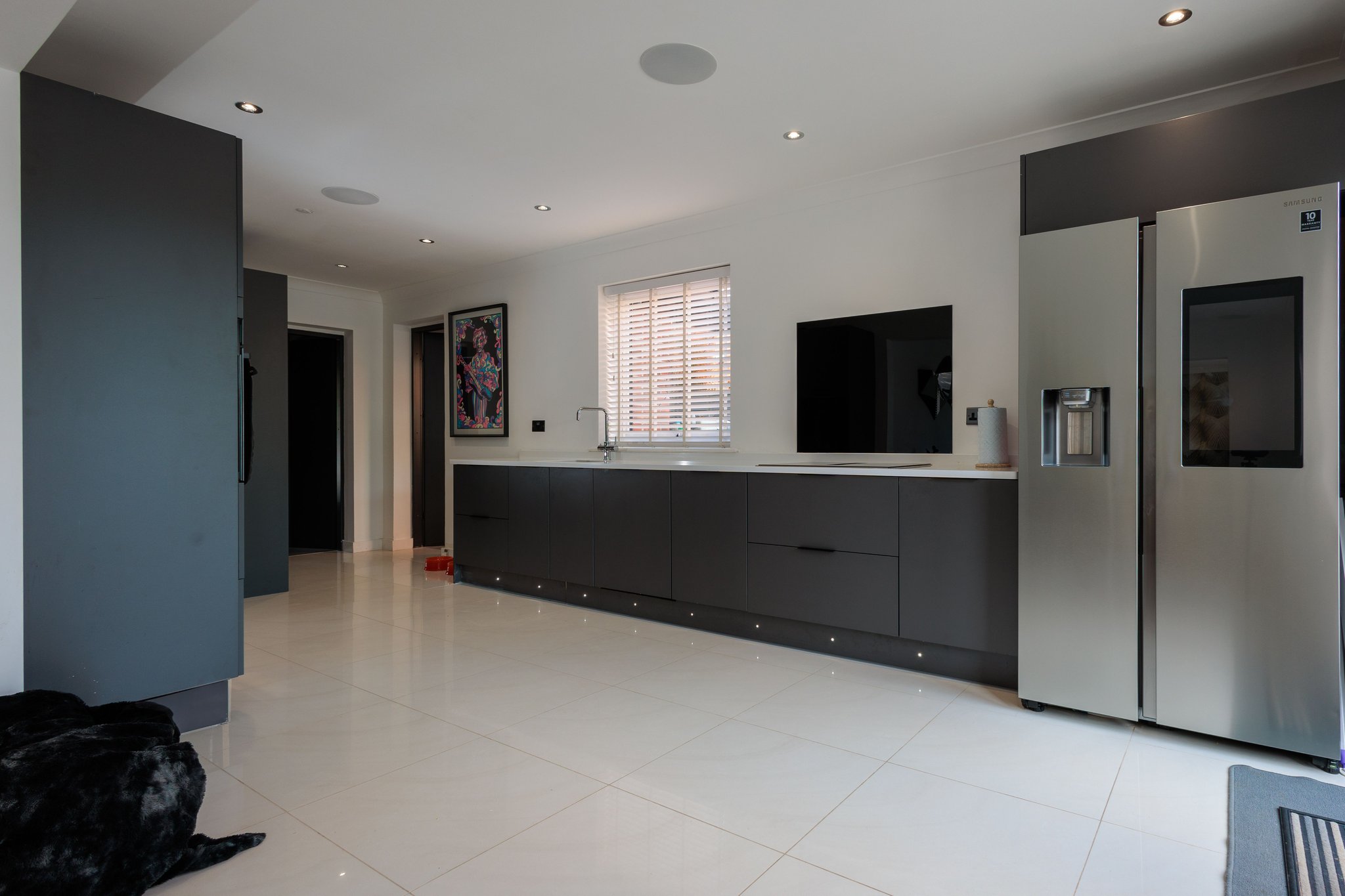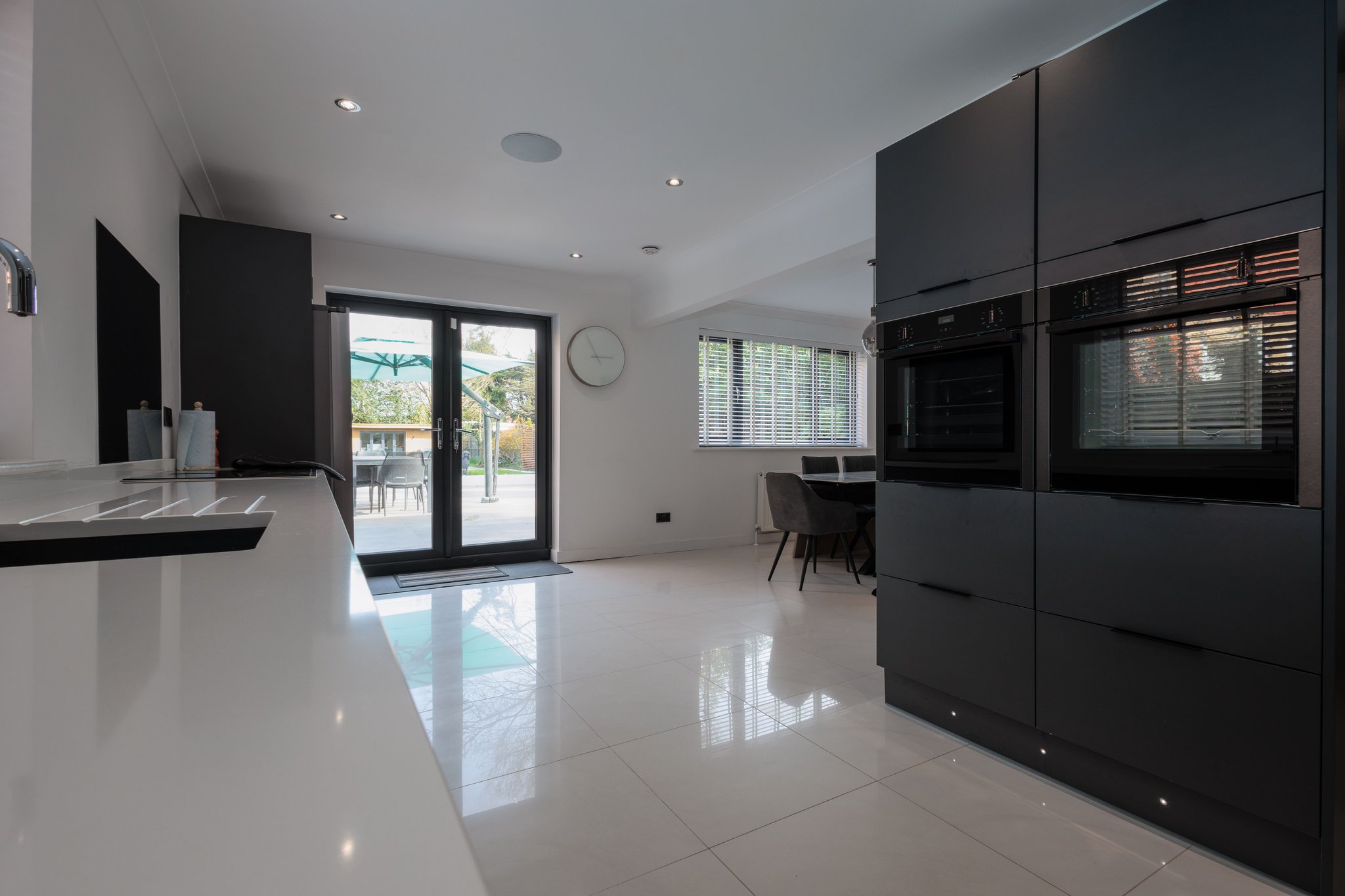 This exceptionally well presented property is approached via electric gate giving access to ample off-road parking and large single garage. The present owners have taken on a programme of work creating a modern, stylish property in keeping with current trends. The open kitchen/dining/day room has been cleverly created with it's own zoned areas and yet with a natural open flow. The kitchen is fitted with a high end range of units and integrated appliances with French doors from both here and the lounge to the porcelain paved terrace. Also on this level is the cinema room, large utility room and wc. The first floor provides 4 good sized bedrooms, the principal with luxury en suite shower room and double opening doors to the Juliet balcony and elevated views of the garden. The other three bedroom are serviced by the family bathroom.