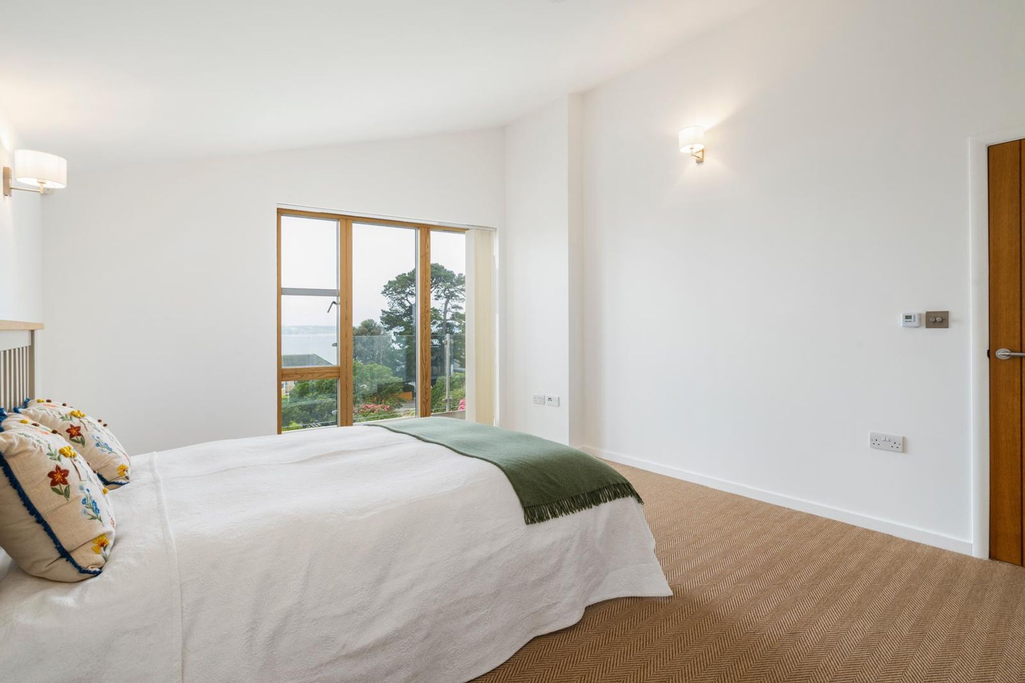 On the upper floor, a vaulted viewing lounge provides a unique vantage point across the water, with direct access to another balcony. The principal bedroom suite enjoys full harbour views, complemented by a walk-through dressing area and spacious en suite. Two further double bedrooms share a stylish Jack and Jill bathroom, while the fourth bedroom is located on the garden level, alongside a bathroom, dedicated office, and ample storage areas.