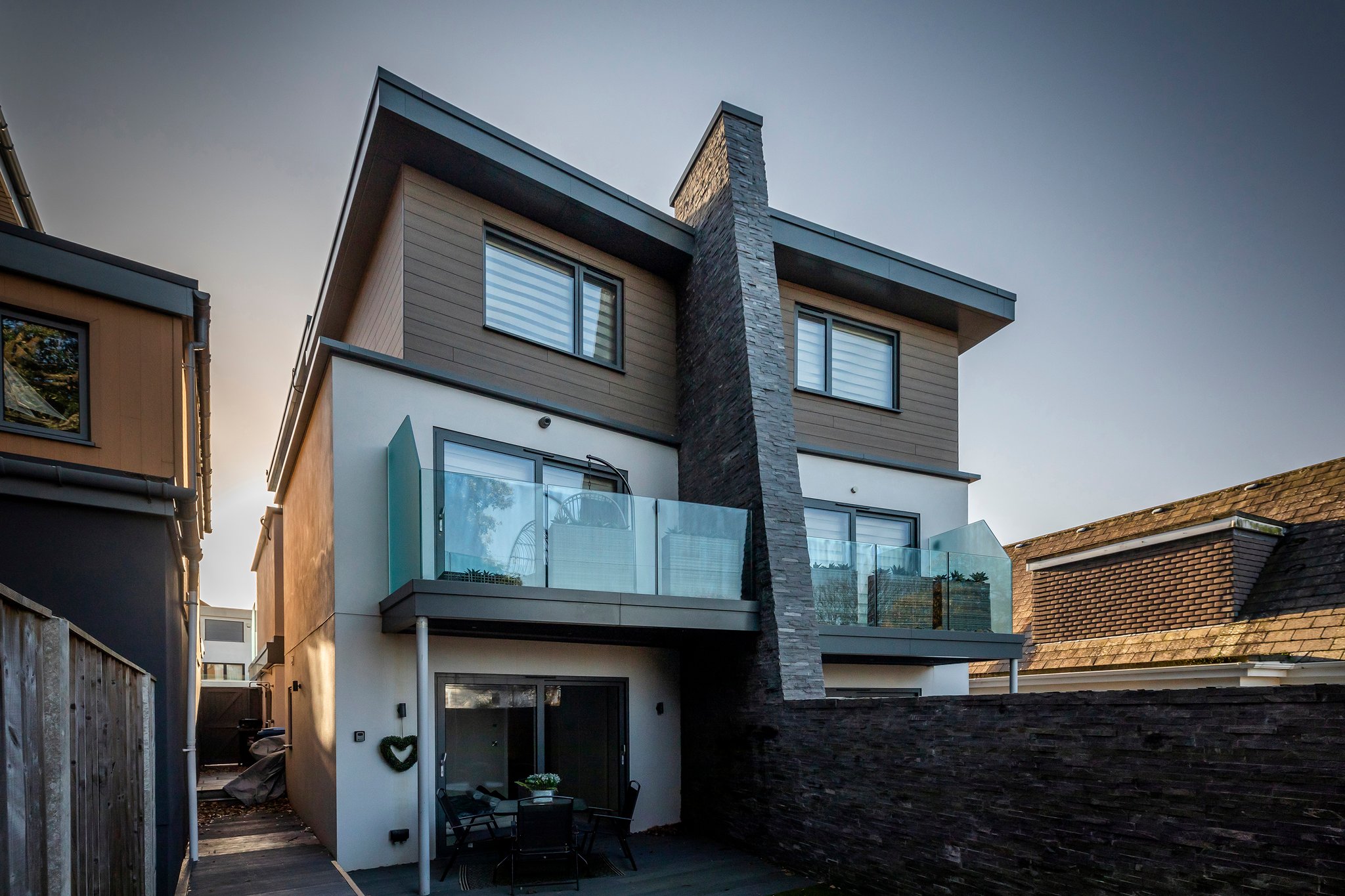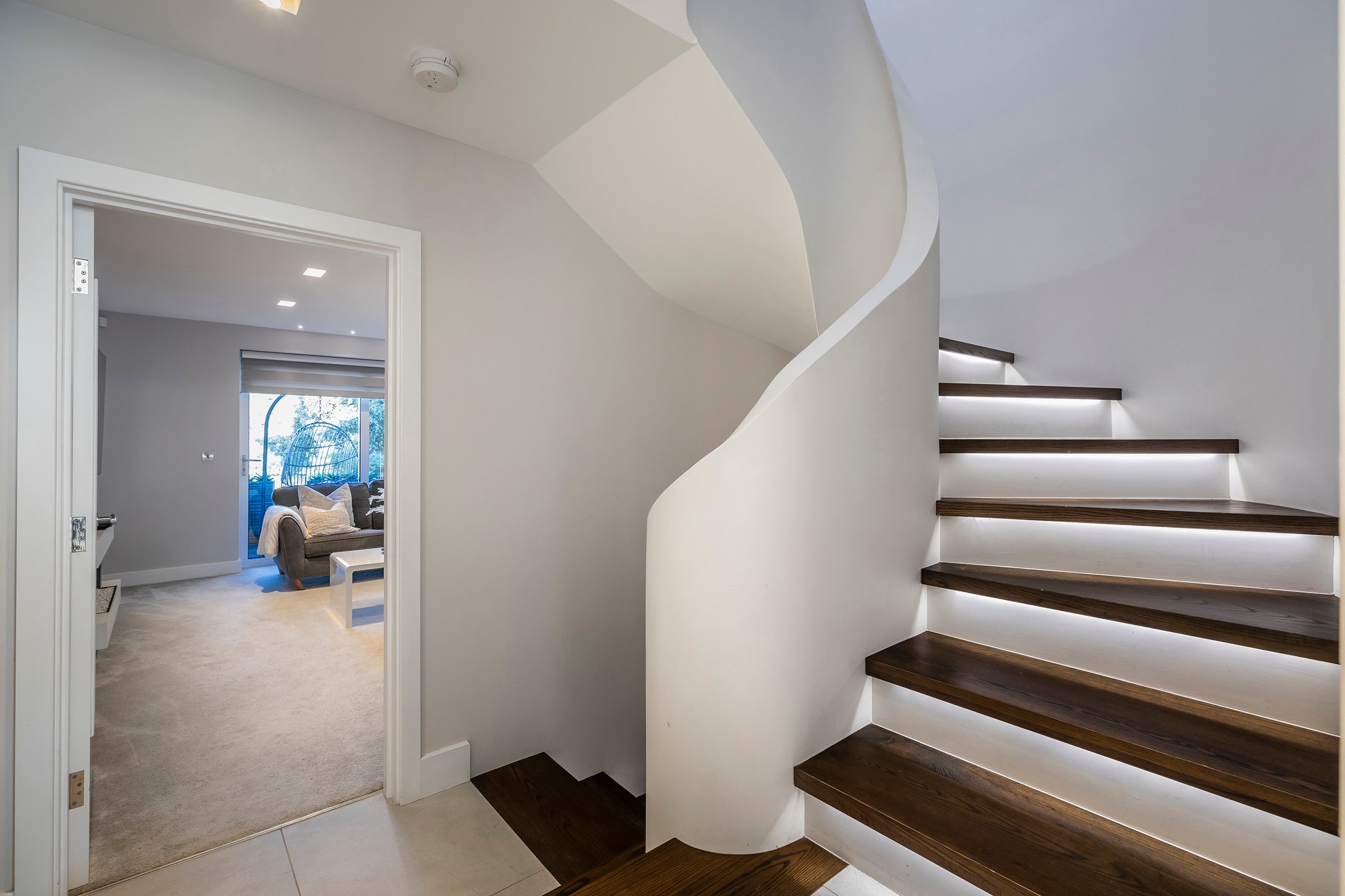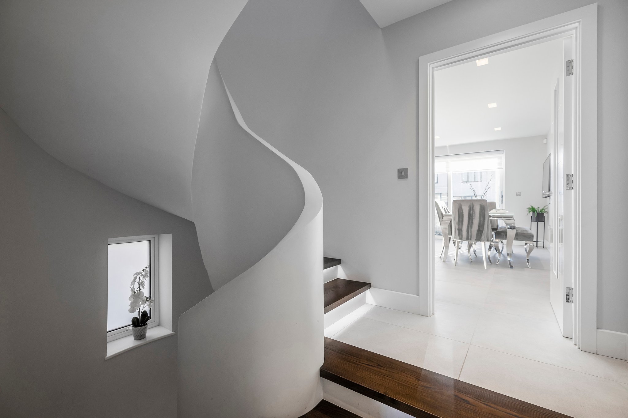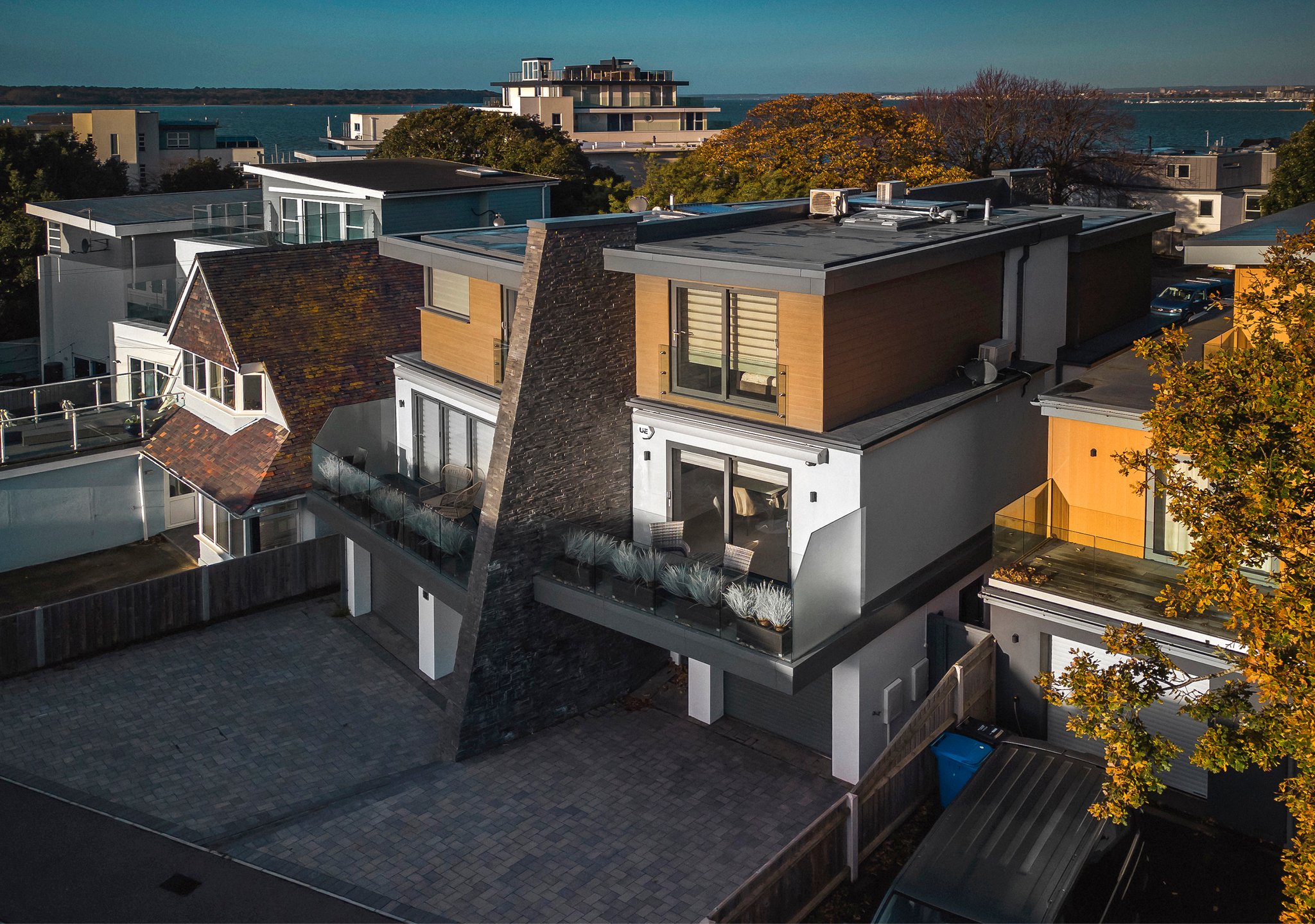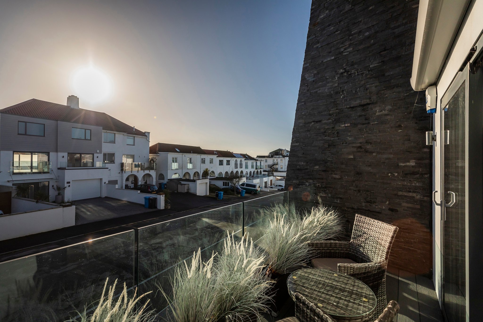A stunning curved walnut staircase, with concealed LED lights, spirals upwards creating the core of the house. The first floor is dedicated to sociable living space. To the front is an impressive well-appointed sunny kitchen with a range of integral appliances and quartz worktop; floor-to-ceiling sliding patio doors lead onto the south facing balcony, from where you can see glimpses of the water. At the rear of the property is the living room with double doors out onto a good-sized balcony capturing westerly views of the sunsets over Poole Harbour. On the top floor a circular roof light complements the shape of the feature staircase, where there are two further ensuite bedrooms. The main bedroom boasts fitted wardrobes and a Juliet balcony with sea glimpses over Jazz Café and Old Harry Rock. The luxurious ensuite shower room is fully tiled and also features a large roof light. To the rear is another double bedroom with floor to ceiling windows. A side gate provides access to the rear garden, which has been designed for easy maintenance, with a sheltered patio and faux lawn. An outdoor shower is ideal for the water sport enthusiast with direct access into the garage. The property has been successfully holiday let for the last season, making it an ideal investment or to enjoy as a family holiday home.