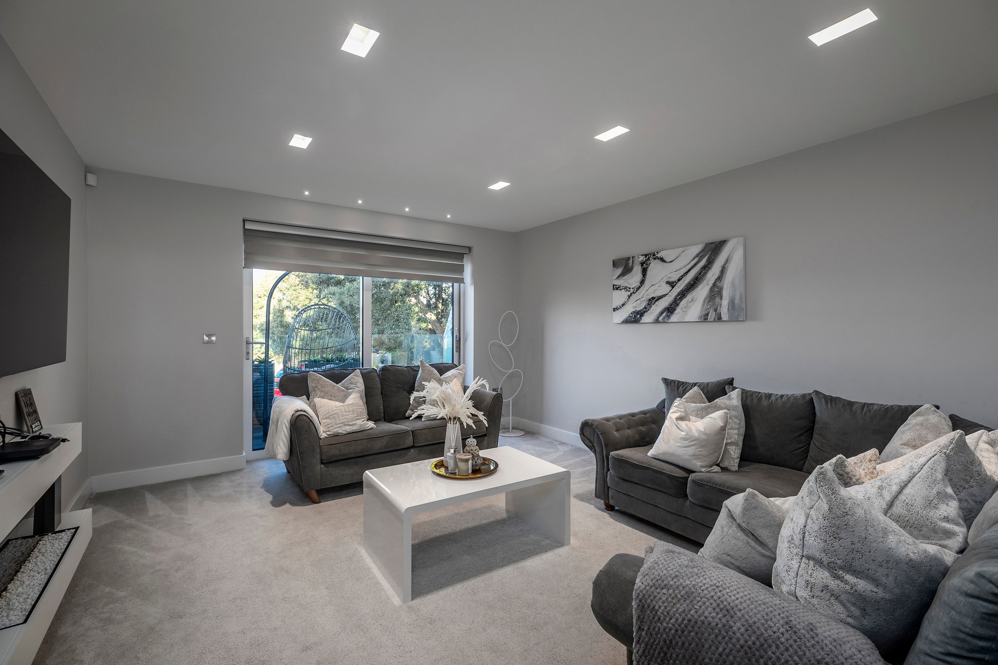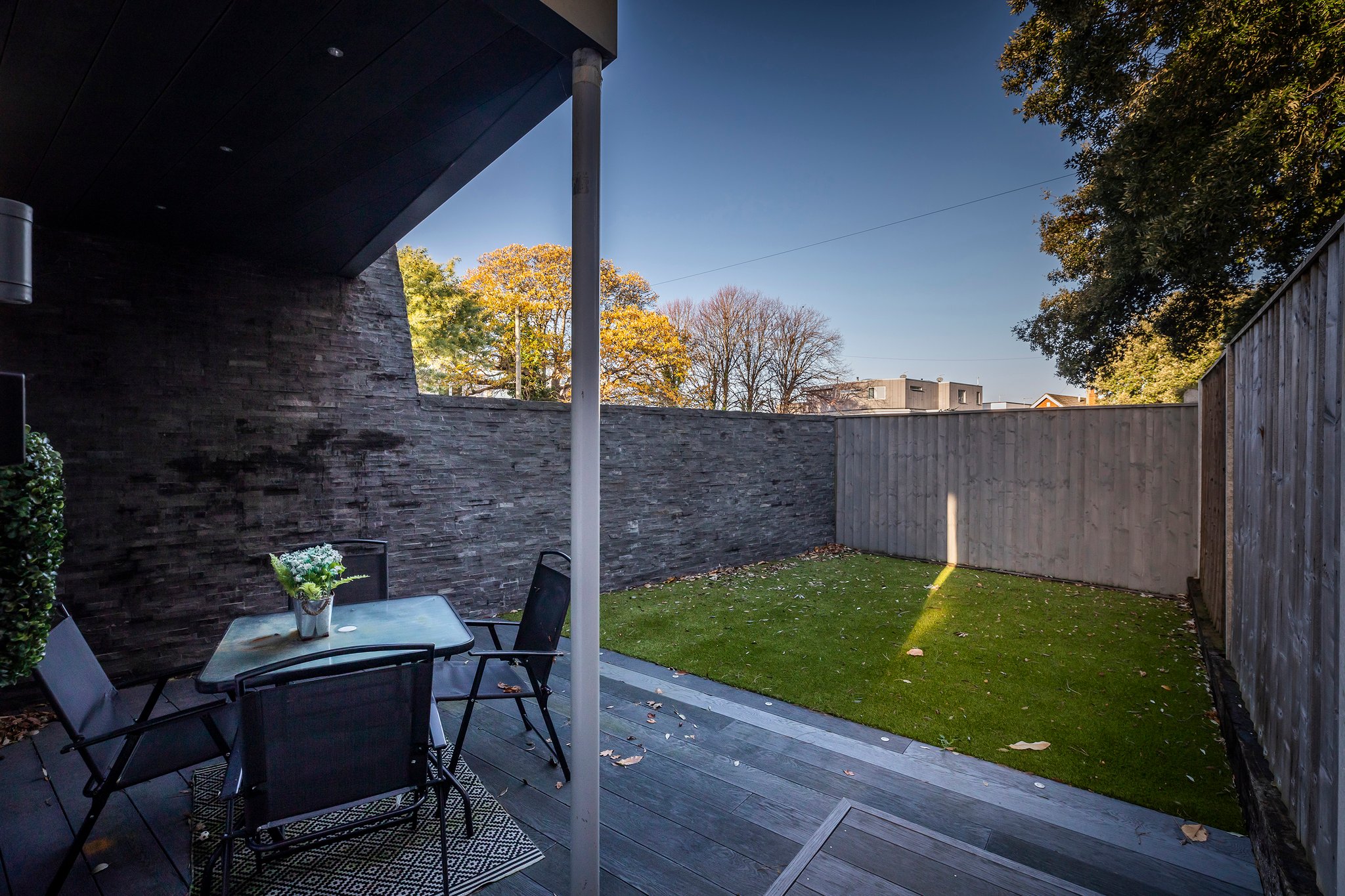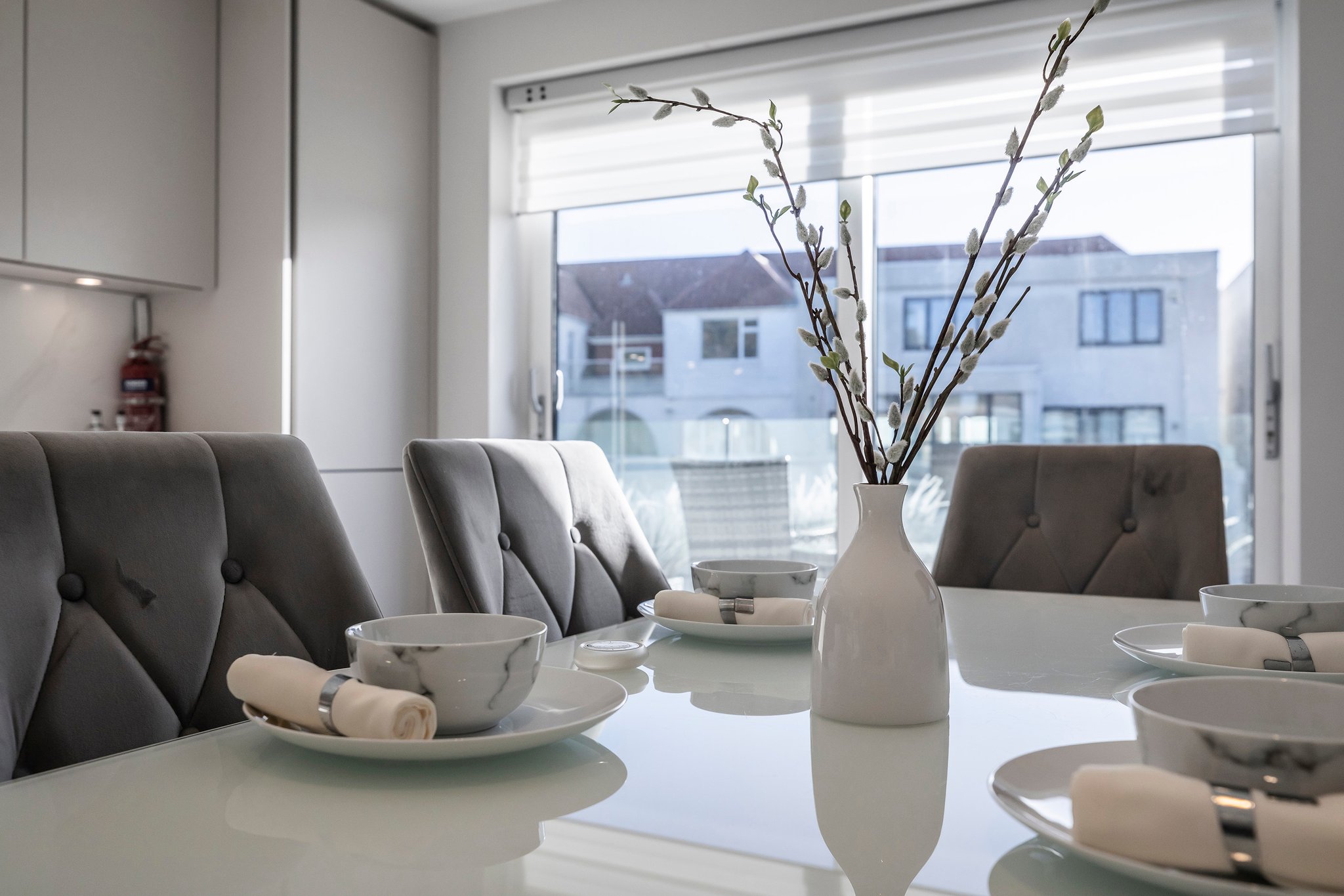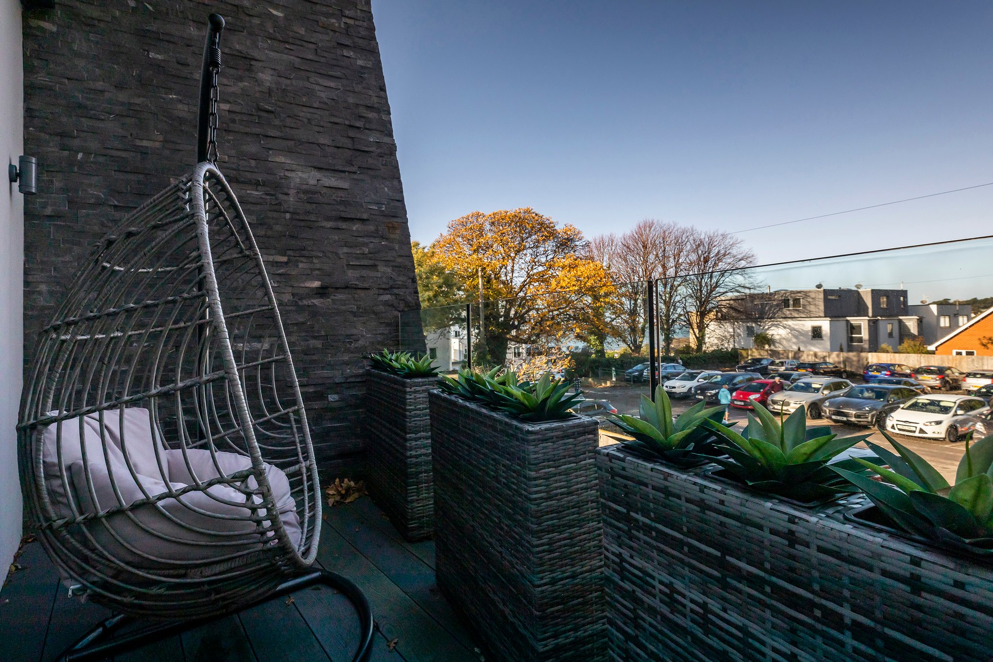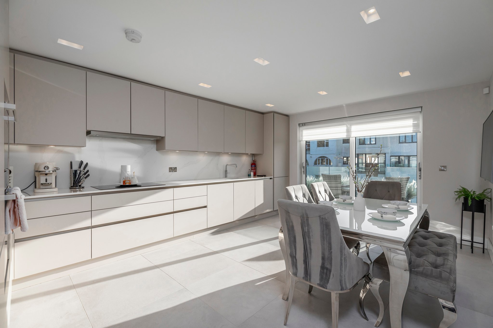 A stunning curved walnut staircase, with concealed LED lights, spirals upwards creating the core of the house. The first floor is dedicated to sociable living space. To the front is an impressive well-appointed sunny kitchen with a range of integral appliances and quartz worktop; floor-to-ceiling sliding patio doors lead onto the south facing balcony, from where you can see glimpses of the water. At the rear of the property is the living room with double doors out onto a good-sized balcony capturing westerly views of the sunsets over Poole Harbour. On the top floor a circular roof light complements the shape of the feature staircase, where there are two further ensuite bedrooms. The main bedroom boasts fitted wardrobes and a Juliet balcony with sea glimpses over Jazz Café and Old Harry Rock. The luxurious ensuite shower room is fully tiled and also features a large roof light. To the rear is another double bedroom with floor to ceiling windows. A side gate provides access to the rear garden, which has been designed for easy maintenance, with a sheltered patio and faux lawn. An outdoor shower is ideal for the water sport enthusiast with direct access into the garage. The property has been successfully holiday let for the last season, making it an ideal investment or to enjoy as a family holiday home.