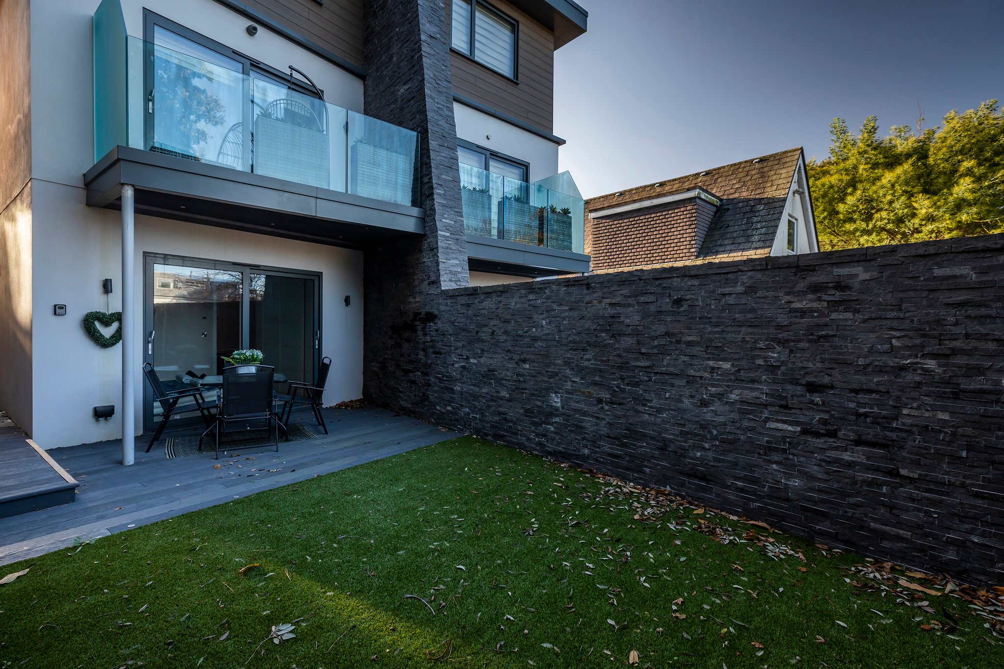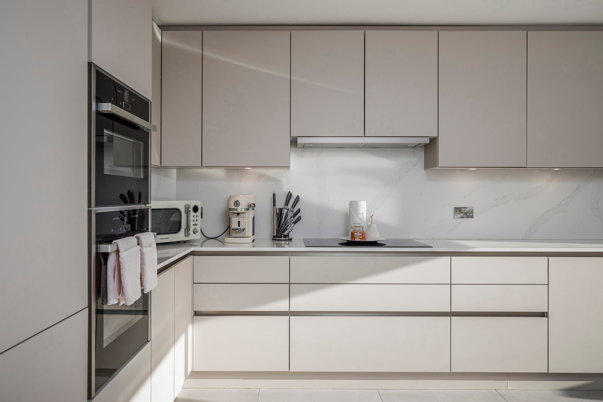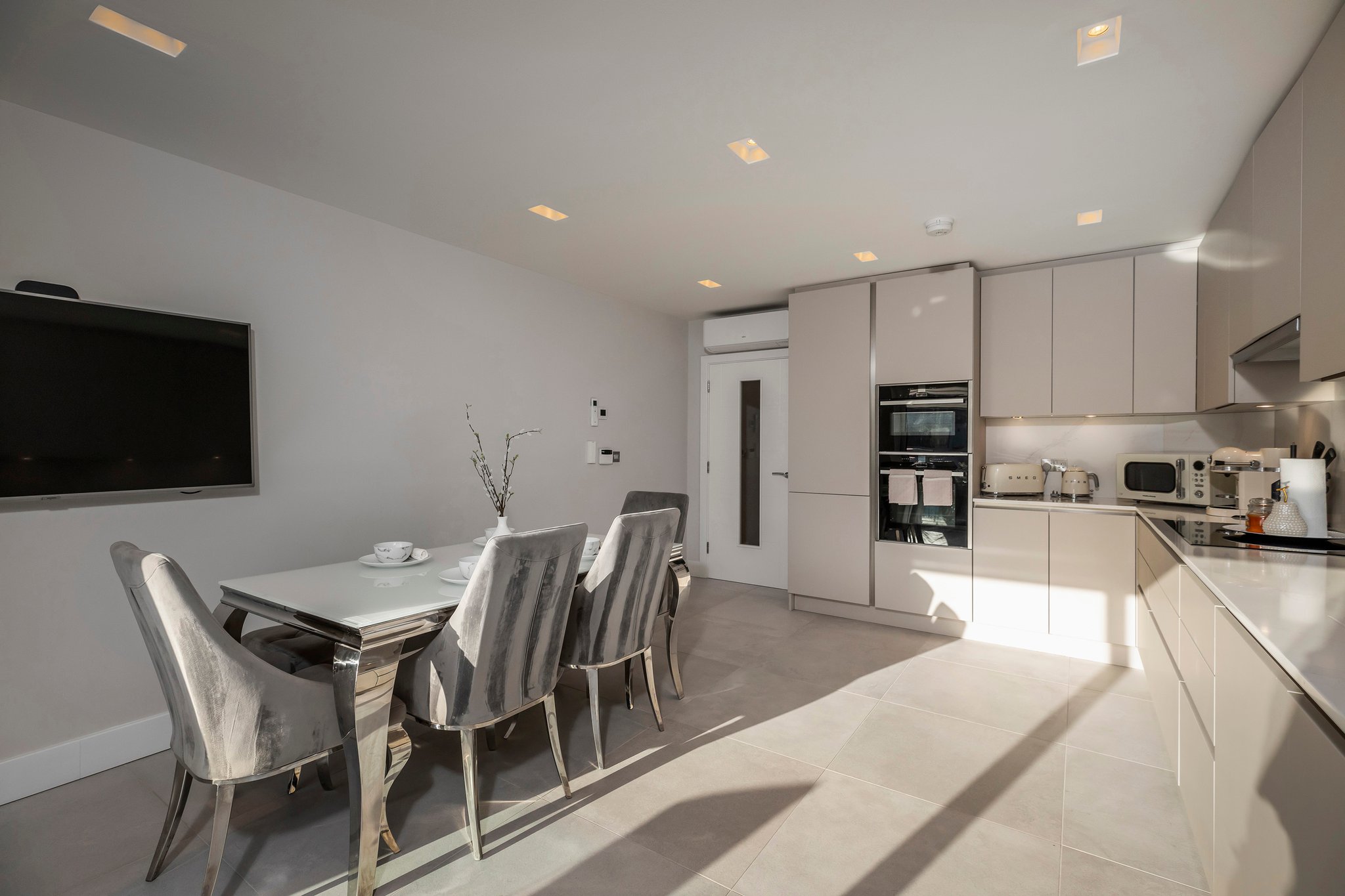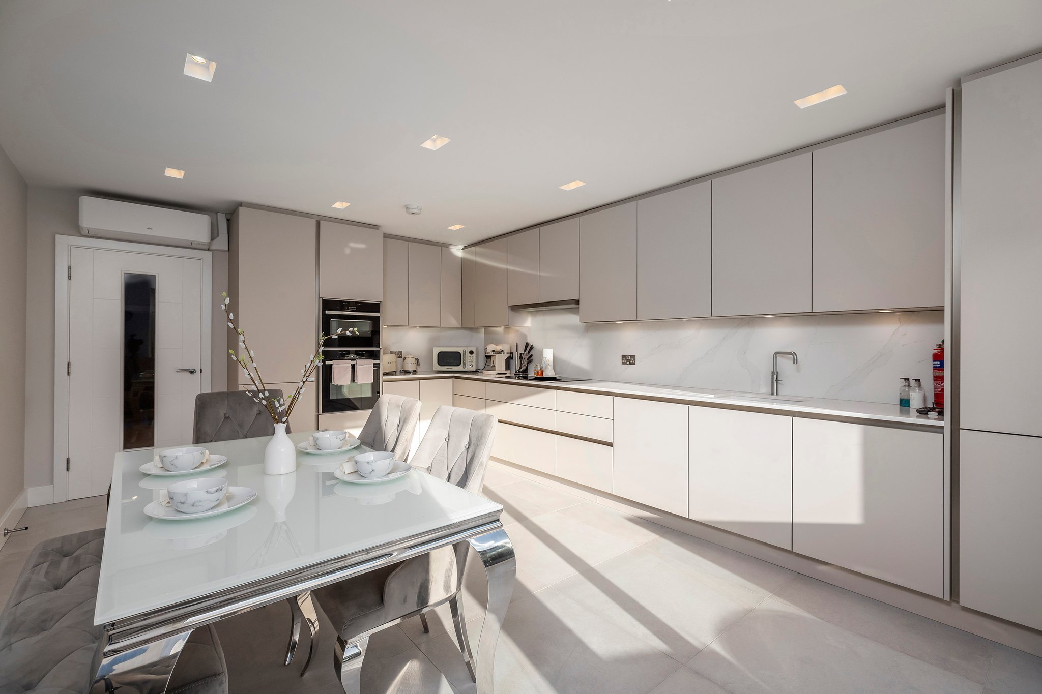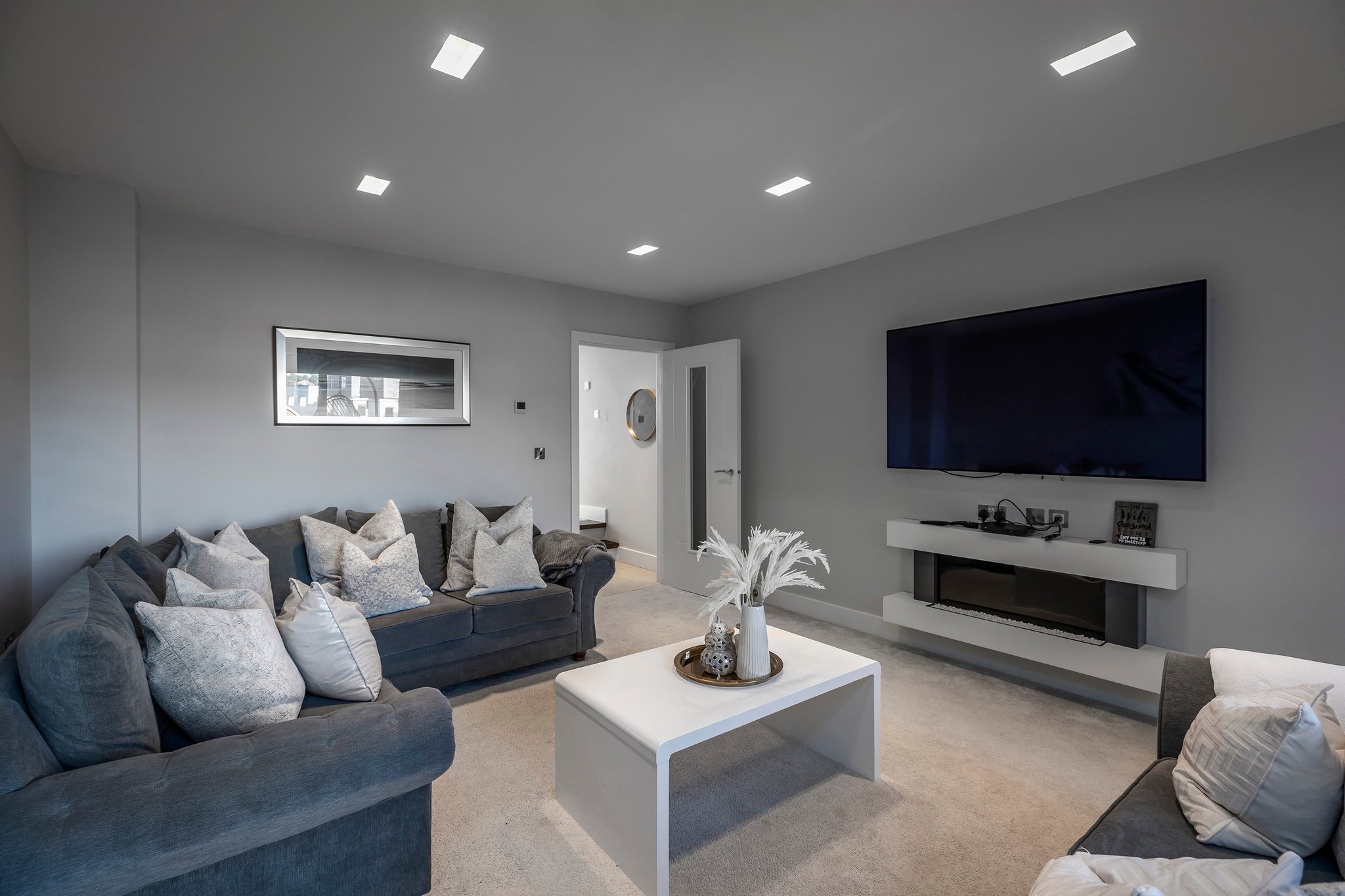 A stunning curved walnut staircase, with concealed LED lights, spirals upwards creating the core of the house. The first floor is dedicated to sociable living space. To the front is an impressive well-appointed sunny kitchen with a range of integral appliances and quartz worktop; floor-to-ceiling sliding patio doors lead onto the south facing balcony, from where you can see glimpses of the water. At the rear of the property is the living room with double doors out onto a good-sized balcony capturing westerly views of the sunsets over Poole Harbour. On the top floor a circular roof light complements the shape of the feature staircase, where there are two further ensuite bedrooms. The main bedroom boasts fitted wardrobes and a Juliet balcony with sea glimpses over Jazz Café and Old Harry Rock. The luxurious ensuite shower room is fully tiled and also features a large roof light. To the rear is another double bedroom with floor to ceiling windows. A side gate provides access to the rear garden, which has been designed for easy maintenance, with a sheltered patio and faux lawn. An outdoor shower is ideal for the water sport enthusiast with direct access into the garage. The property has been successfully holiday let for the last season, making it an ideal investment or to enjoy as a family holiday home.