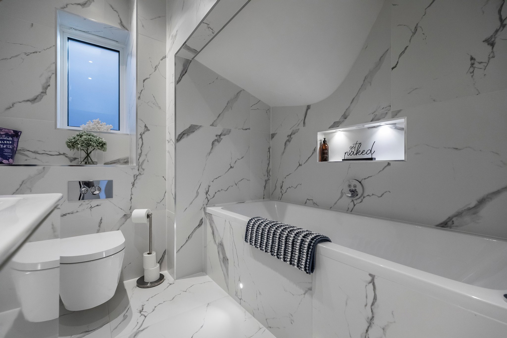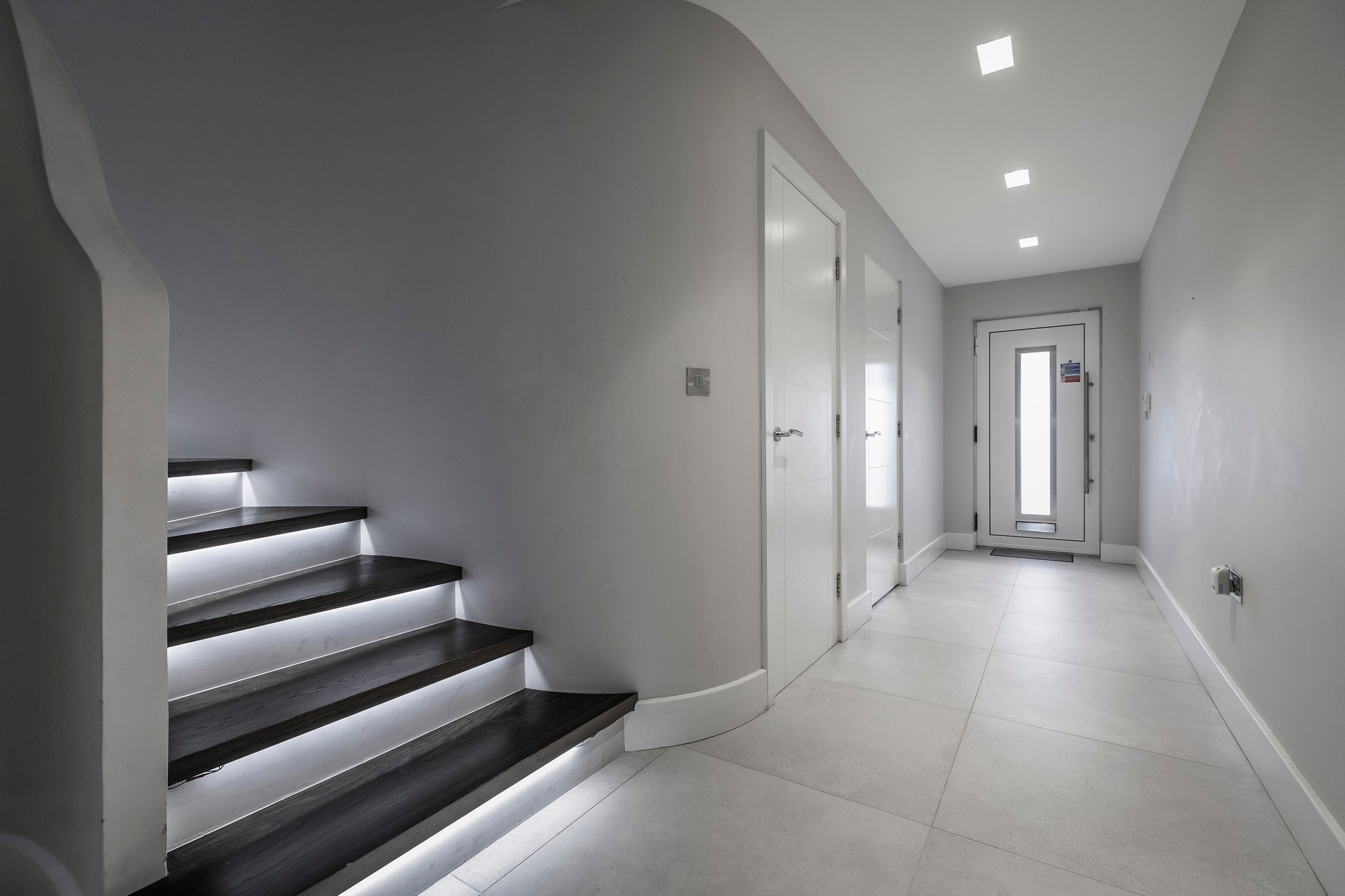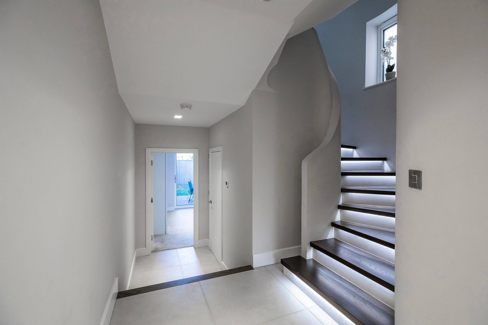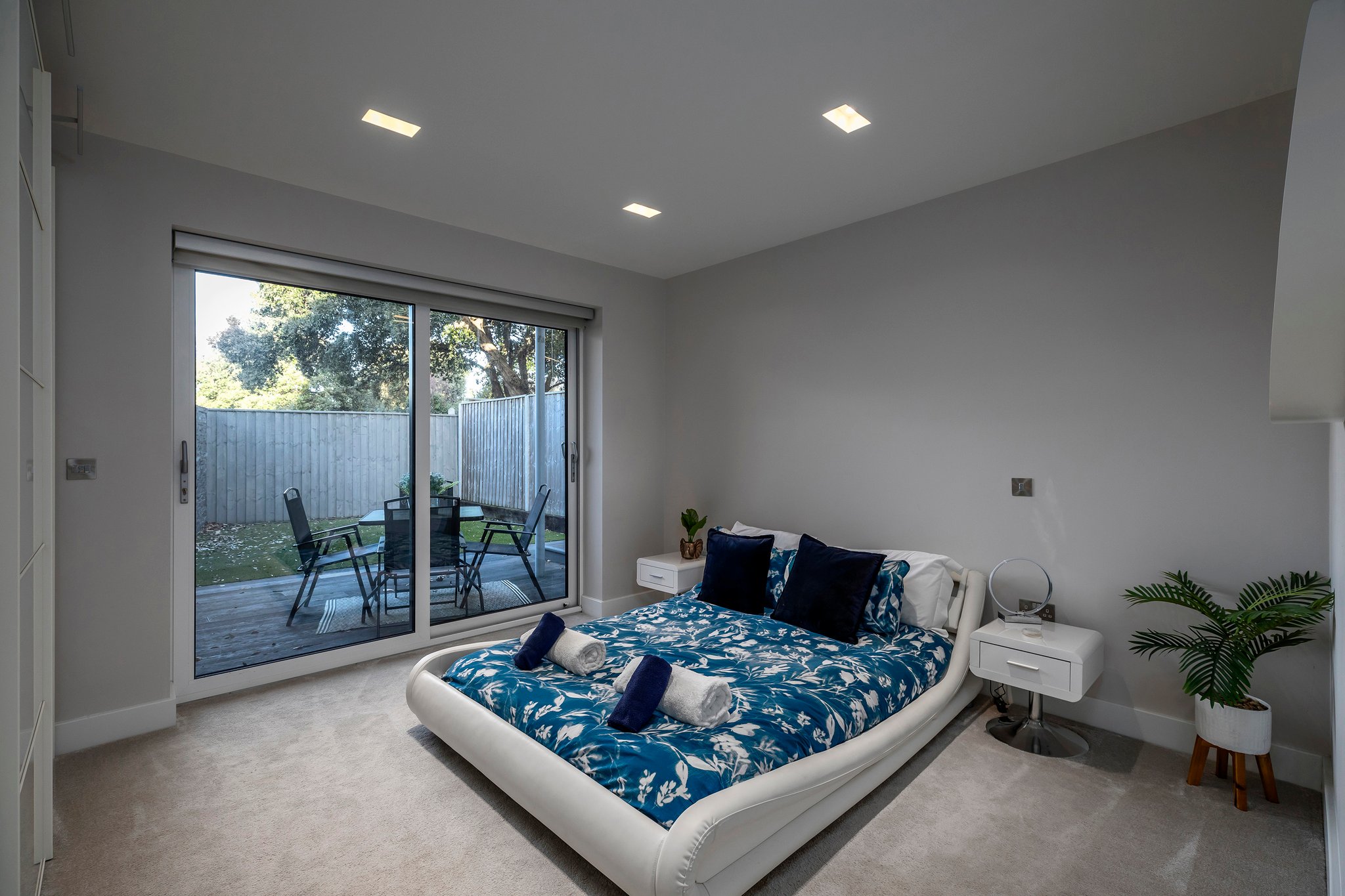 A bright entrance hall greets you as you enter this home from where you can see straight through to the garden at the rear. To your right, there is convenient direct access into the integral garage, which has an electric up-and-over door for vehicle access, and a side door to access the gated rear garden and outside shower. A utility cupboard houses the washing machine and tumble dryer. A guest bedroom is located to the rear of the ground floor with floor to ceiling patio doors leading onto garden. A family bathroom is beautifully appointed with marble tiling and a bath / shower.