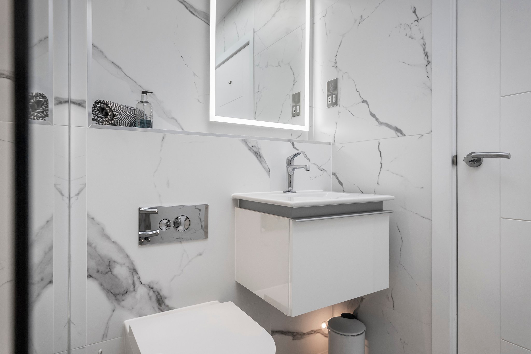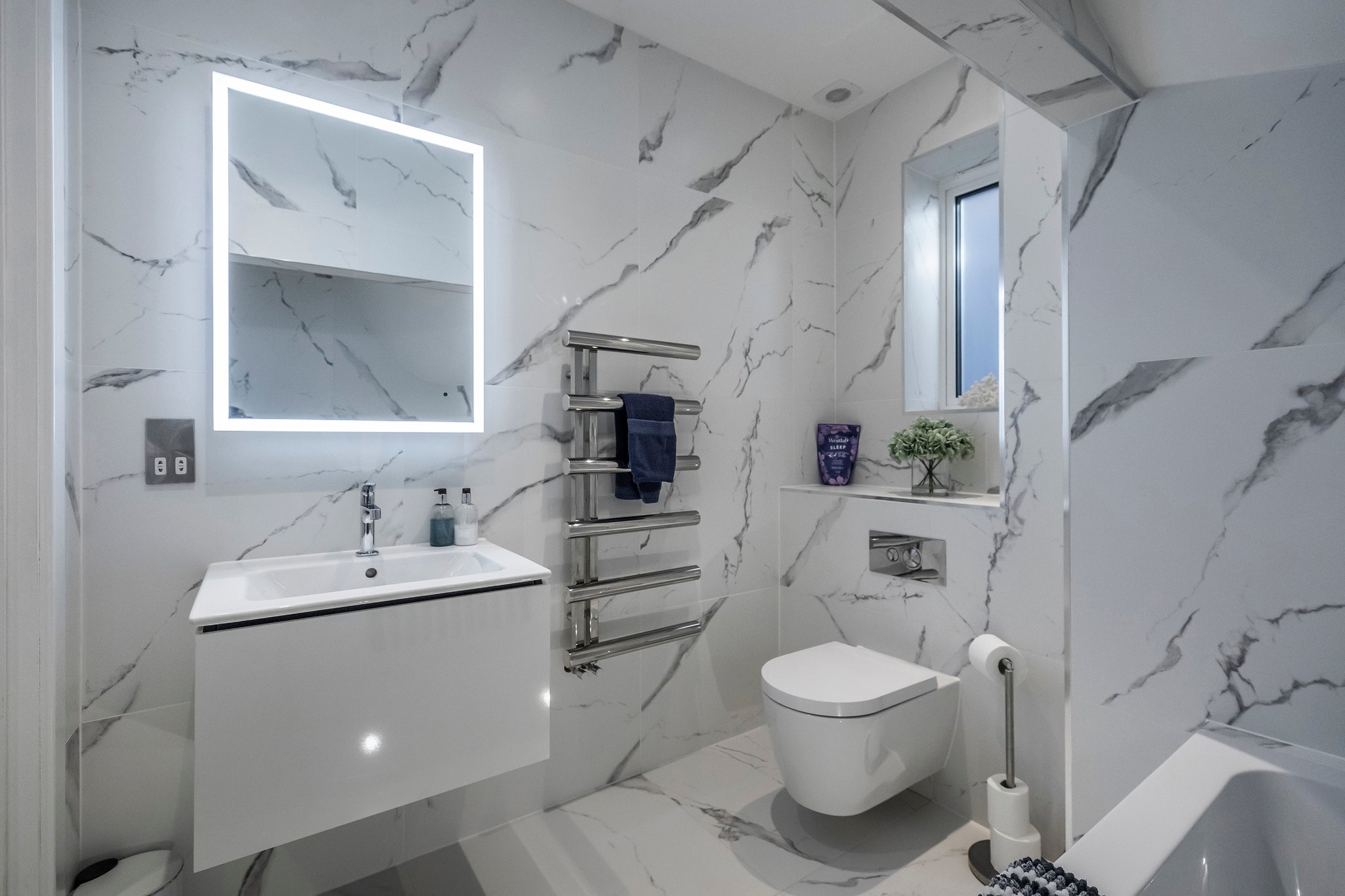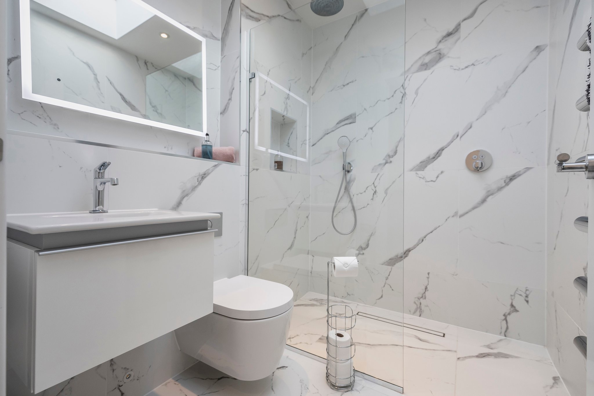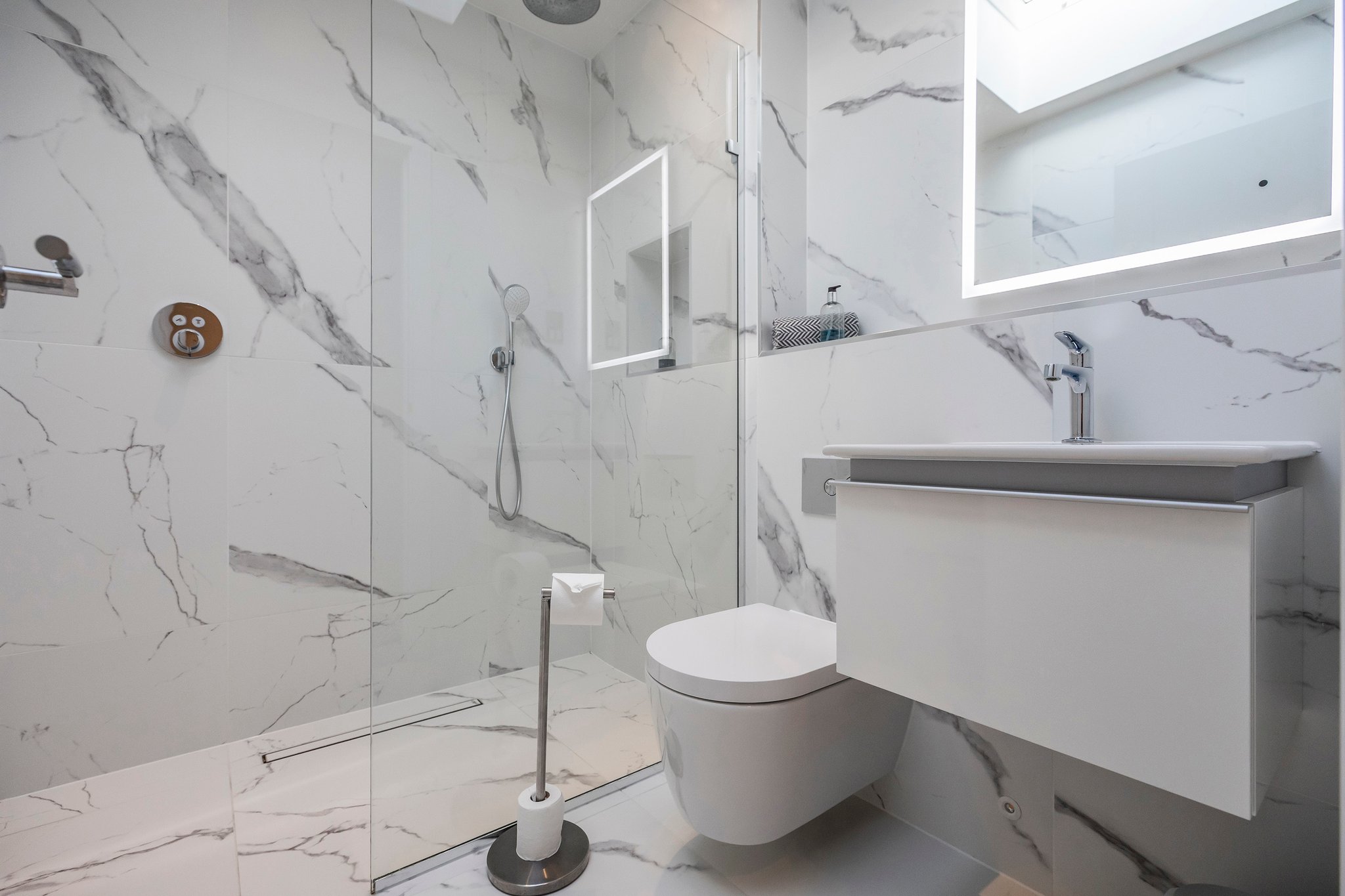 A bright entrance hall greets you as you enter this home from where you can see straight through to the garden at the rear. To your right, there is convenient direct access into the integral garage, which has an electric up-and-over door for vehicle access, and a side door to access the gated rear garden and outside shower. A utility cupboard houses the washing machine and tumble dryer. A guest bedroom is located to the rear of the ground floor with floor to ceiling patio doors leading onto garden. A family bathroom is beautifully appointed with marble tiling and a bath / shower.