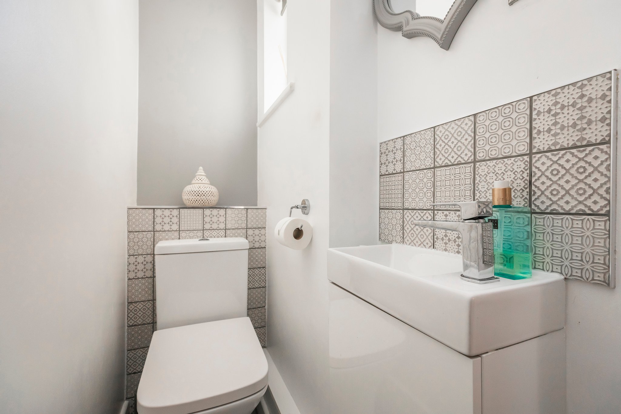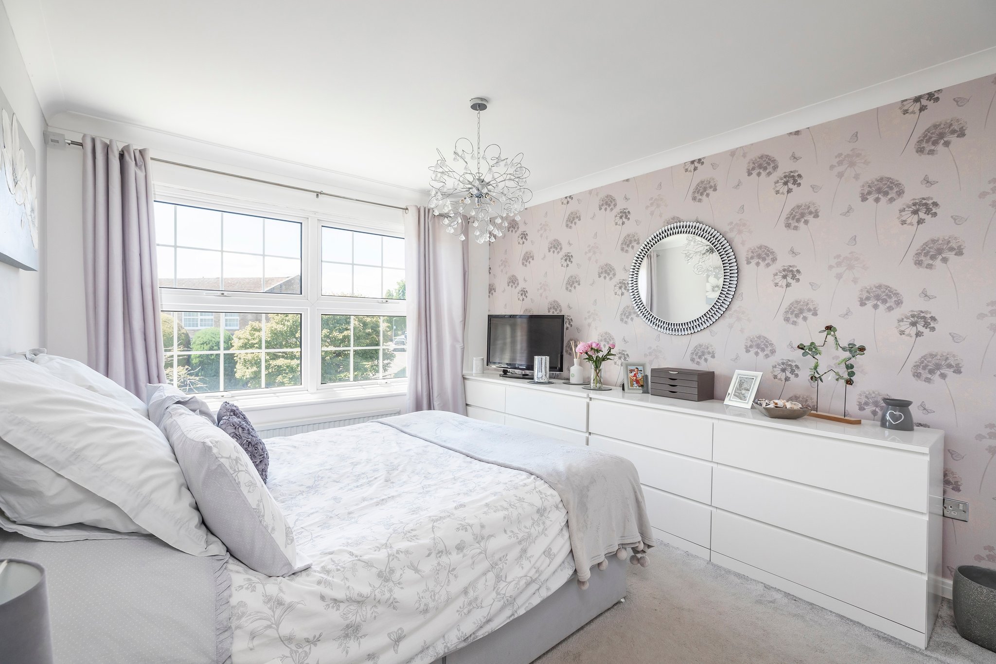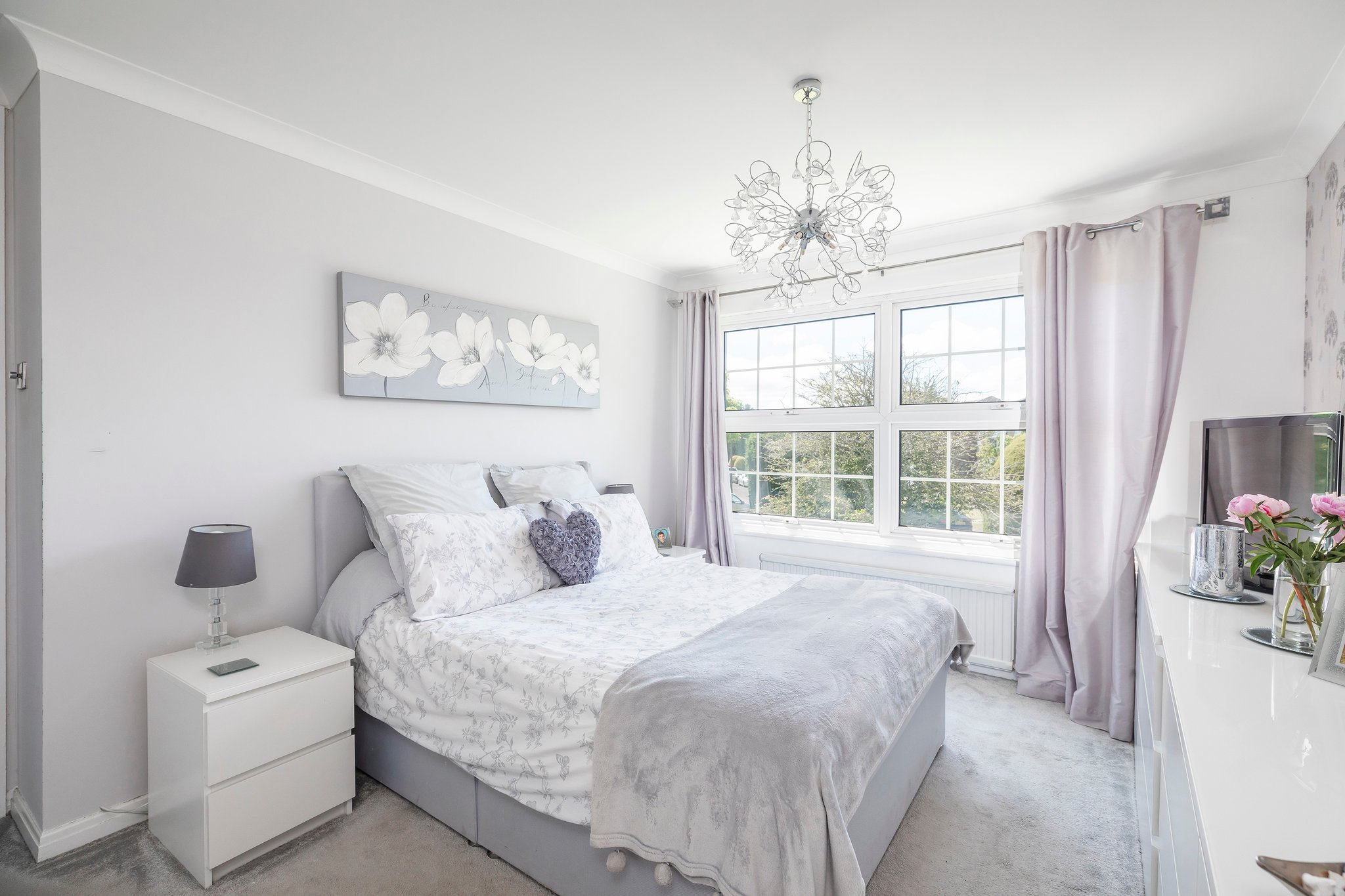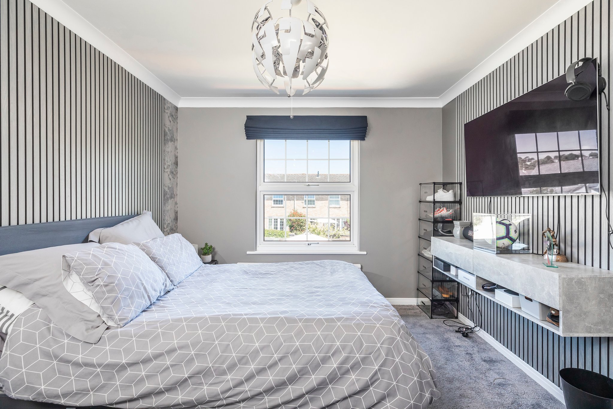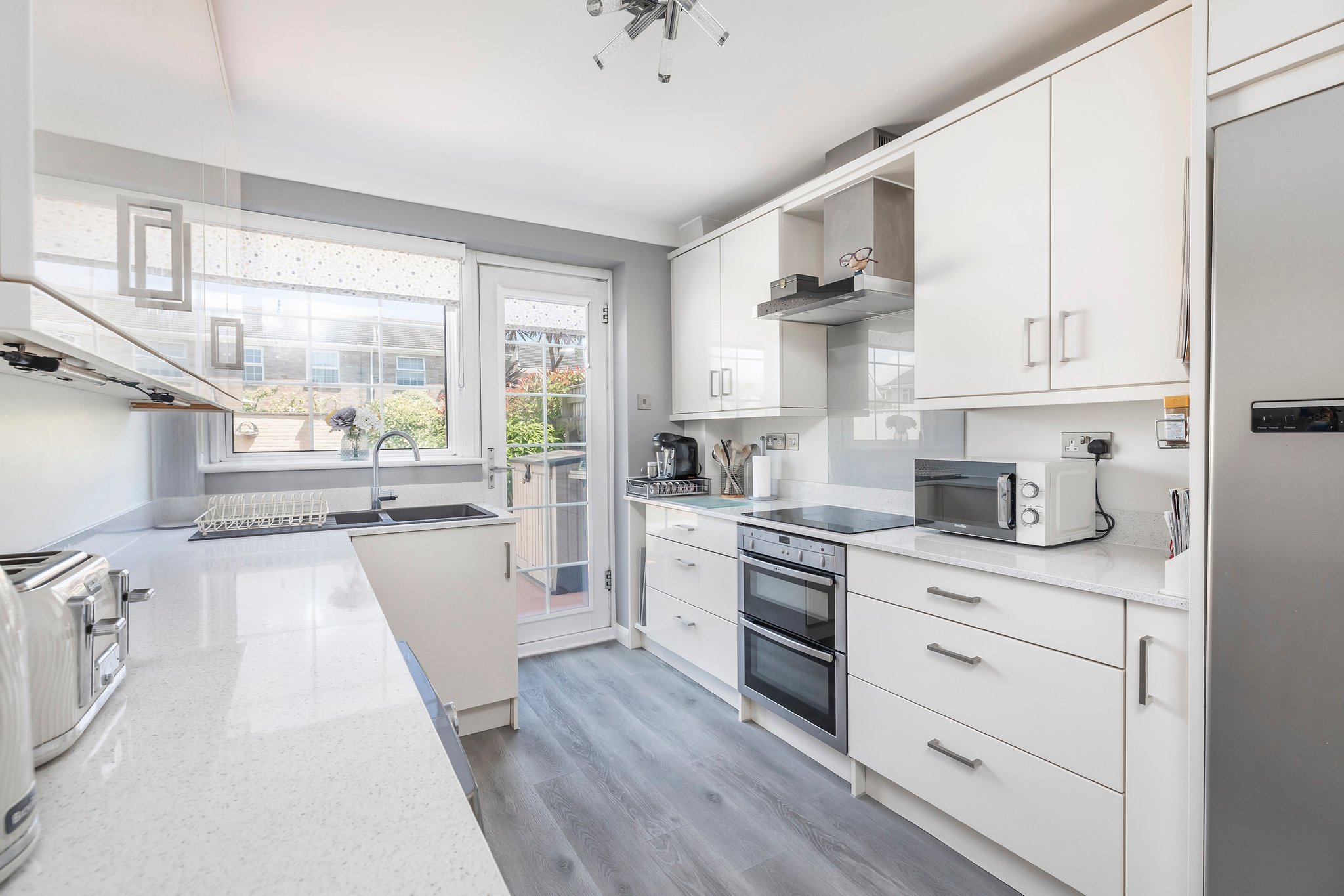 The inviting living room, with a low bay window, captures the afternoon and evening sun and overlooks well-tended communal gardens. Double doors lead through to the dining room with sliding patio doors giving access onto a seating terrace and rear garden. The kitchen features contemporary units complemented by laminate worktops, integral dishwasher, electric hob and space for an American fridge freezer and washing machine. Useful storage for coats and shoes can be found in the large under stairs cupboard and modern downstairs cloak room. On the first floor are three bedroom. The principal bedroom is spacious and features a wall of built in wardrobes and a large dressing table. The second bedroom has been designed in a contemporary fashion with a stylish headboard, built in bedside tables and matching wall hung side unit, and build in wardrobes providing plenty of well designed storage space. The third bedroom incorporates a deep built in wardrobe / storage cupboard, which sits over the stairs.