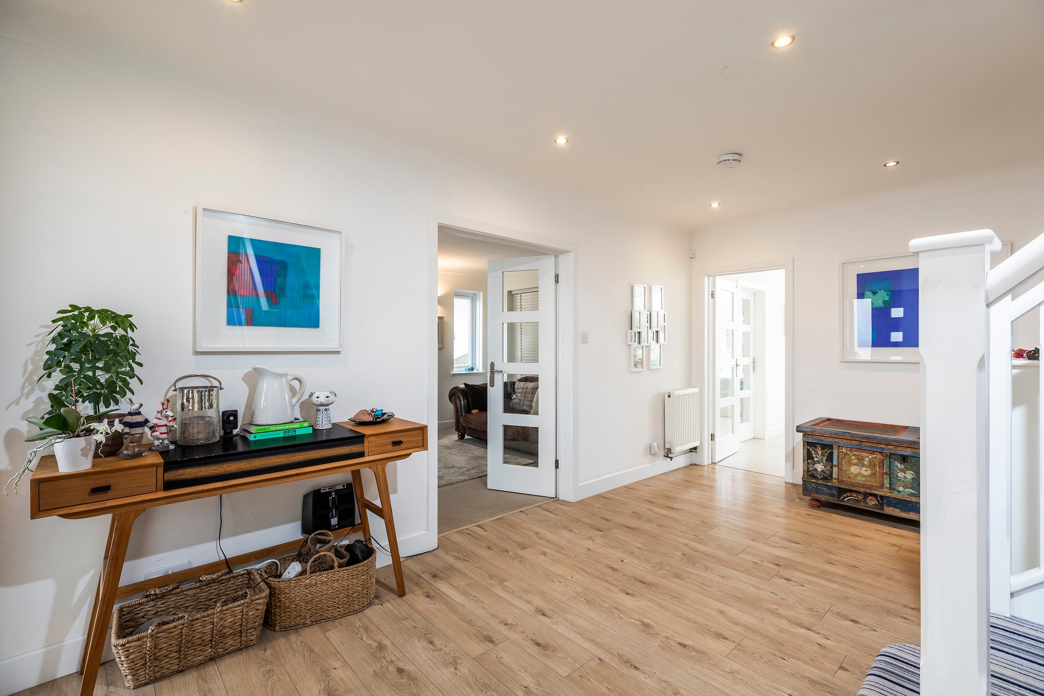 The spacious entrance hall sets the tone of this beautiful family home. Sitting central to all the accommodation with many storage cupboards and door to the utility. Without doubt, the heart of this property is the large open-plan kitchen/dining/family room with part vaulted ceiling and underfloor heating, providing direct access on to the patio and secluded lawned garden beyond. The bespoke designed kitchen is extensively fitted with white floor and wall mounted units, complemented by composite work tops. There are many high-end integrated appliances and an island unit with breakfast bar. Also on the ground floor, a more formal living room and separate family room with access to the garden. There are two double bedrooms on this level and a family bathroom, the larger of the bedrooms has a walk-in wardrobe which could easily be turned into an en suit if desired. A further two double bedrooms to be found on the first floor, the main bedroom with ample fitted wardrobes and views across open fields. There is a luxury fitted bathroom with a freestanding bath and double shower.