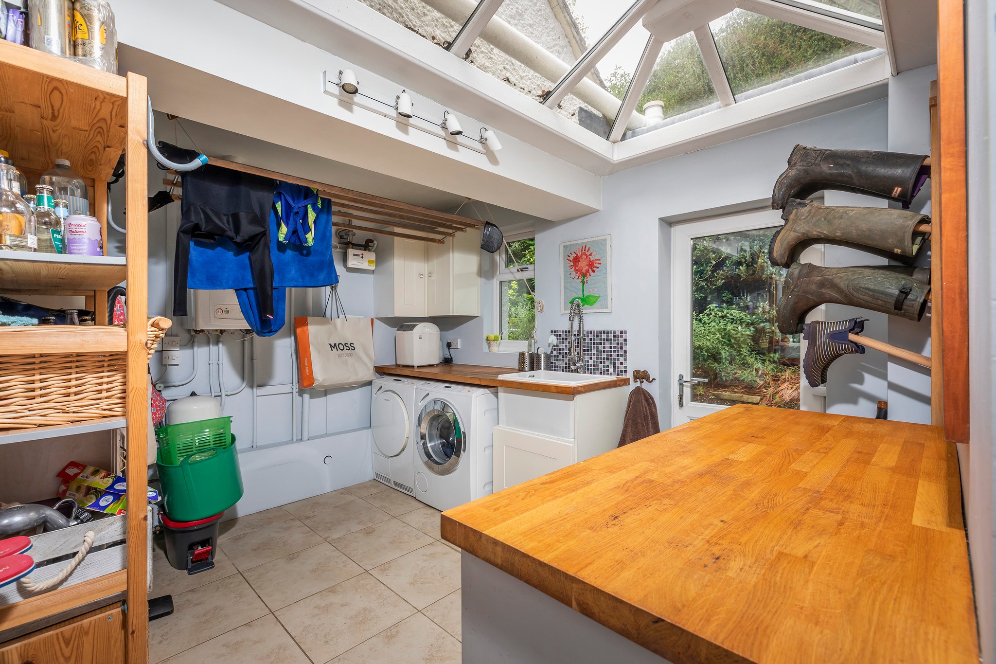 This character residence has a homely feel from the moment you step into the spacious hallway and are greeted by a piano and a feature wood staircase to the upper floors. Double doors lead into the kitchen / snug / dining, where your eyes are drawn out to the green vista of the far-reaching lawned garden. To your right is a modern kitchen with recessed handles and a large central island featuring a granite worktop and solid oak breakfast bar. An opening connects through to an orangery that is home to a relaxed dining space complemented by Purbeck stone flooring and graceful planting. On the south side of the ground floor, is a double sized reception room divided into a formal dining zone and a main lounge area centred around a cosy wood burner. Two sets of double doors open out onto a large patio, spanning the width of the house, where summer entertaining takes place. A downstairs utility, cloakroom and two further reception rooms, currently used as a gym and office/day room, complete the ground floor.