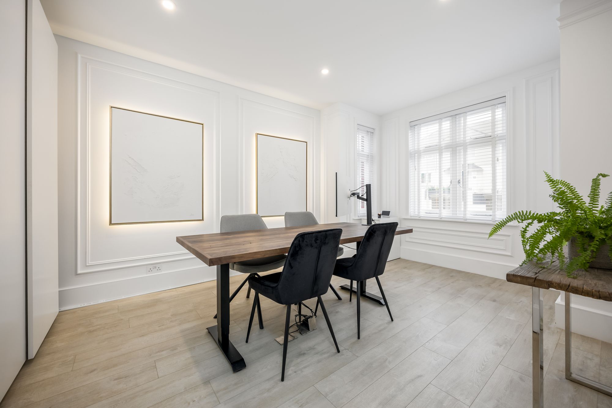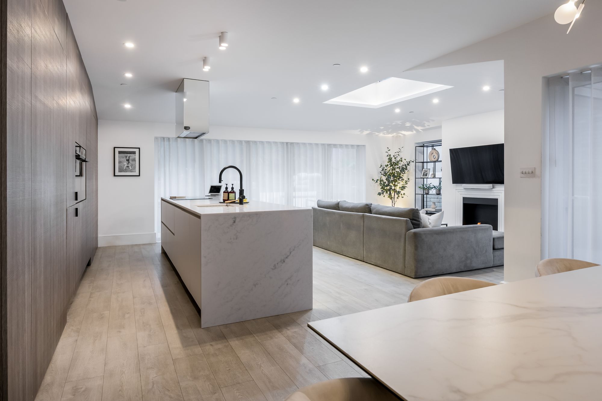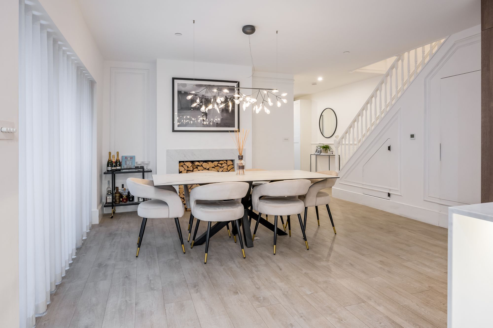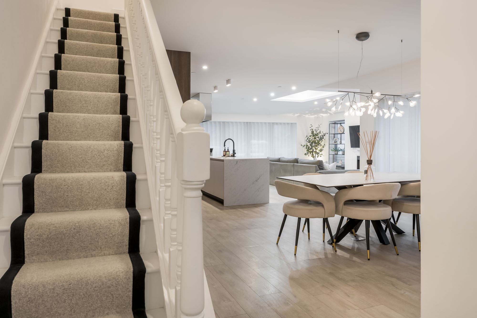 Step inside to discover a spacious hallway wwith recessed lighting and plush carpeting, setting the tone for the inviting atmosphere found throughout the home. The ground floor features two generous reception rooms, including a stylish open plan kitchen and living area. Here, a modern kitchen island with a sleek marble finish, integrated appliances, and ample storage serves as the heart of the home, perfect for family gatherings and entertaining. The dining area is defined by a modern chandelier and a decorative fireplace, creating a warm and welcoming space for formal dining or relaxed meals.