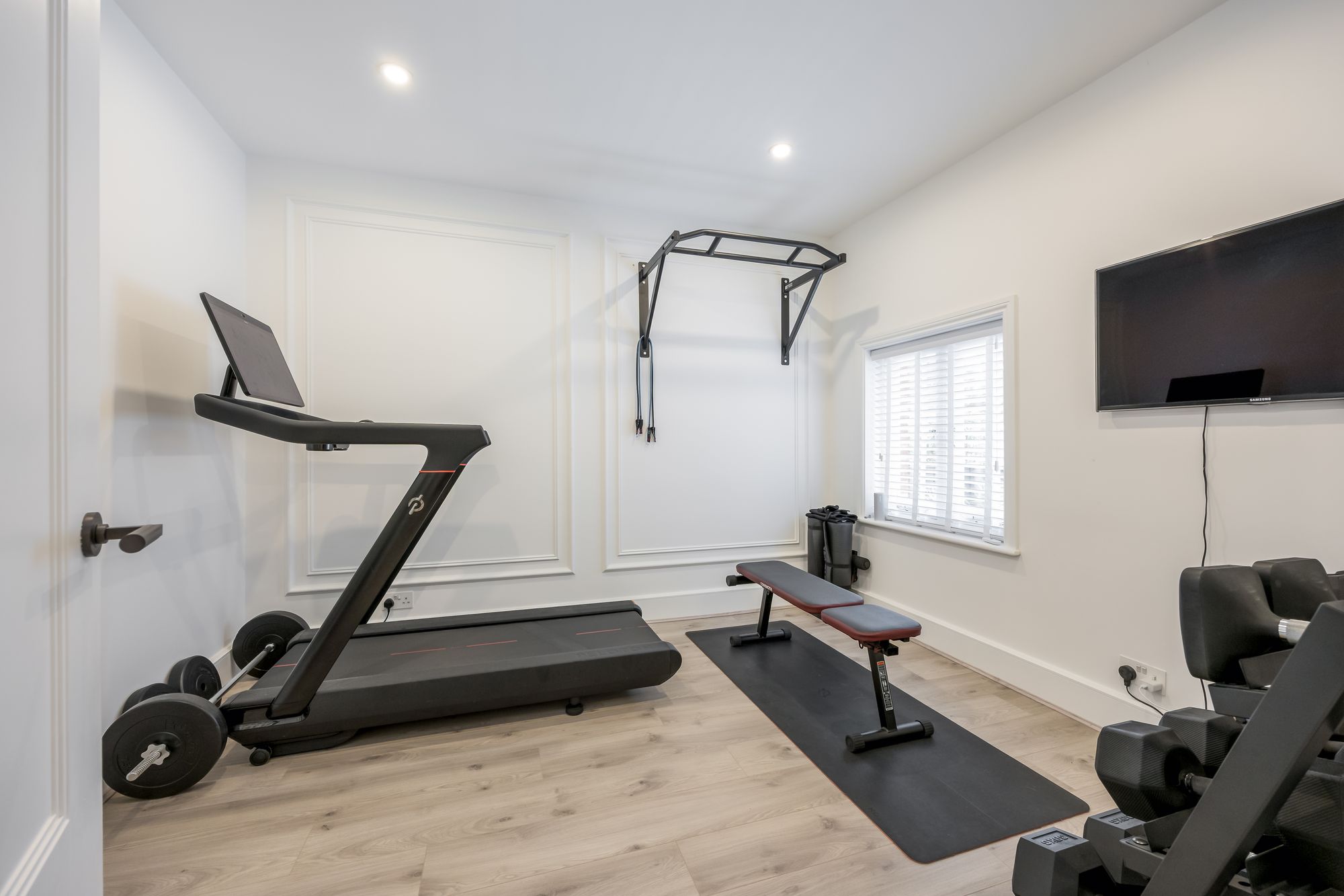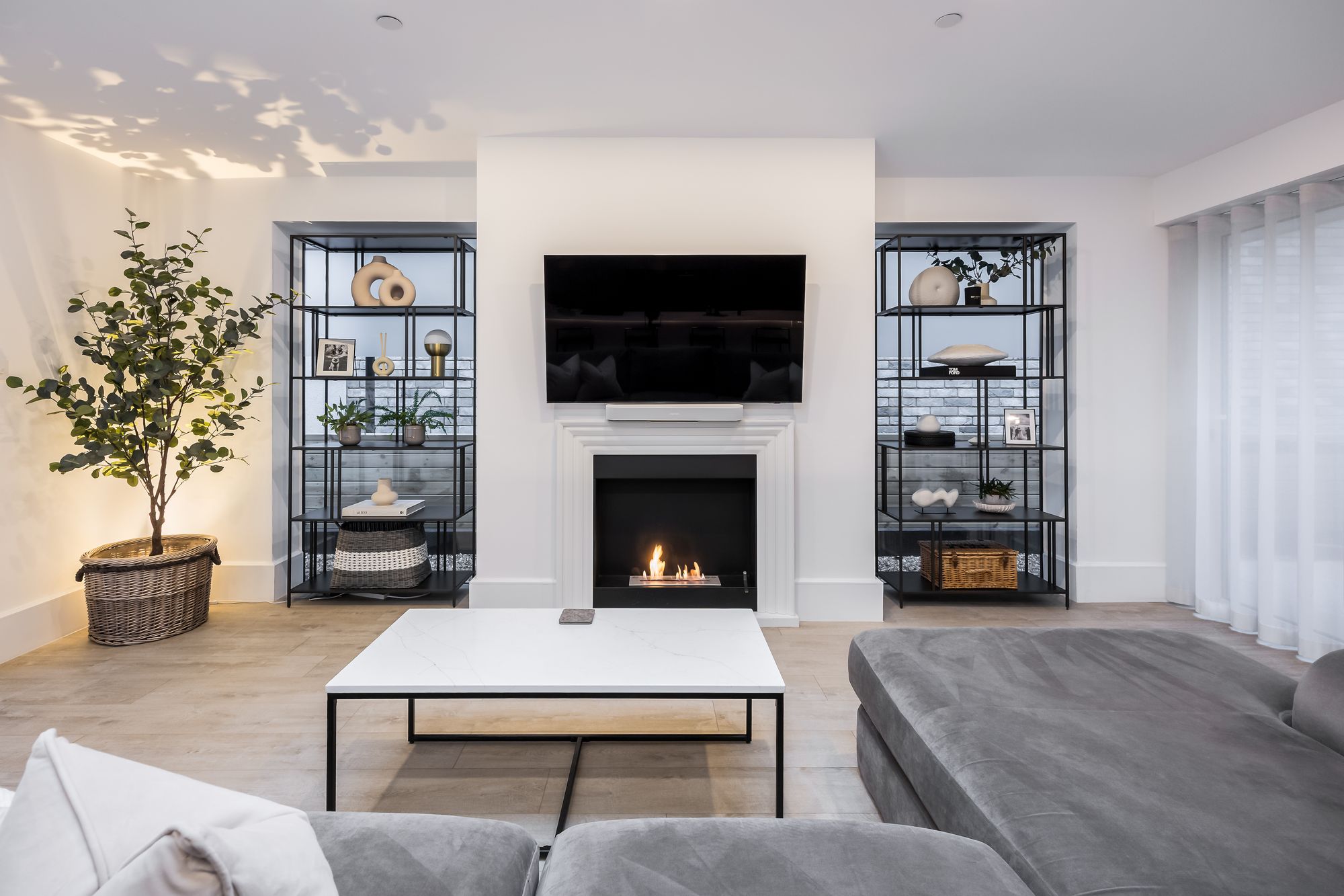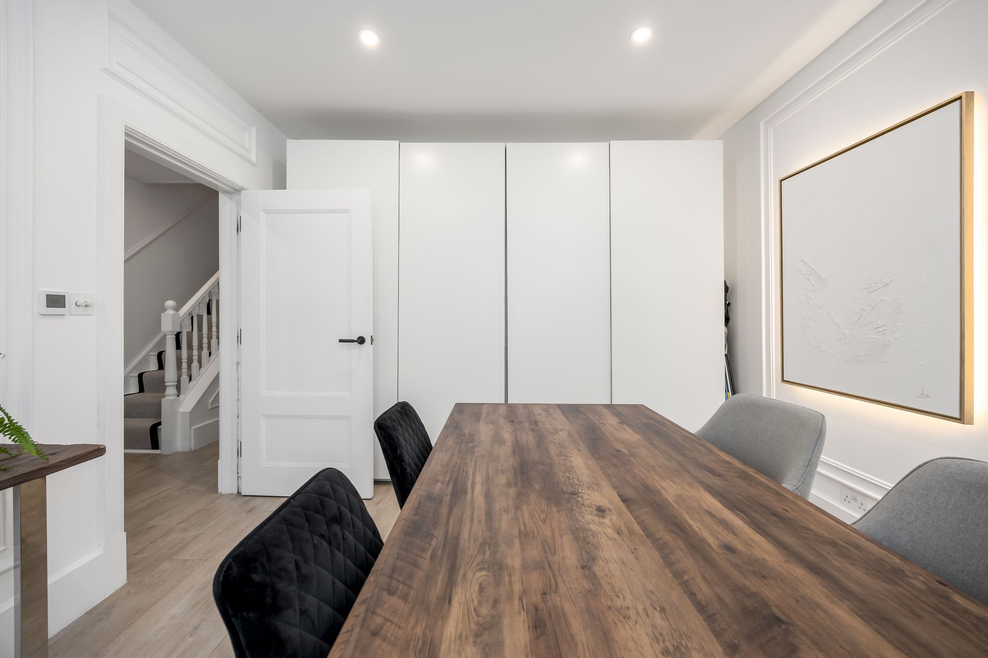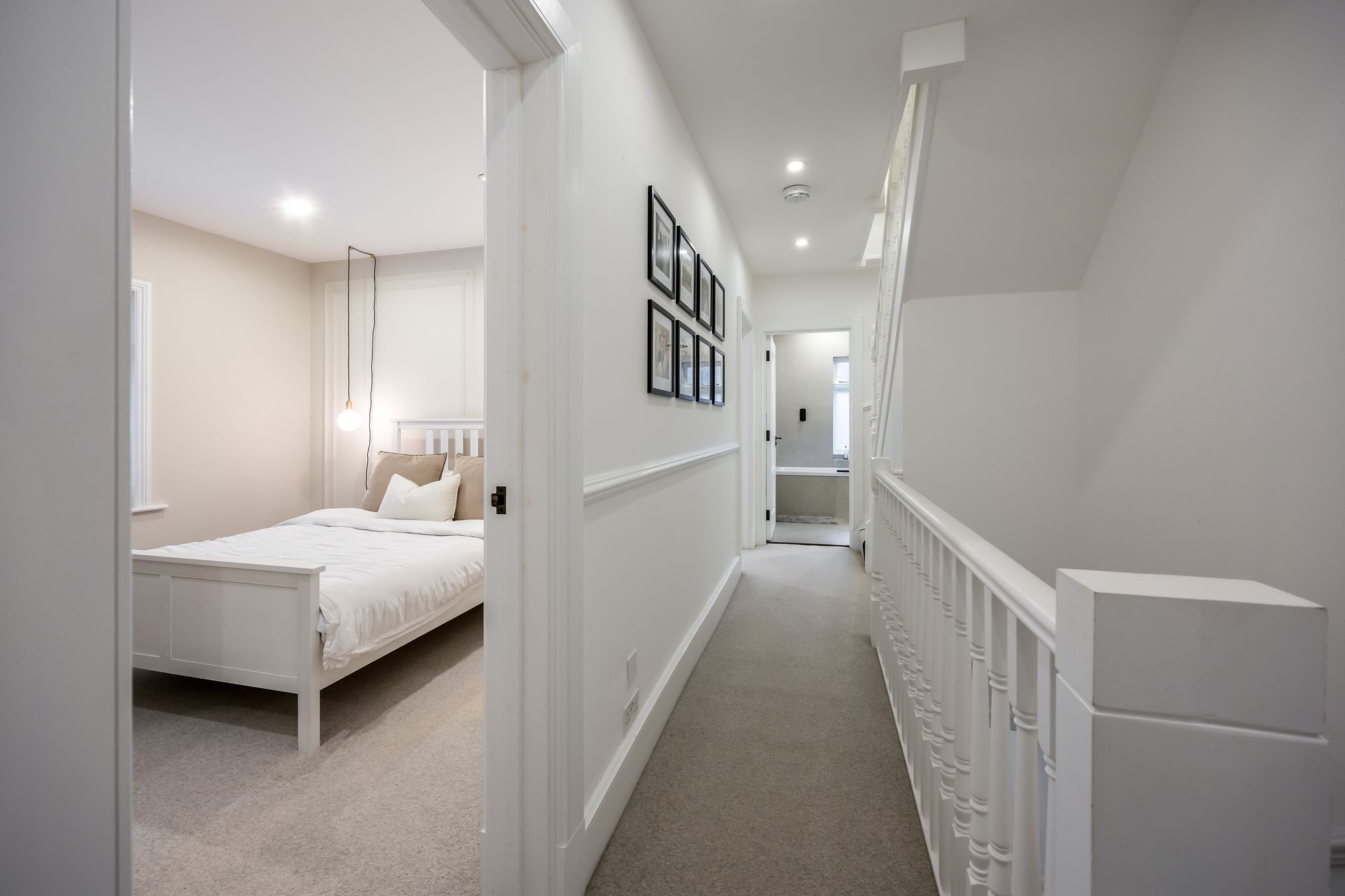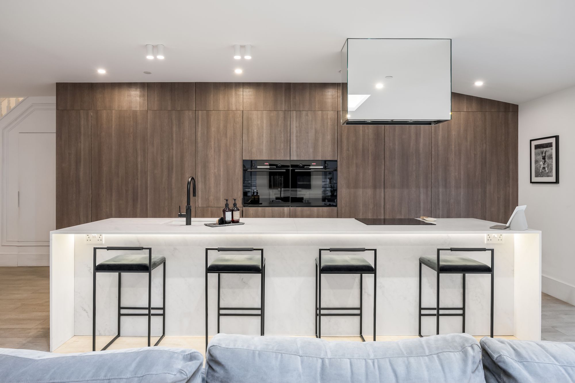 Step inside to discover a spacious hallway wwith recessed lighting and plush carpeting, setting the tone for the inviting atmosphere found throughout the home. The ground floor features two generous reception rooms, including a stylish open plan kitchen and living area. Here, a modern kitchen island with a sleek marble finish, integrated appliances, and ample storage serves as the heart of the home, perfect for family gatherings and entertaining. The dining area is defined by a modern chandelier and a decorative fireplace, creating a warm and welcoming space for formal dining or relaxed meals.