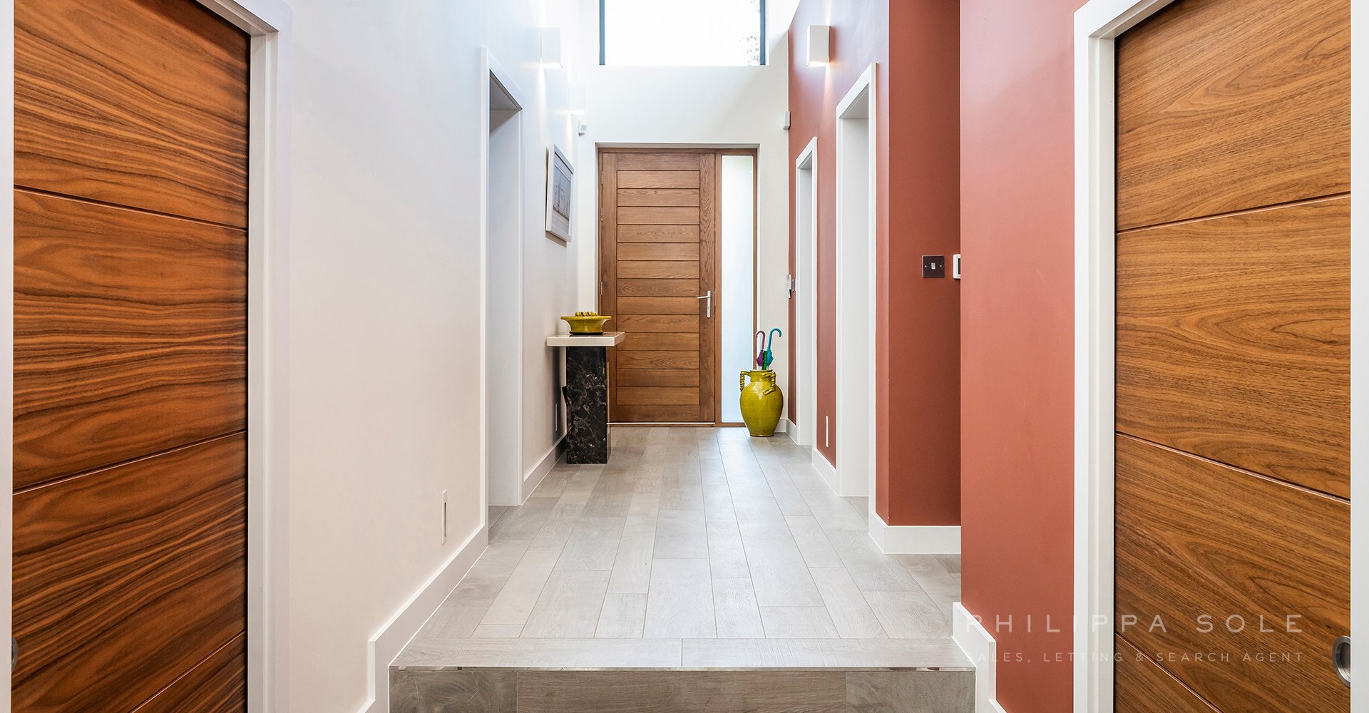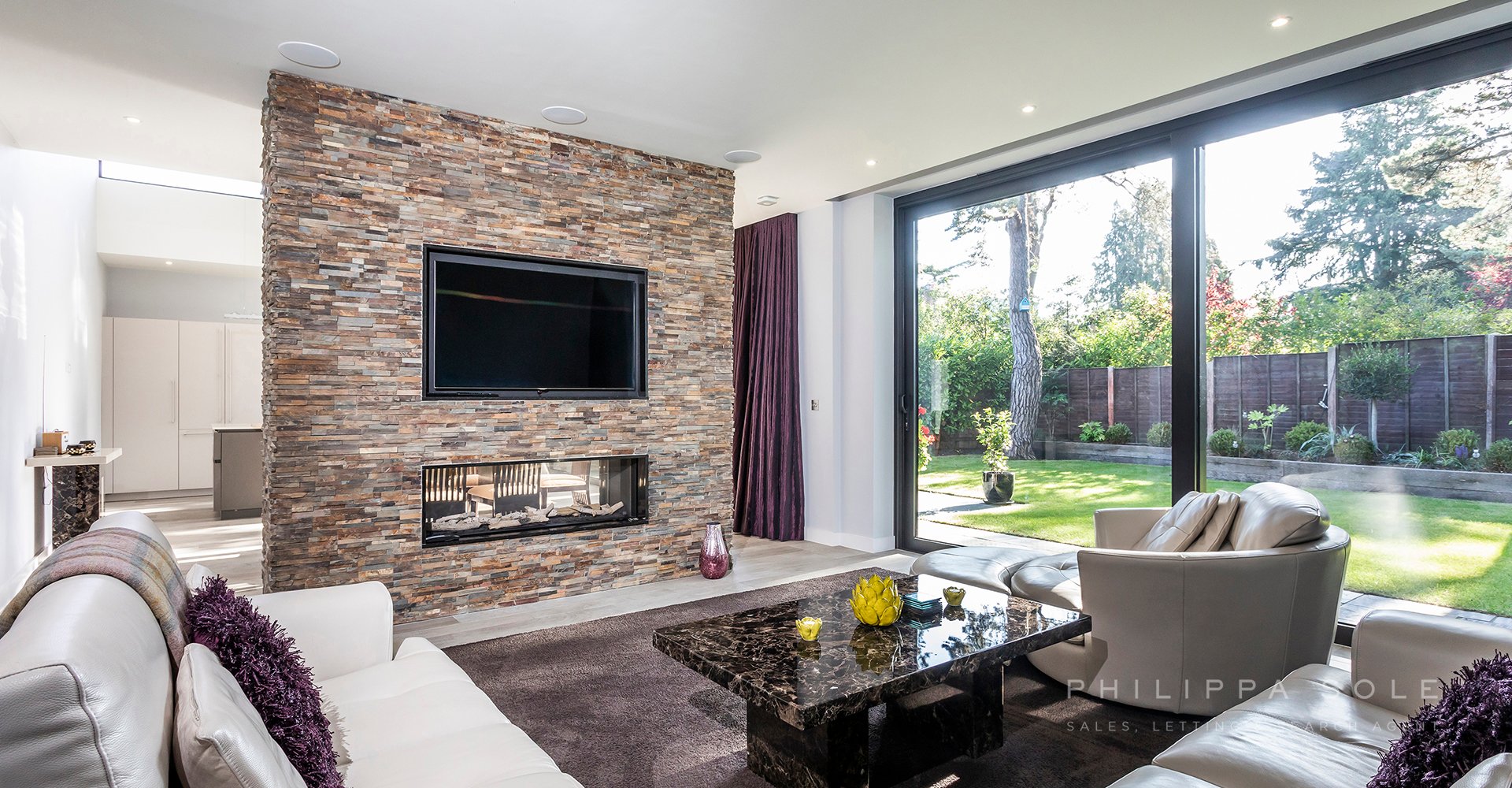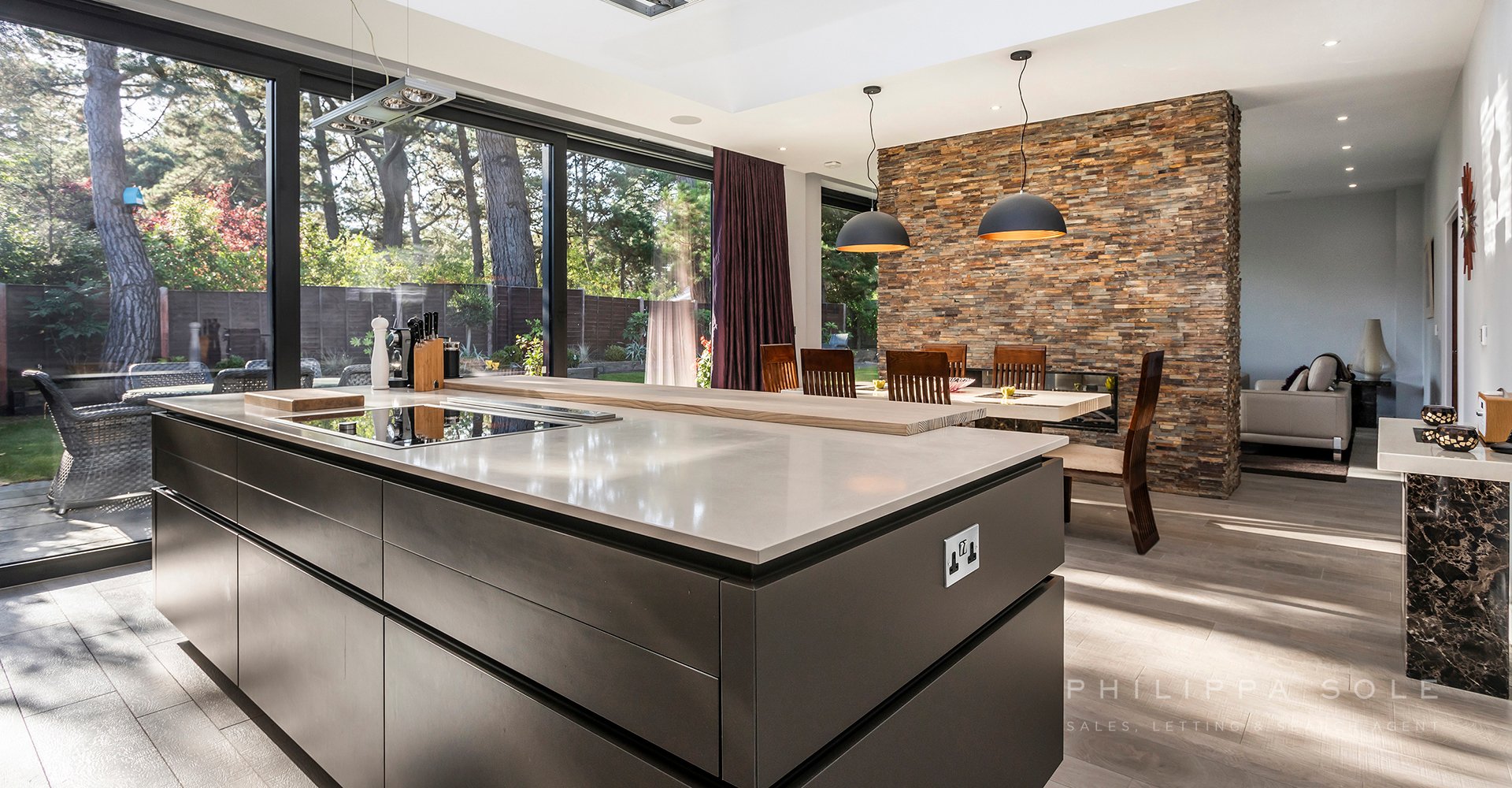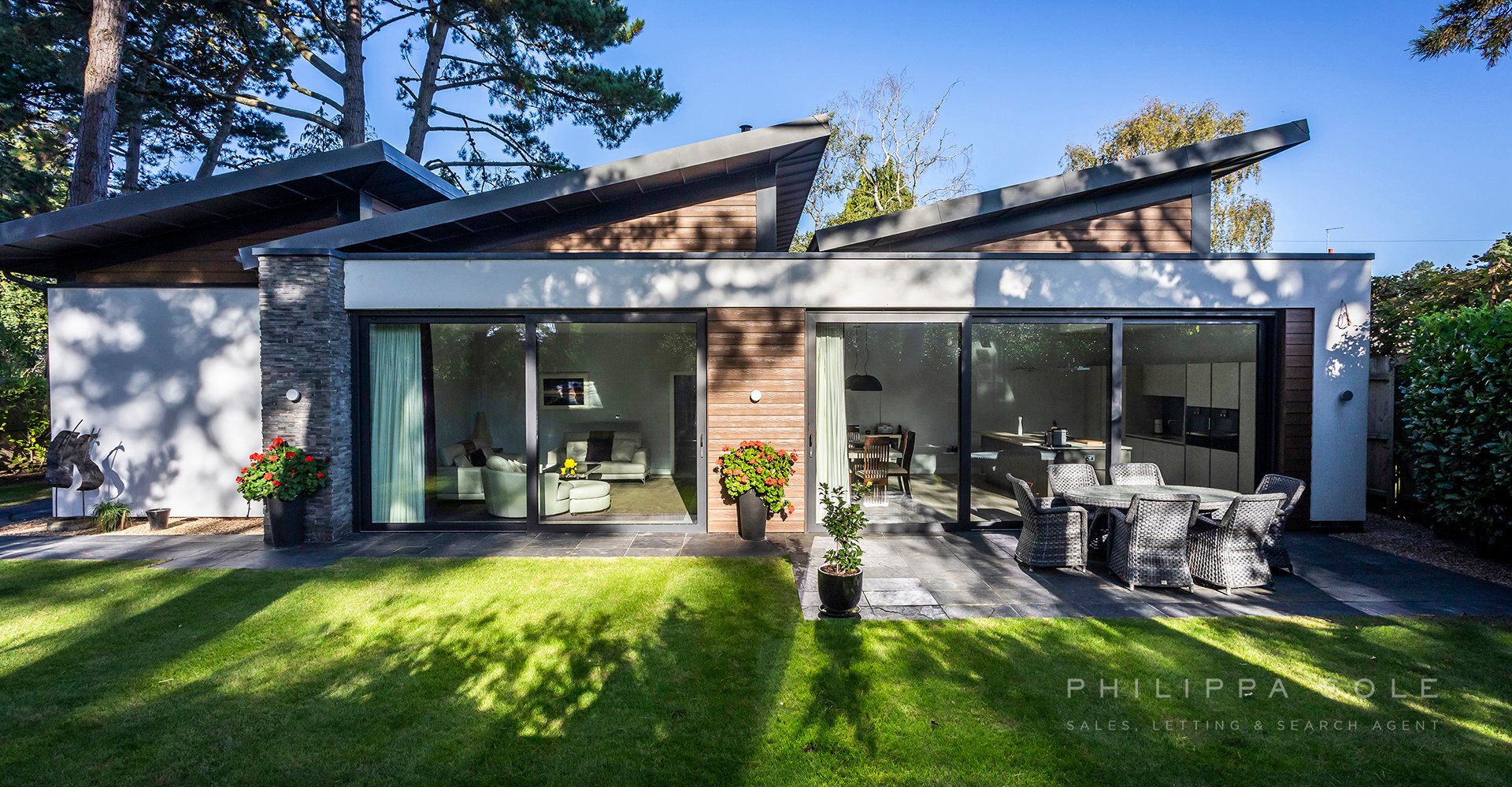 This stunning architecturally designed home was constructed five years ago and is truly unique in its offering locally, boasting a perfect blend of contemporary living with high quality materials, providing a wonderful feeling of warmth and space. When you enter the spacious entrance hall, your eye is immediately drawn through the property to the rear garden. The large open-plan kitchen / dining / living room spans the width of the house and is flooded with natural light from its part-vaulted ceiling and full height set of sliding doors which occupy the whole of the rear of the property. The modern kitchen is by "kitchen Elegance" and  is seamless with a range of built-in Gaggenau appliances including a double opening fridge as well as two pull-out larders. The large central island and breakfast bar provides relaxed dining with space for more formal dining beyond. A striking stone clad wall features a beautiful gas fire which is visible from both the kitchen and living room, and cleverly divides the two areas. Discrete pocket doors divide this space from the entrance hall. The utility room houses a washing machine and tumble dryer and opposite this is a large storage cupboard. The stunning master bedroom boasts tall ceiling heights with attractive roof lighting. The beautifully tiled en-suite features a walk-in wet room. The dressing room is fully fitted with a range of open hanging and shelving units. Bedroom two offers full height fitted wardrobes and its own luxurious en-suite, whilst bedroom three offers a versatile space and is currently used as an office with built-in fitted wardrobes. From the kitchen, a seamless threshold leads to a slate patio and landscaped garden which is mainly laid to lawn with some established raised borders. A second patio catches the evening sun which wraps around the side of the property, where there is ample space for additional garden storage sheds and provides access to the driveway. The attached garage is plastered with an electric roll door. A block paved driveway provides off-road parking for several cars secured by an electric sliding gate. The property has been designed to require minimum maintenance, making it an ideal second home.