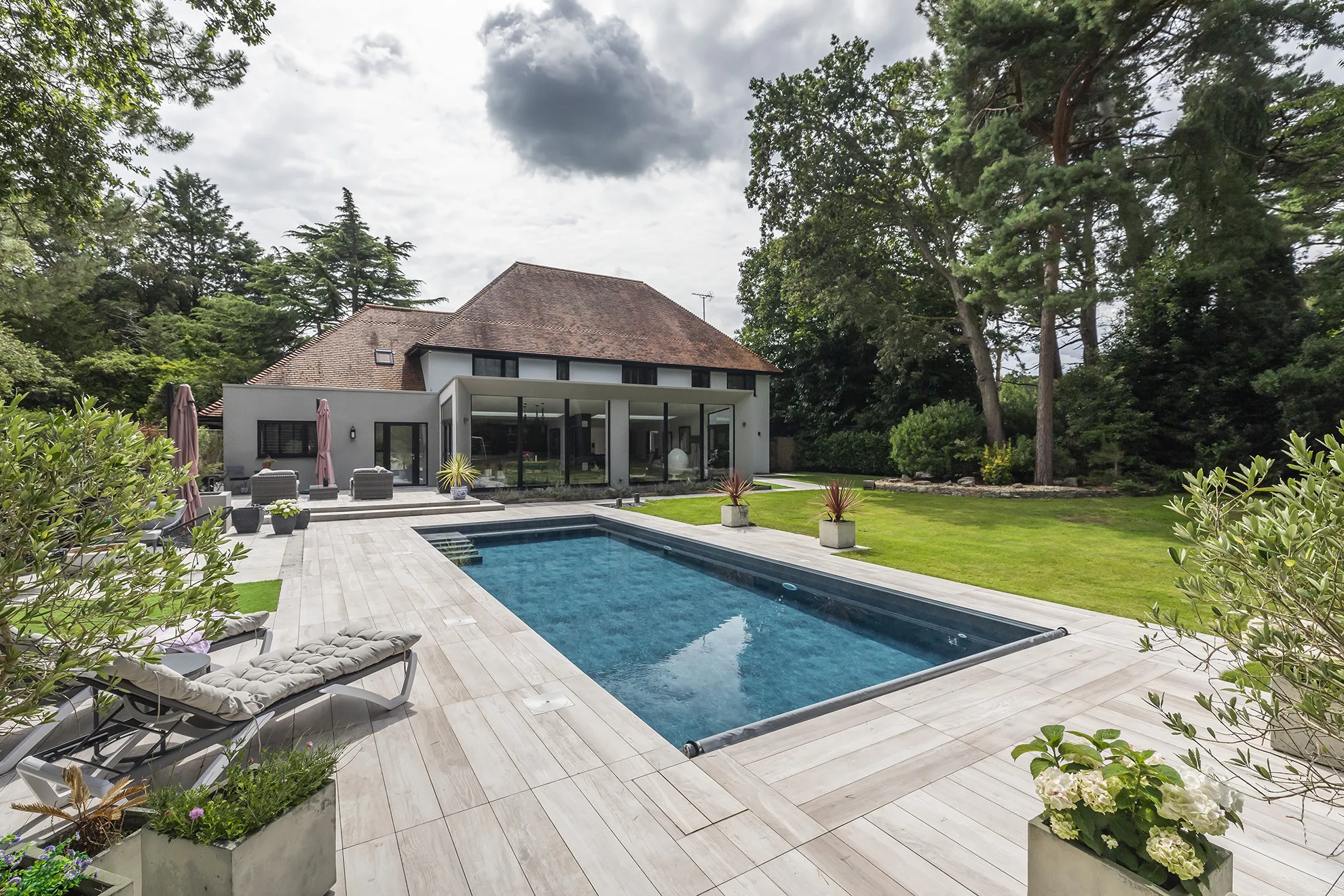 Outside is a fabulous 10x4m swimming pool complete with LED lighting and a walk-on safety cover, and large Italian porcelain tiled entertaining patios, served by music from the multimedia TV, video and music system that runs throughout the property. An outdoor shower and direct access from the patios into the utility and ground floor shower room complete the lifestyle design of the property. A double garage and driveway island allows for easy drive in / out access.