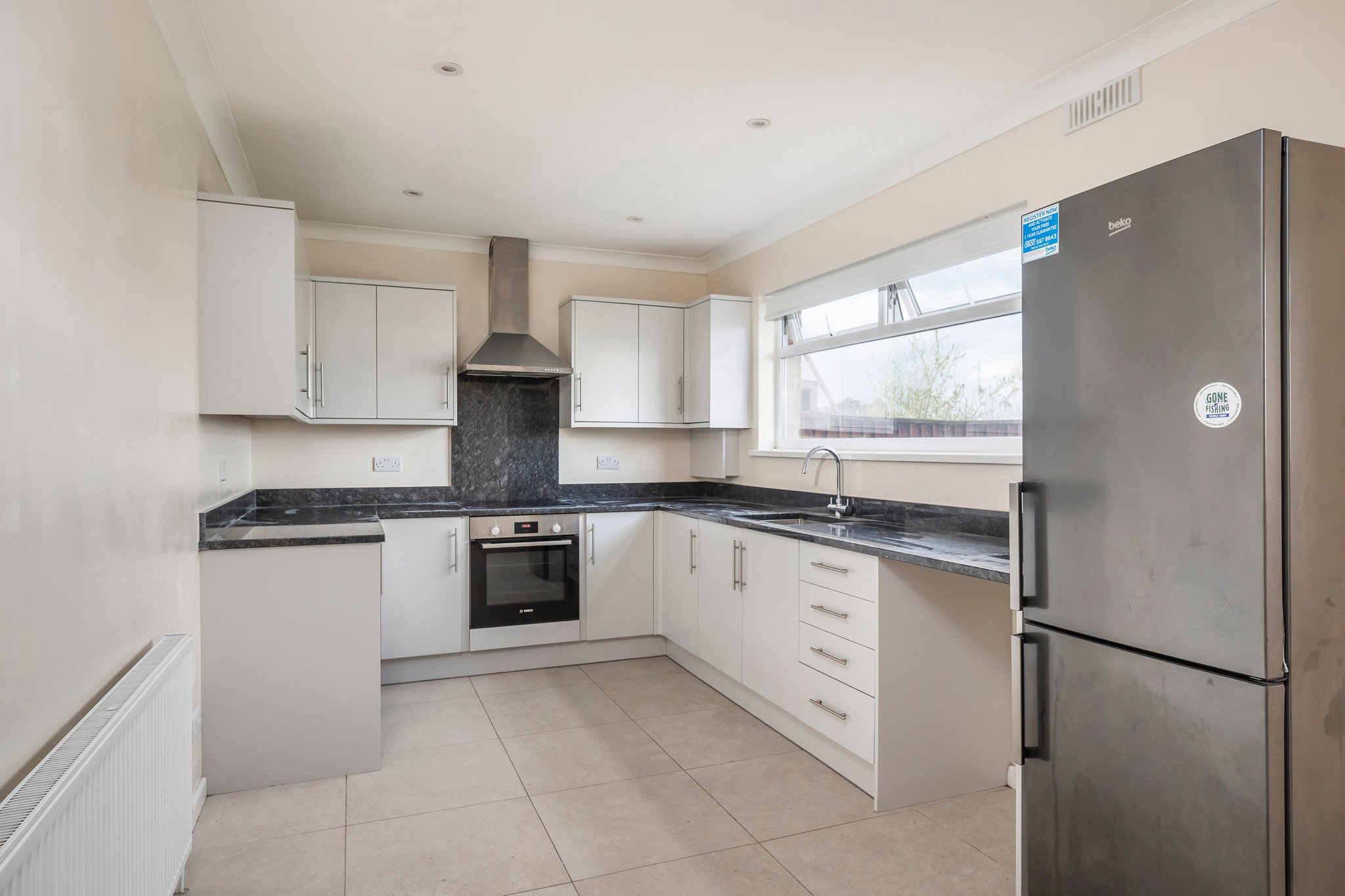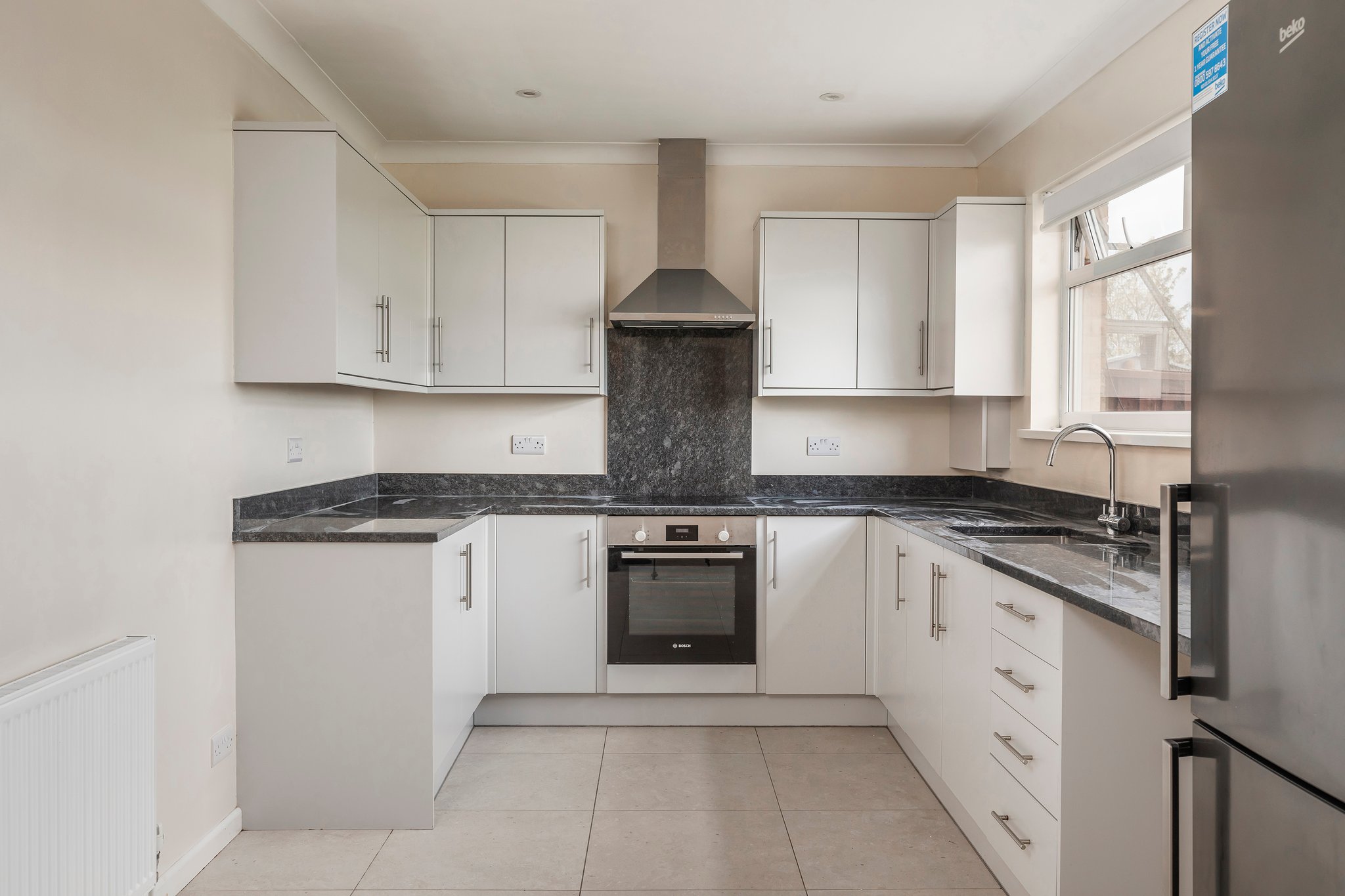 The contemporary kitchen is fully fitted with grey units and lovely granite worktops. From the kitchen, there is a side access door leading to the garden. Mainly laid to lawn with a paved patio area to the rear of the house, the garden is perfect for outside dining and entertaining.