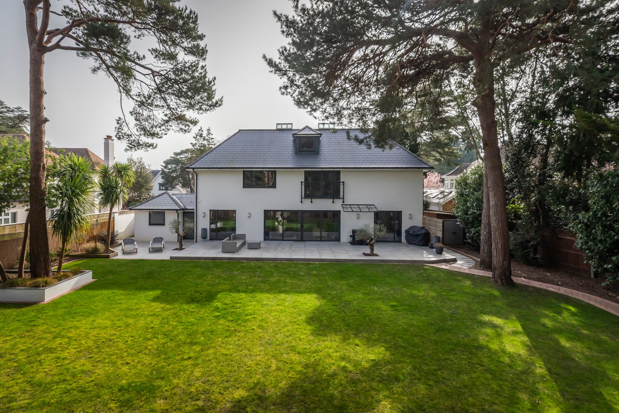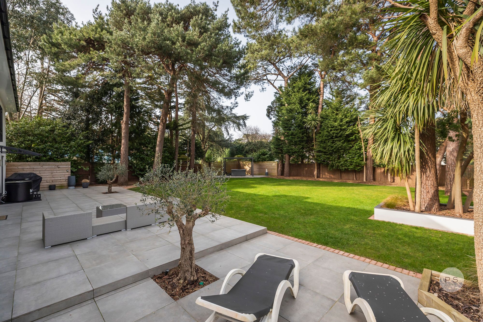 The landscaped garden offers manicured lawns, terraces and a hot tub area, creating a private setting for entertaining, with the convenience of a large external furniture and cushion room.