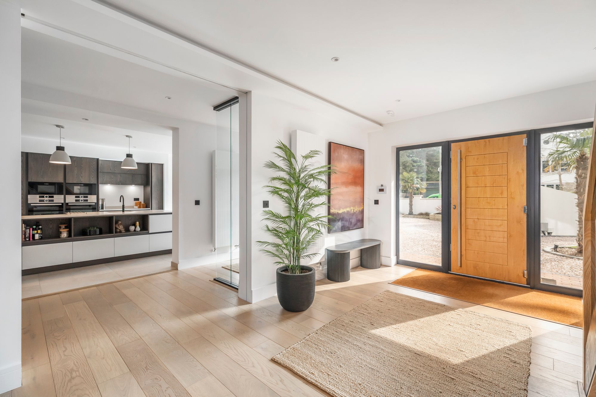 A wide gated driveway provides generous parking and leads to the integral double garage. The entrance opens into a broad reception hall where natural light and balanced proportions immediately establish the tone.