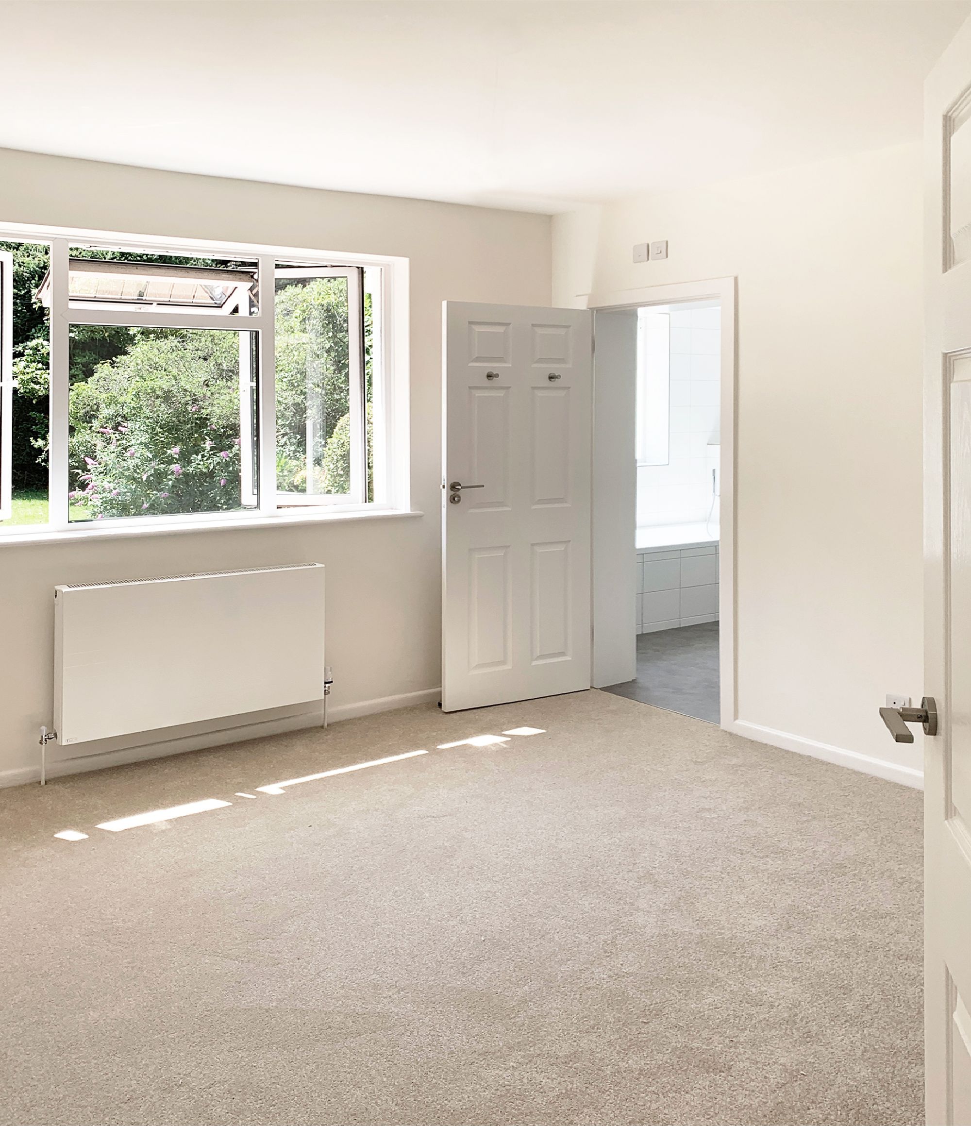 To the rear, the spacious living room overlooks the garden and benefits from direct access outside, ideal for indoor-outdoor living. The accommodation is completed by three bedrooms, two of which benefit from fitted wardrobes. The principal bedroom features a newly fitted en-suite bathroom, complemented by an additional shower room and a separate WC.