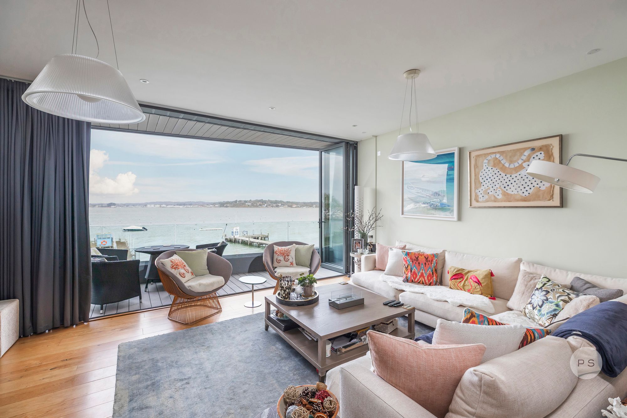 Approached through a private gate into a sheltered Mediterranean style courtyard designed for low maintenance and all day sun, the house opens into a series of light-filled living spaces arranged across gentle changes in level, all oriented towards the magnificent views over the harbour. The kitchen sits naturally at the centre, designed as a social hub with space to gather, cook and dine, while full-height glazing draws in the water beyond. From here, the living spaces soften and unfold, stepping down into more relaxed seating and dining areas that feel connected yet distinct. Throughout, large sliding doors blur the boundary between inside and out, linking the interior to outside terraces and balconies above the water, so movement through the home feels intuitive led by light, views and daily life rather than corridors or doors.