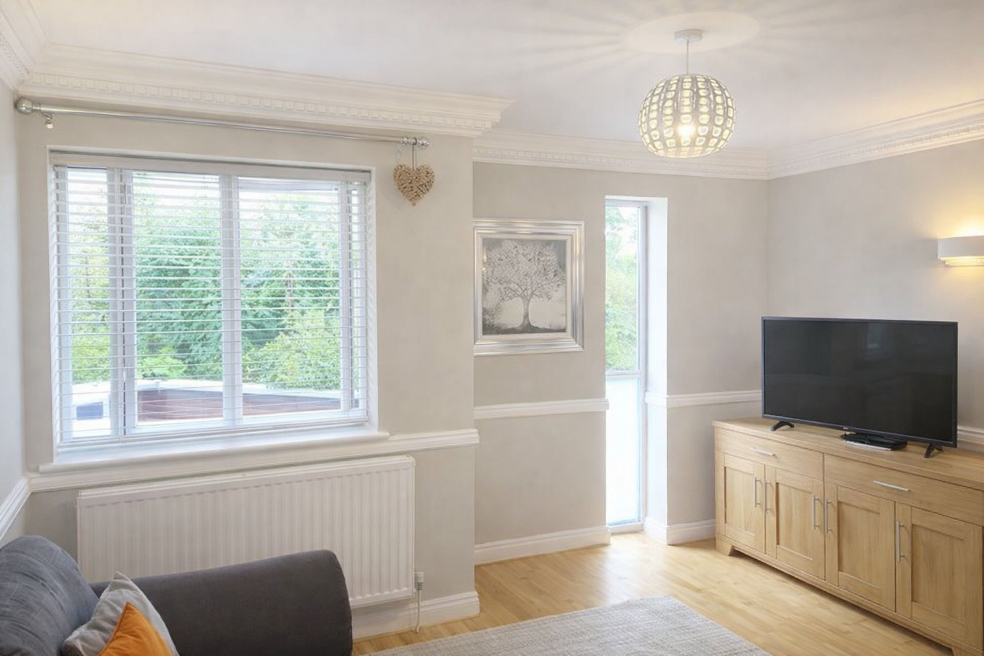 The principal bedroom is a particularly good size and benefits from a balcony, bringing additional light and a welcome outdoor element to the room. It is served by a modern ensuite shower room featuring a large walk-in shower. The second bedroom is well suited for guests or visiting family.