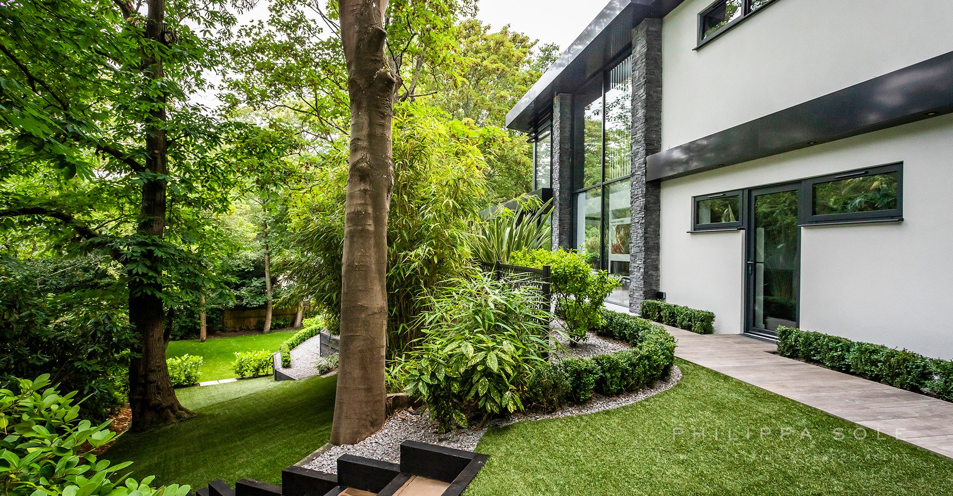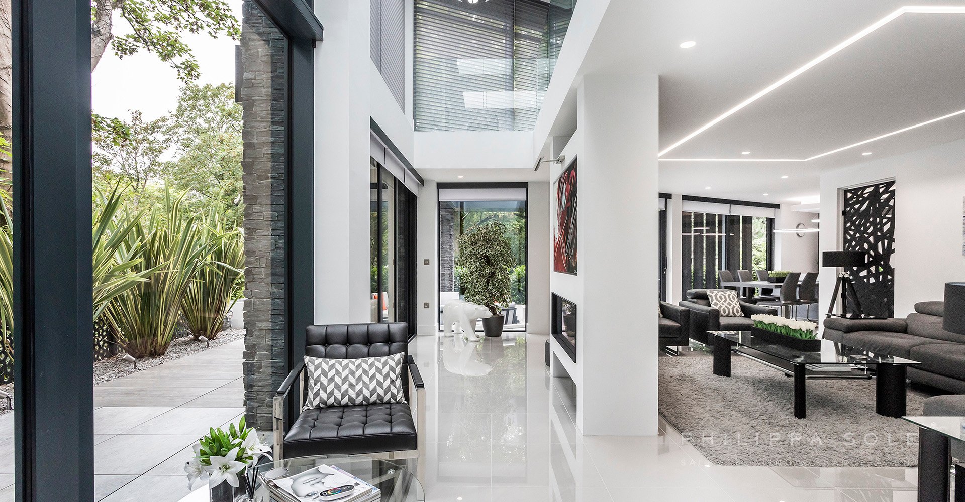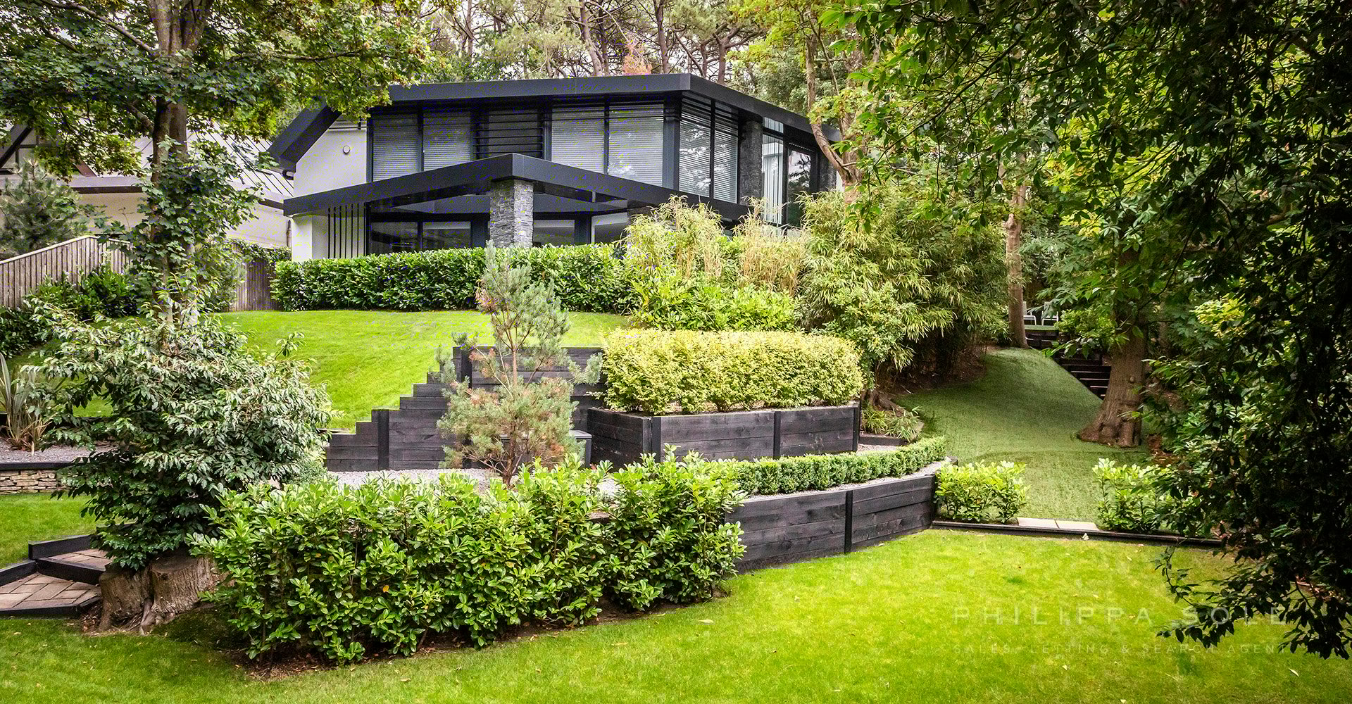 This modern architecturally designed home has been created to encapsulate its surroundings. On entering this home you are immediately struck by the amount of light from its floor-to-ceiling, double height gallery and fully glazed walls. The cleverly designed open plan, ground floor living space flows effortlessly from one space to another. A modern Leicht kitchen blends into surroundings due to the cleverly designed hidden storage. The kitchen/dining area whist being open plan is divided by a contemporary panel from the formal living room which features a floor-to-ceiling dual aspect fireplace. Beyond here is the double height gallery area, ideal as a space to relax whilst embracing the evergreen background beyond from the double height windows. From the kitchen doors you are lead to an impressive and fully equipped state of the art cinema room/snug. The utility room which offers direct access to both the garden and double garage. A floating feature bespoke staircase with internal lighting leads to the first floor. The master bedroom enjoys lovely views from the full height sliding doors and Juliet balcony. The luxurious en-suite shower room is beautifully equipped with a double sink and walk in shower. Beyond this is the fully equipped dressing room overlooking the garden. There are two further guest suites (one with a walk-in wardrobe) and en-suite shower rooms. From the landing, you are lead to a stunning open plan galleried study/library which overlooks the floor-to-ceiling relaxation area below. The garden has been designed to be an extension of the house with access from the kitchen and living area via full height sliding doors. The fully tiled patio area provides an ideal space in which to entertain with a cleverly designed pergola. A bespoke water feature combined with the luscious evergreen planting surrounding this area provide privacy and seclusion. Adjacent to the utility room and garage is a level area of Faux lawn and from here, sleeper steps provide access to the remainder of the garden which gently slopes until it reaches a further level area. A private gate which gives access to Branksome Beach in under 250 steps.