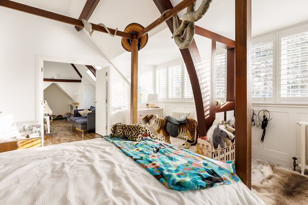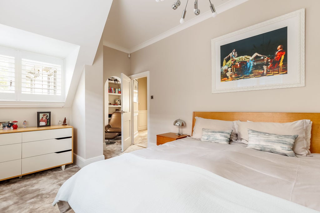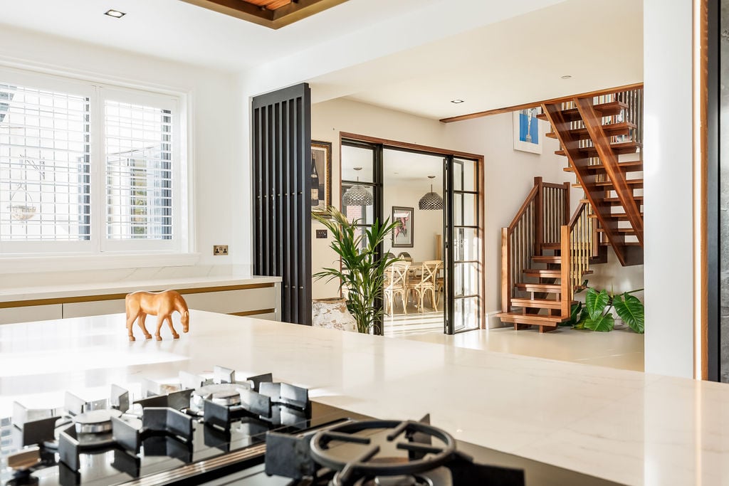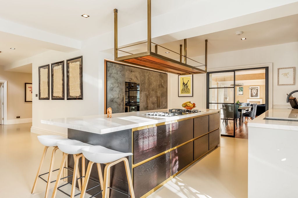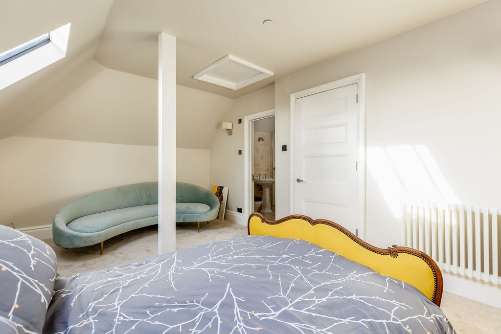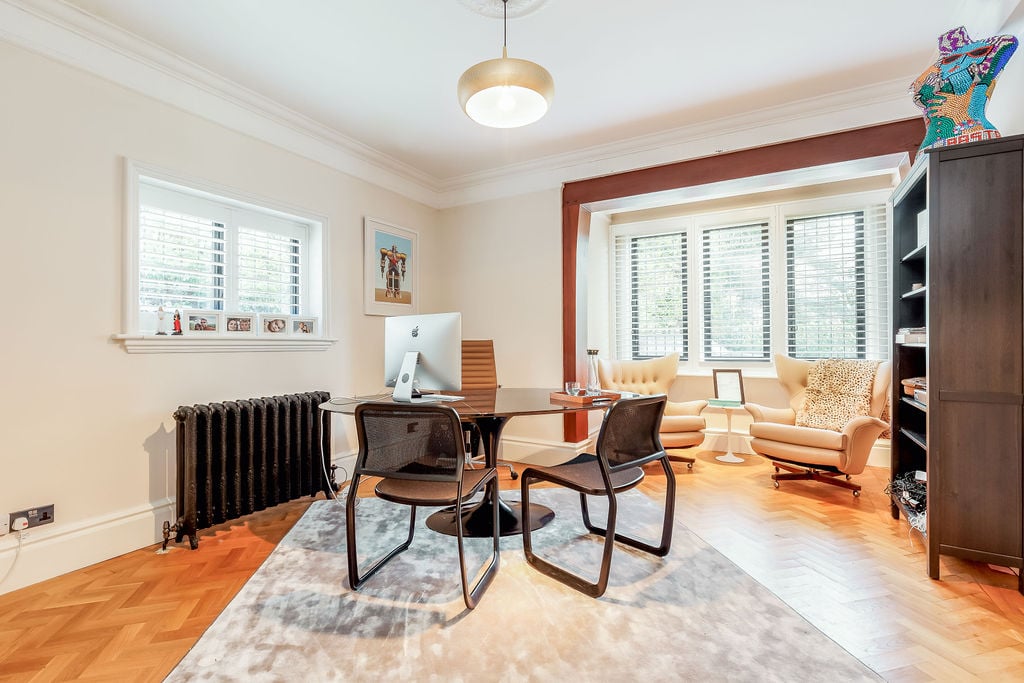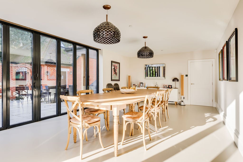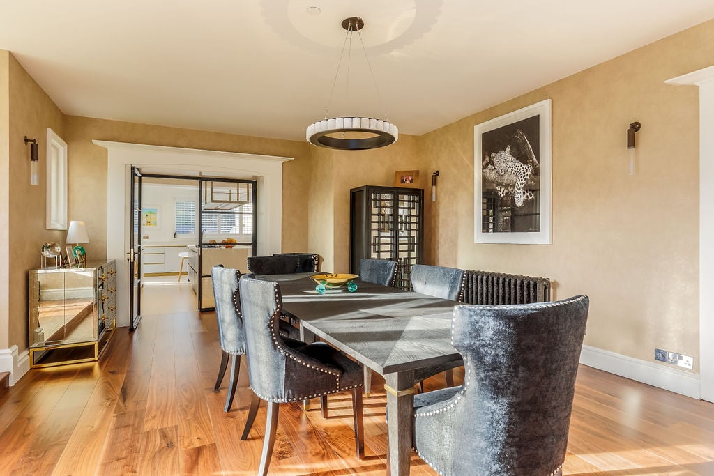As the hallway draws you through to the west side of the house, you can't help but run your hand over the impressive and skilfully crafted black walnut & copper spindle 'secondary' staircase. Turning into the main kitchen area, the summer dining room at the rear of the property features 2-sides of bi-fold doors that open onto the garden patio giving both inside and alfresco dining options. The super stylish artisan Smallbone kitchen is true to its promise "Born from Passion, defined by Craft" and presents a mix of visually and tactilely pleasing finishes - all uniquely different but together a perfect blend. The talent for interior design continues through another set of Crittall doors into the 'winter' dining room, which is open plan with a second lounge. Sofas feature around a fireplace showcasing stained glass windows either side, perfect for retiring to after dinner. Two sets of doors lead directly out onto the south side of the garden giving lovely green vistas as you dine and relax. A separate catering kitchen, utility room, downstairs shower room and spacious office boasting a large bay window and original herringbone parquet floor, completes the ground floor.
