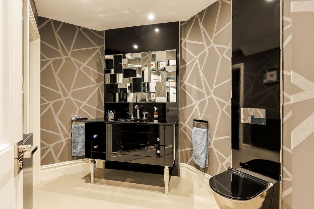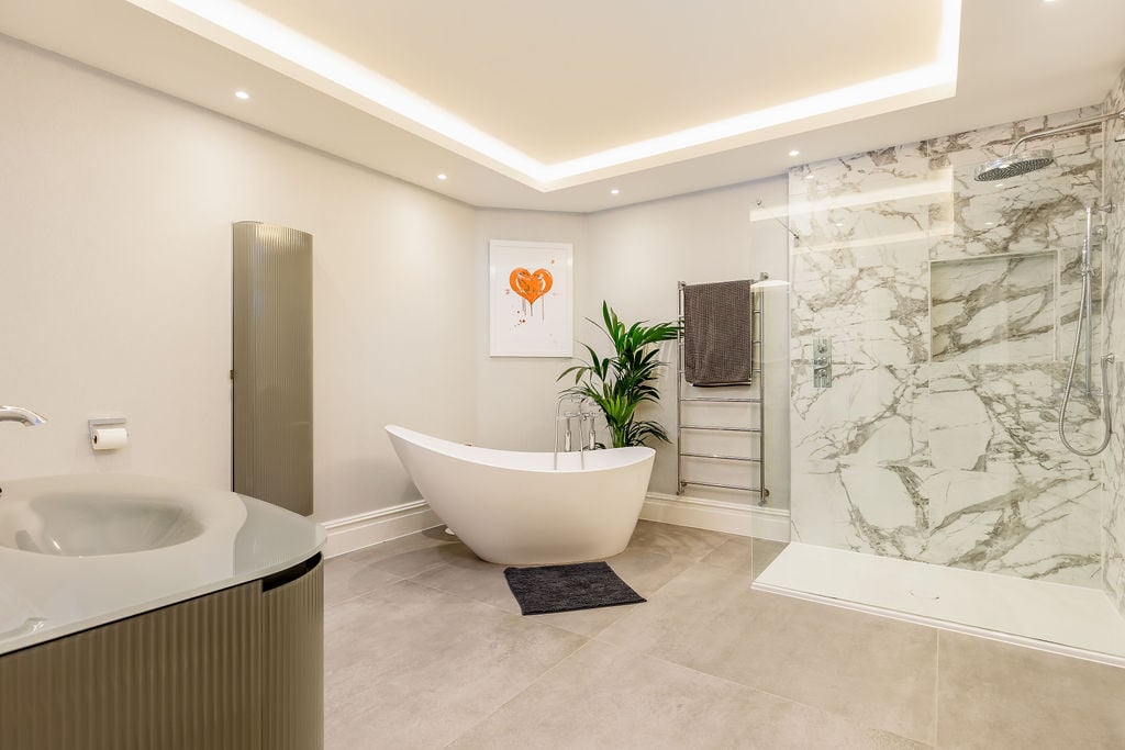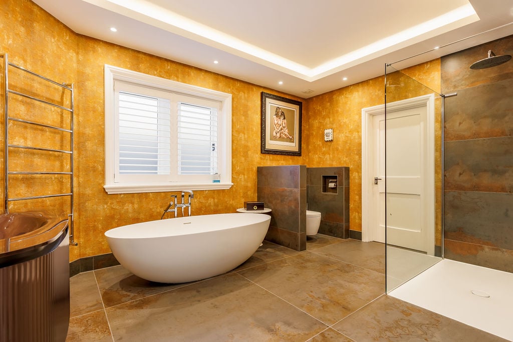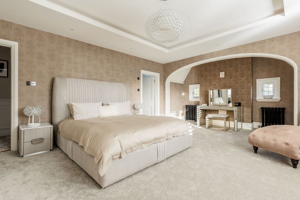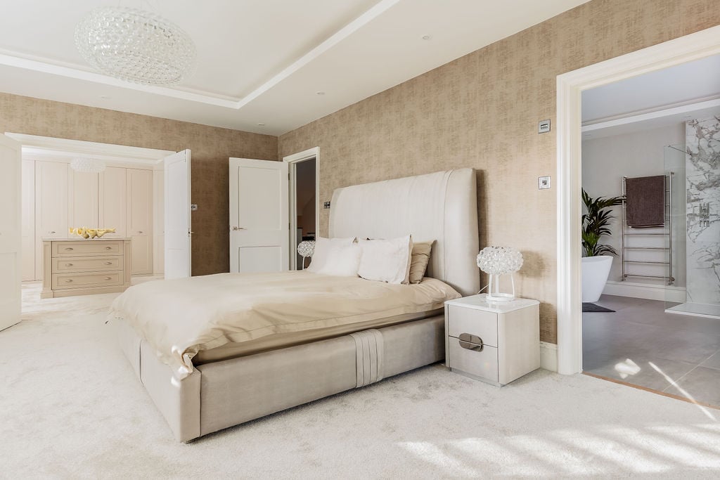 Modern Regency paneling lines the main staircase to the upper two floors where there are 5 spacious bedroom suites, all featuring luxury furnishings and ensuite bathrooms. The principal bedroom and adjacent dressing room comprises a huge 42 sq.m. Textured wallpaper feature in this and many other rooms adding to the opulence of the home. An original 'staff' staircase leads up to a vaulted gallery / studio / games room running the full length of the house. Above the double garage is a separate living Annex with its own entrance, kitchenette and bathroom. Please note there is an additional Band A council tax charge for the Annex.