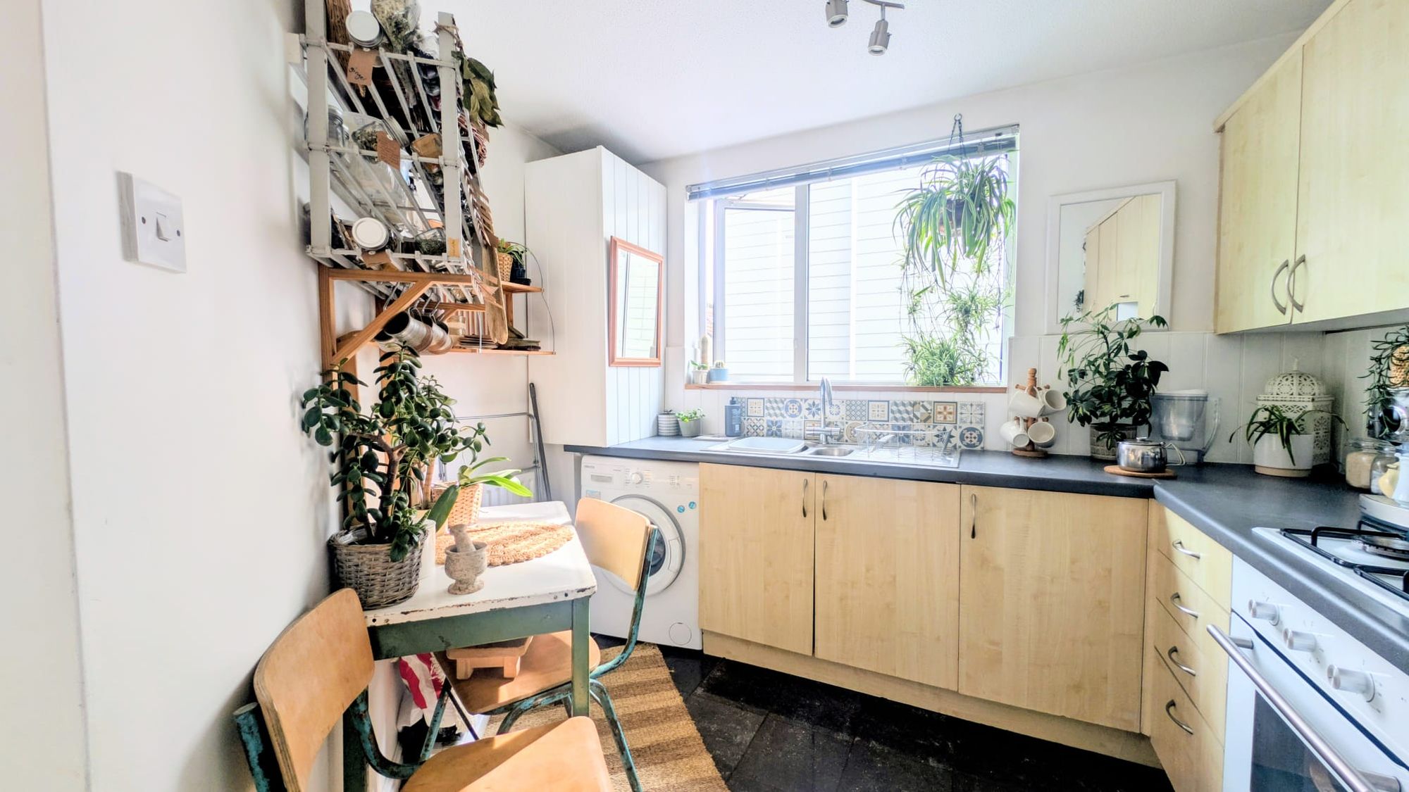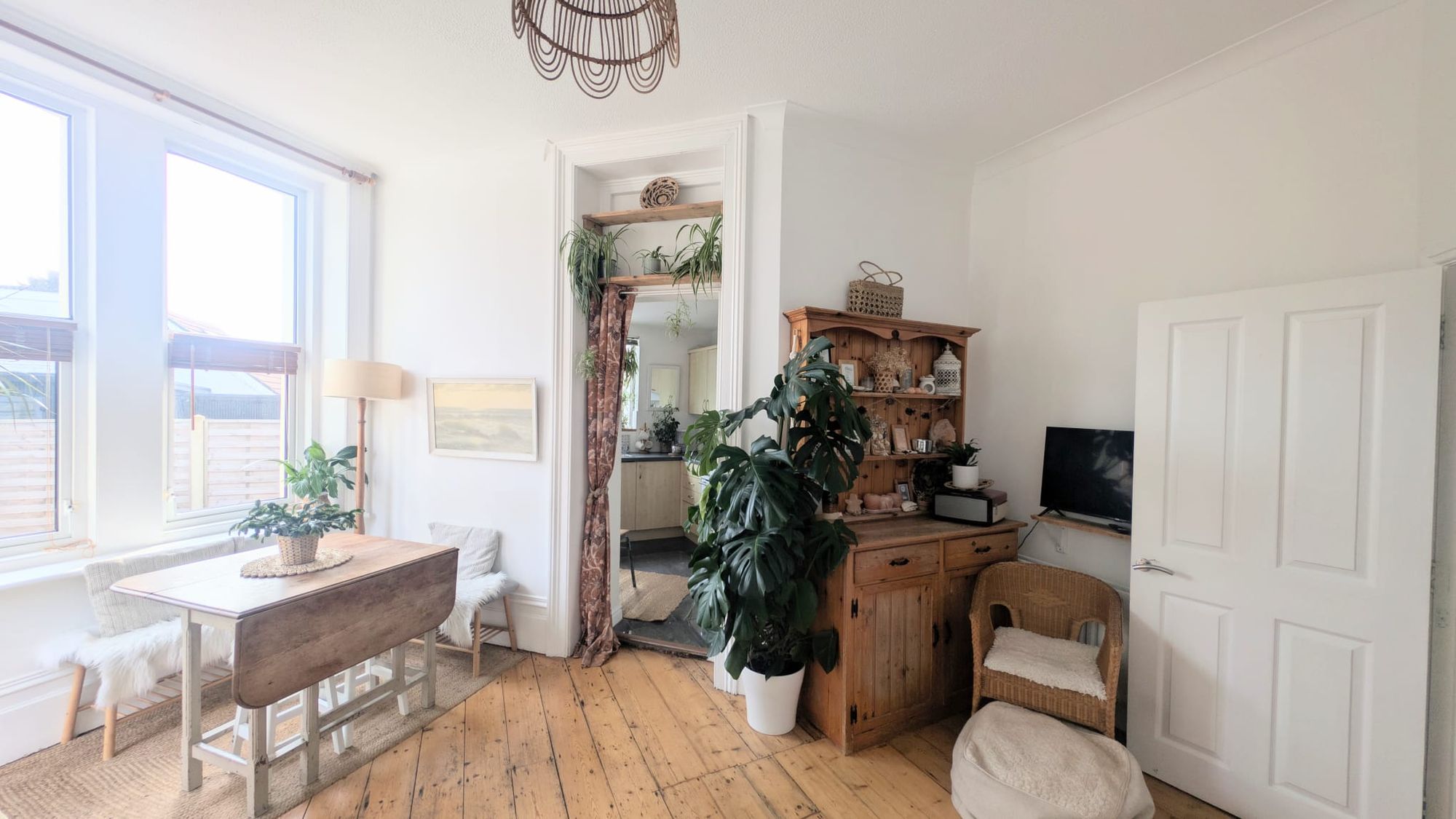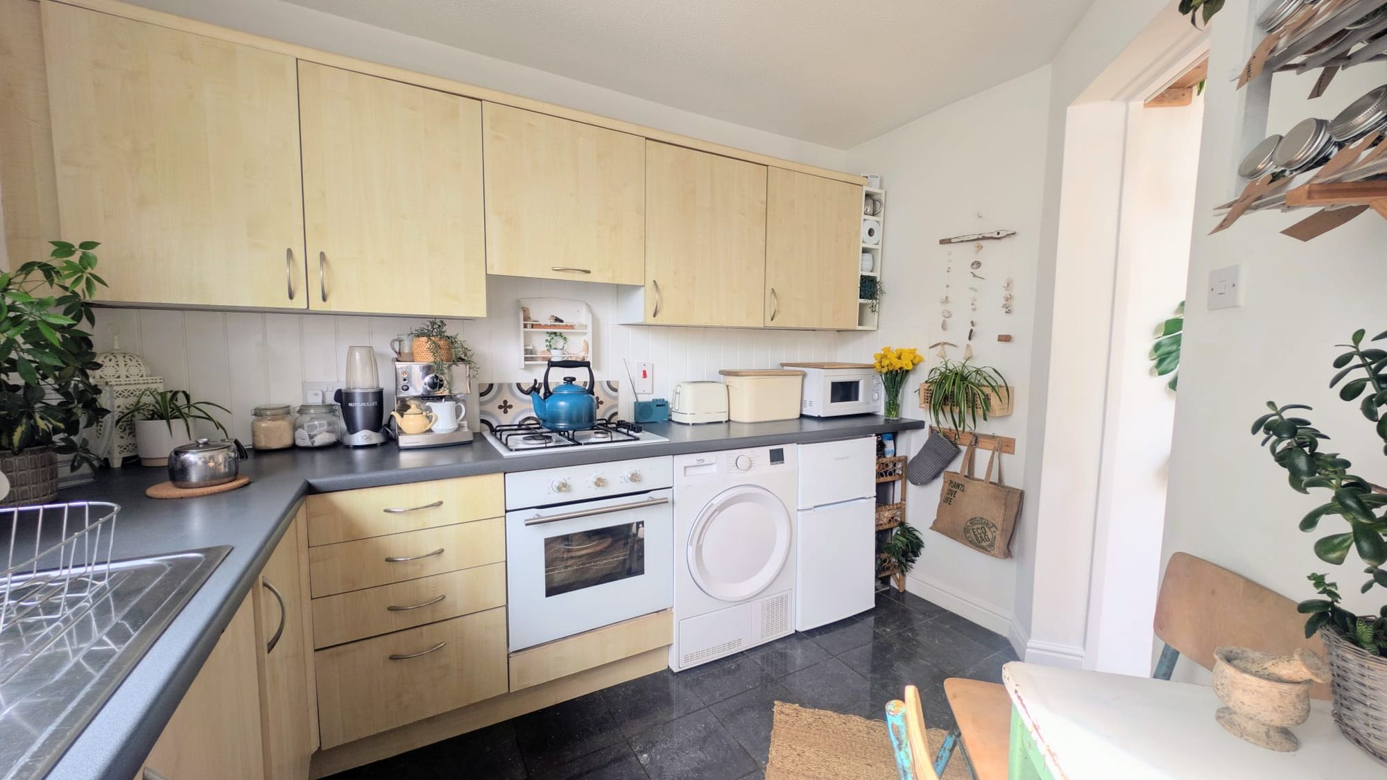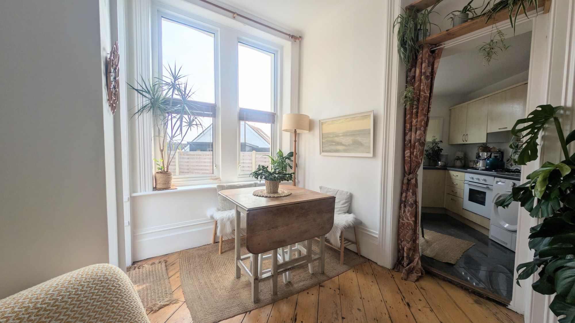 Adjacent to the main living area, the kitchen is arranged for ease rather than excess. A fitted gas hob anchors the space, with room for a small dining table creating a natural spot for informal meals. Freestanding appliances are currently in place, with inclusion to be agreed. The overall arrangement supports day-to-day functionality without interrupting the openness of the room.