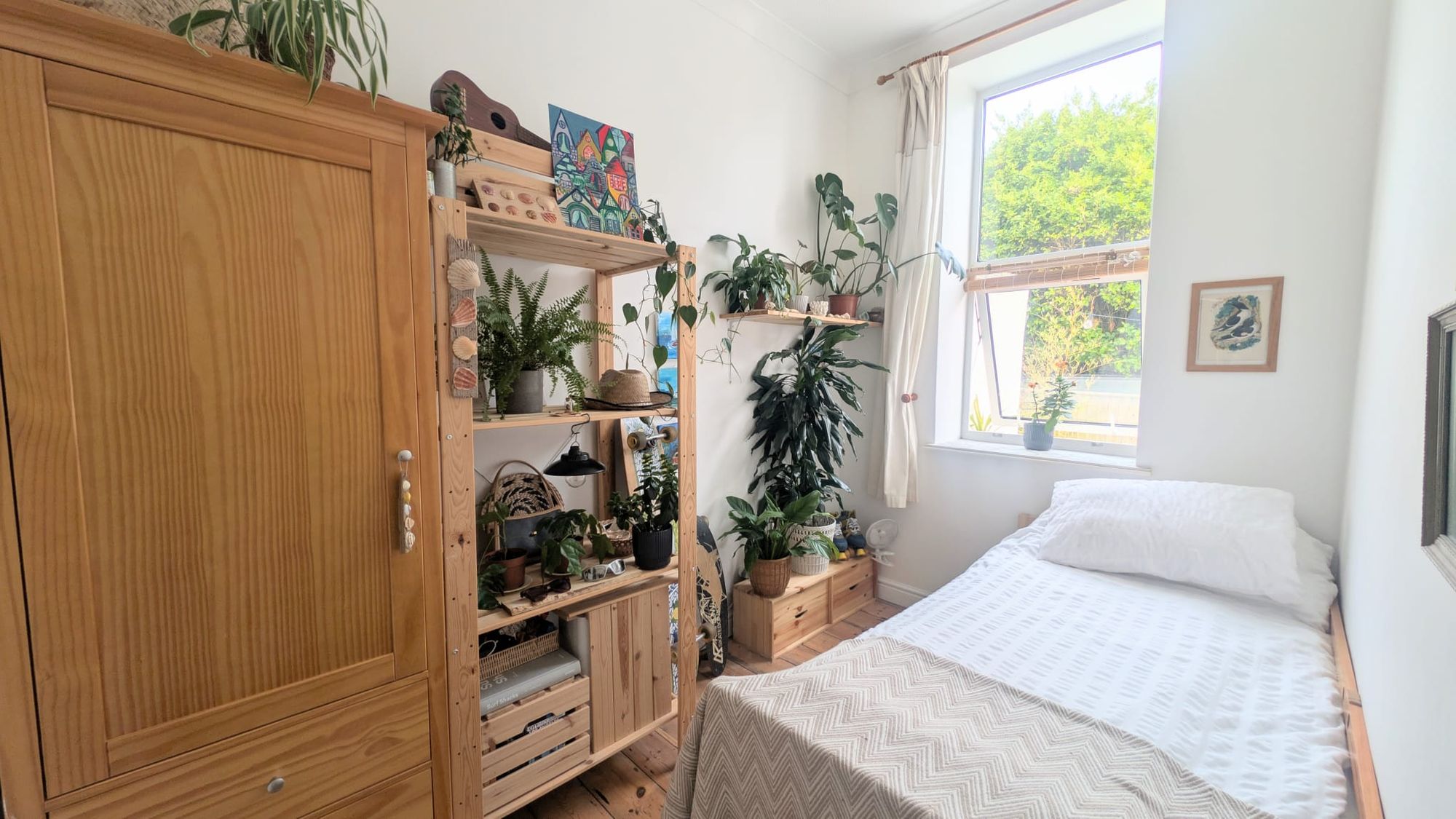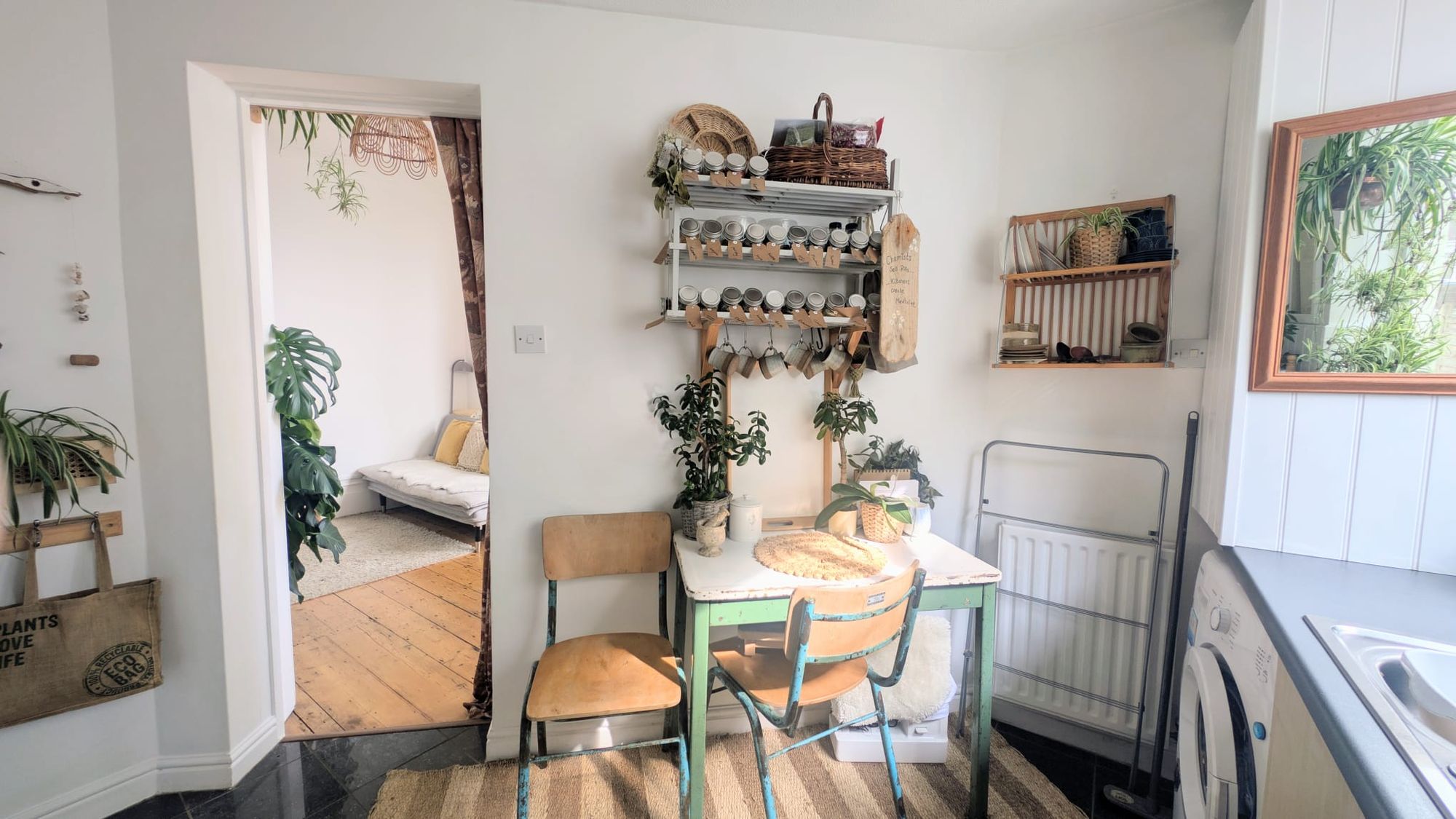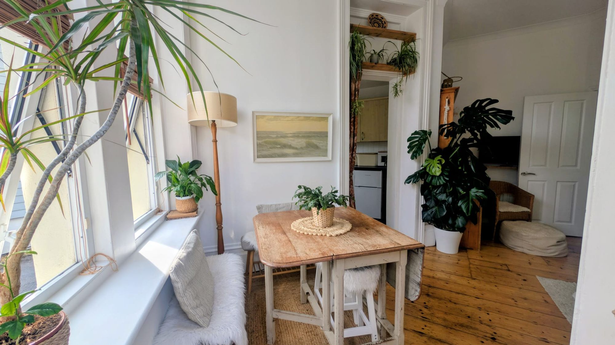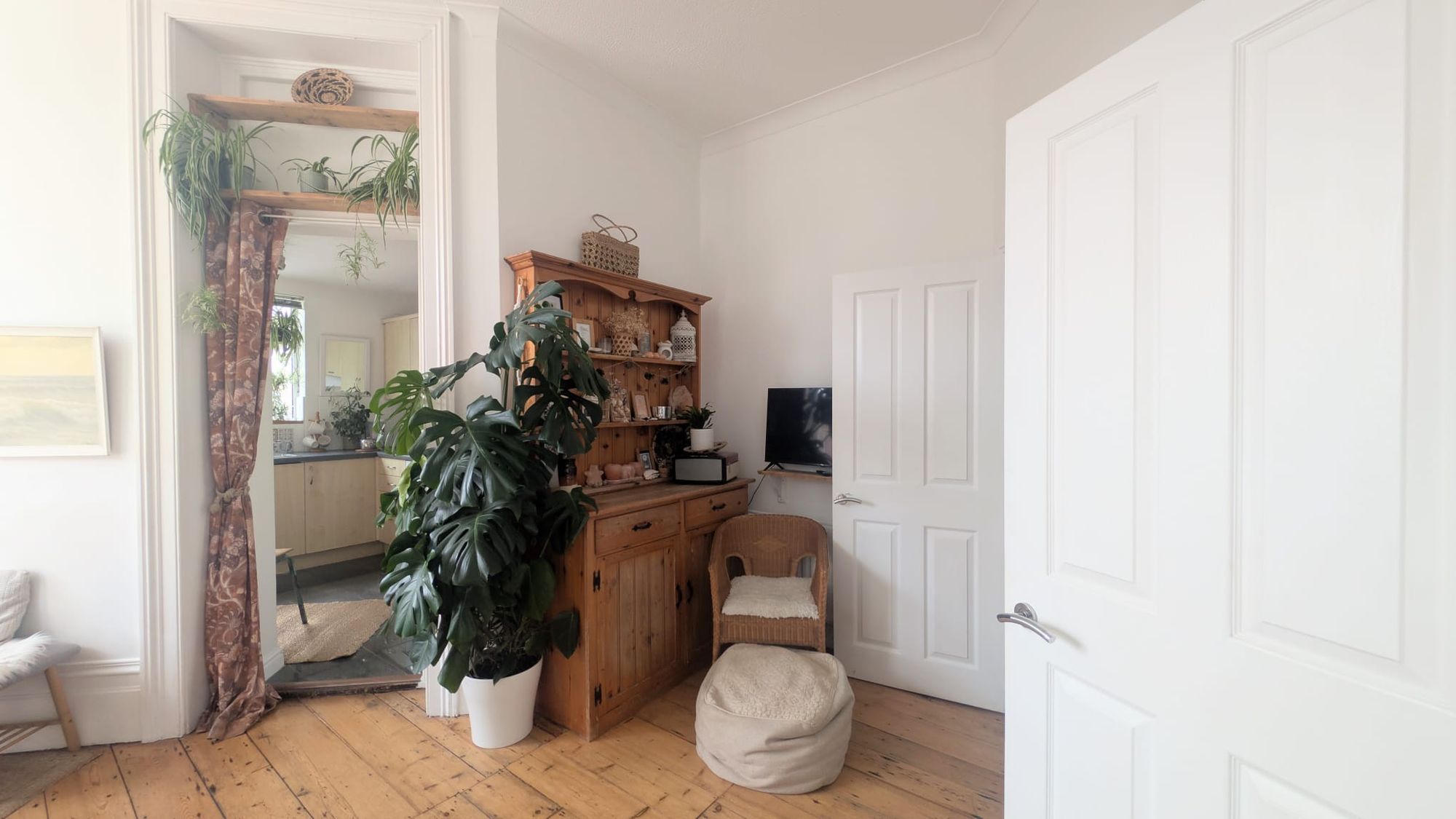 Adjacent to the main living area, the kitchen is arranged for ease rather than excess. A fitted gas hob anchors the space, with room for a small dining table creating a natural spot for informal meals. Freestanding appliances are currently in place, with inclusion to be agreed. The overall arrangement supports day-to-day functionality without interrupting the openness of the room.