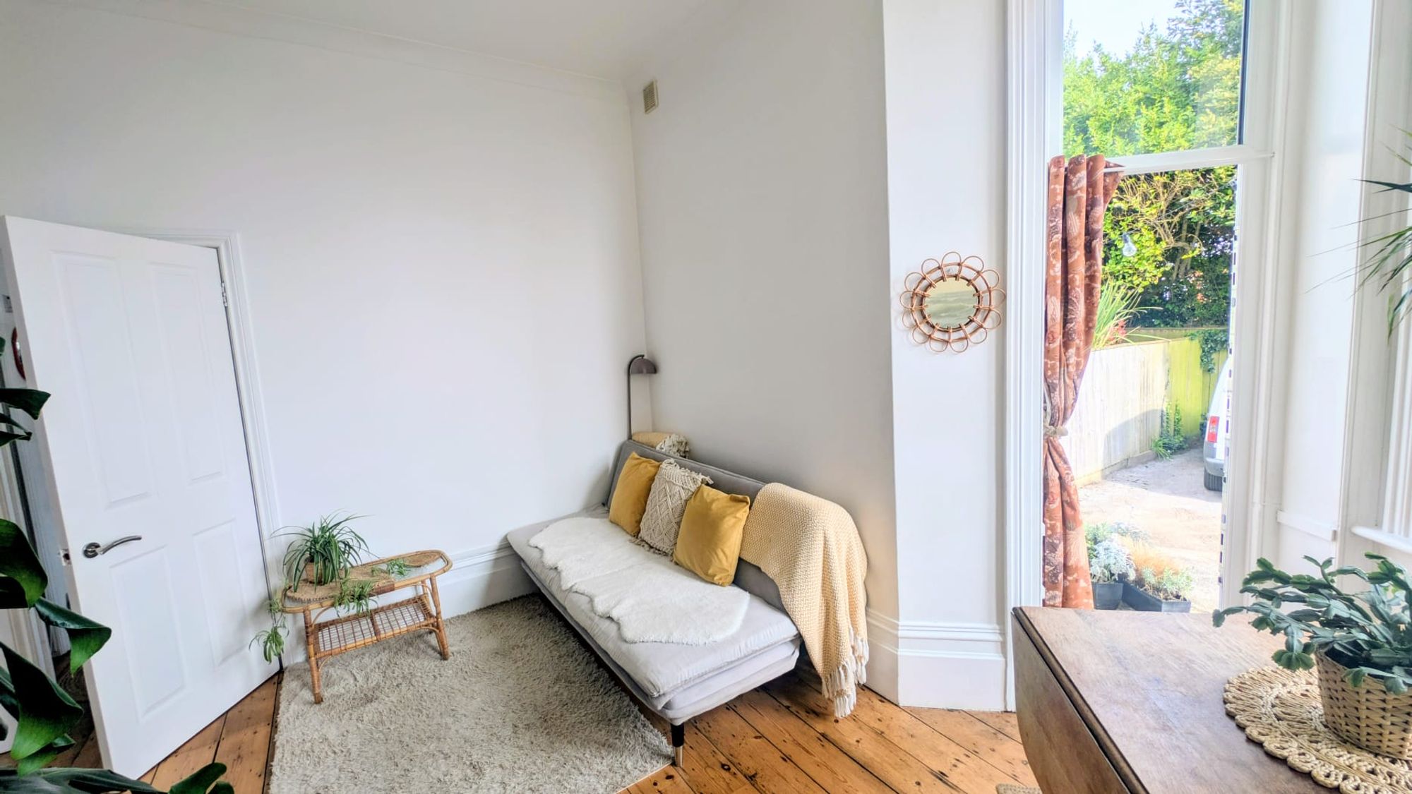 The living area carries the architectural tone of the apartment. Stripped floorboards, deep skirting and ceiling height give the space presence, while the proportions allow for flexible furnishing. Connection to the courtyard introduces an element of outdoor access not typically associated with apartments of this style.