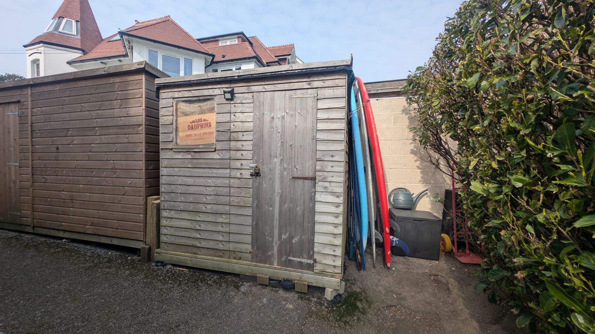 A small communal courtyard sits directly off the living space, with a larger shared garden positioned to the rear of the building. A separate storage shed provides useful external storage. Allocated parking and own entrance.